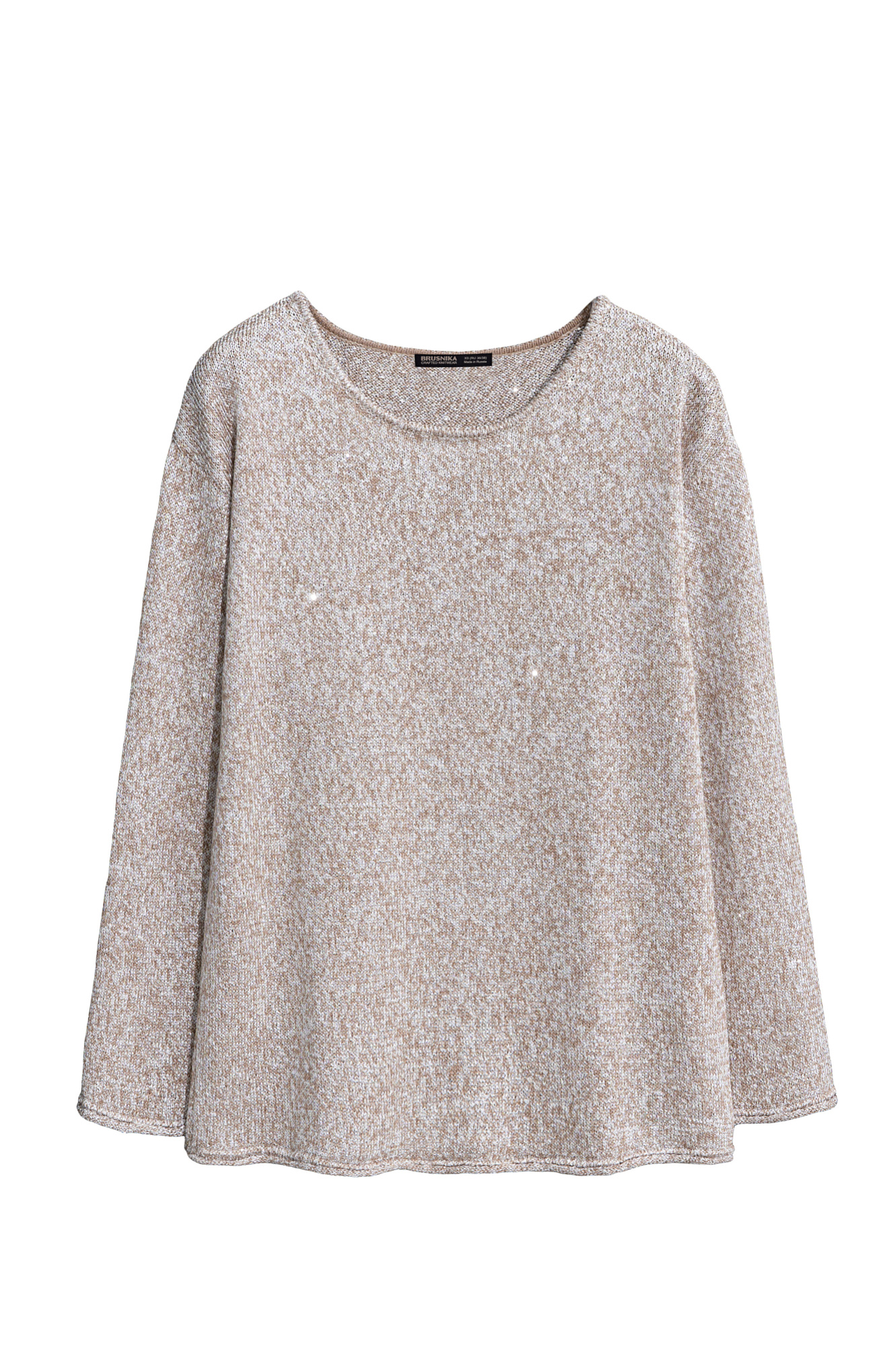 Трикотажный джемпер из хлопка с пайетками и люрексом. Модель свободного силуэта с длинными рукавами и круглым вырезом горловины.