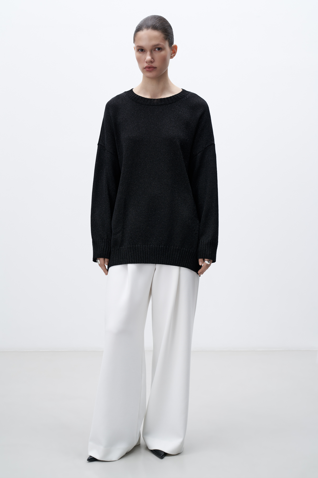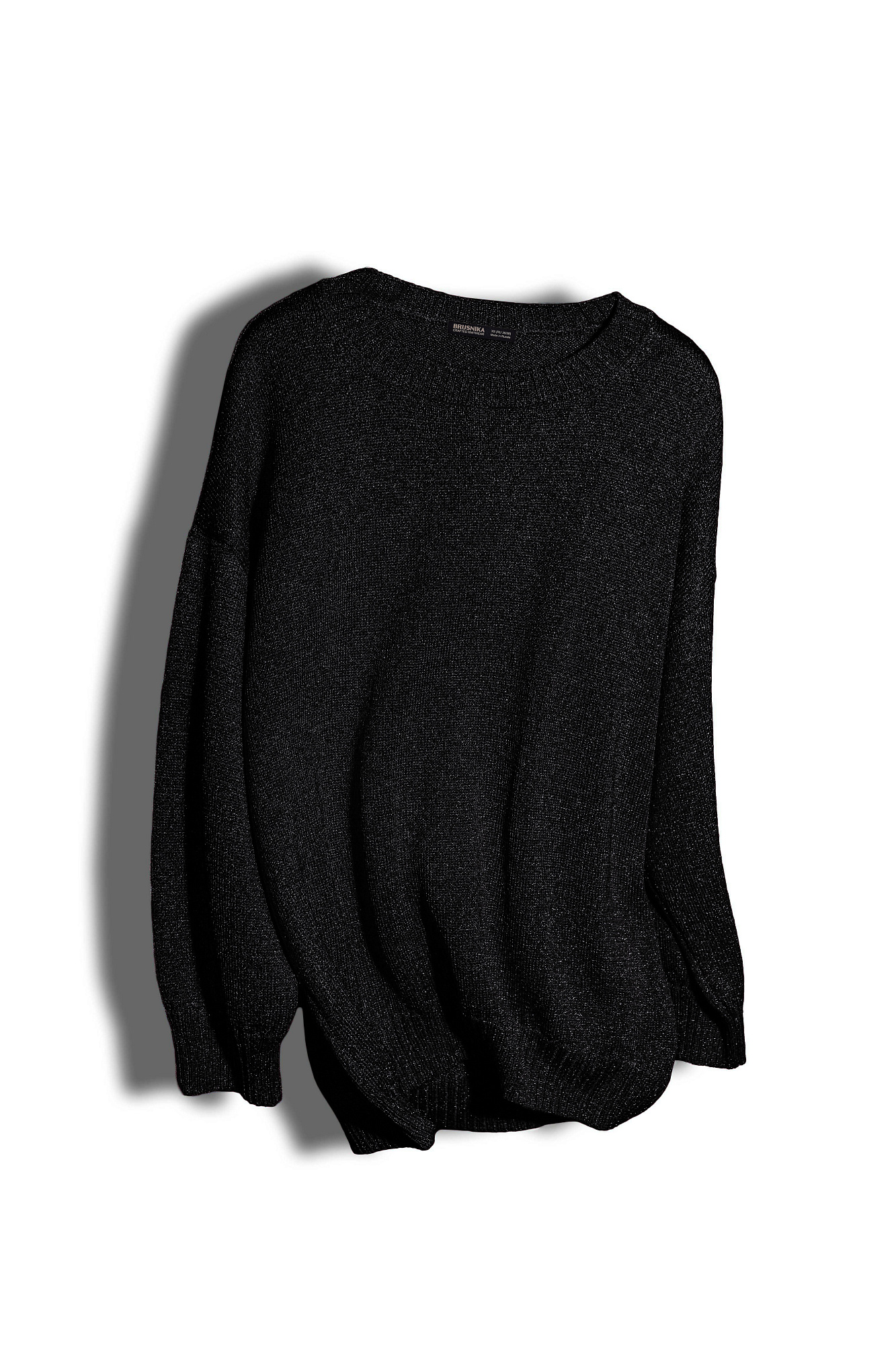 Трикотажный удлиненный джемпер из вискозы с люрексом. Модель свободного силуэта со спущенной линией плеча и круглым вырезом горловины. Края изделия в рубчик.