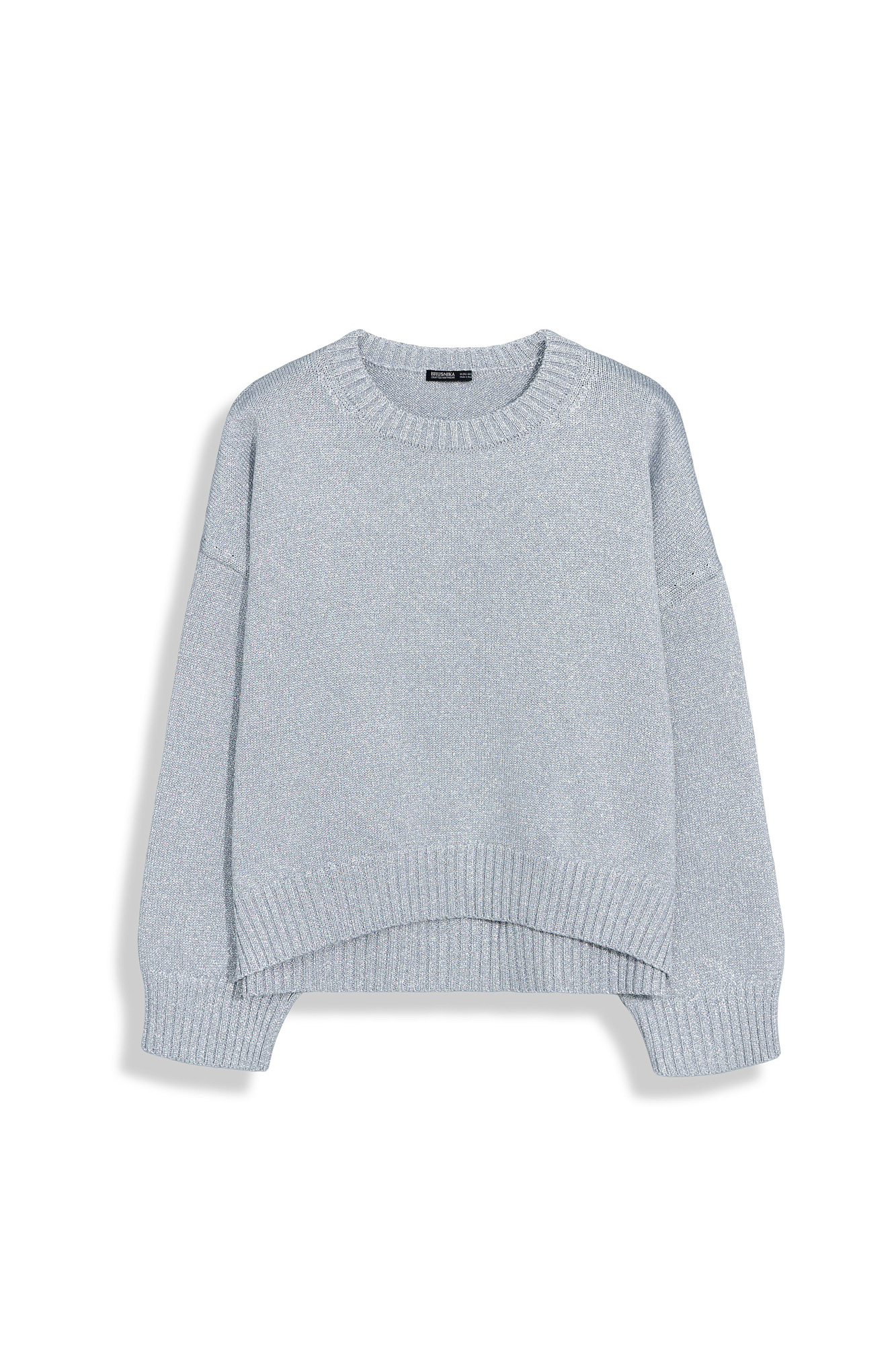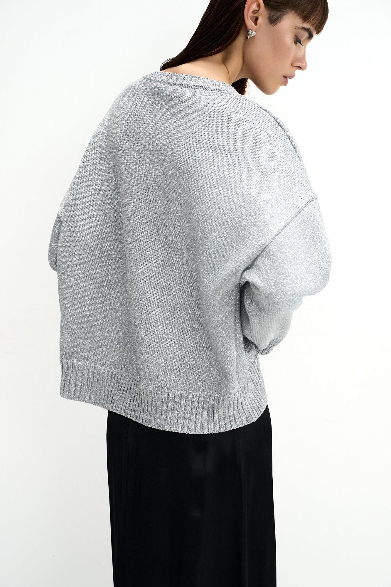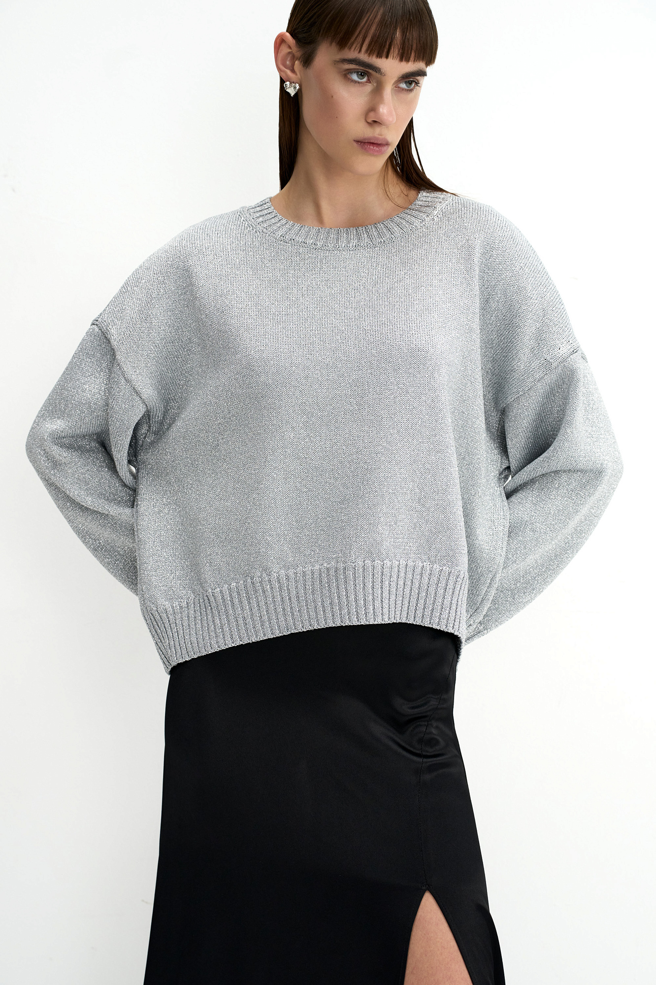 Трикотажный джемпер свободного силуэта со спущенной линией плеча и круглым вырезом, декорирован рубчиком по краям. Изделие выполнено из материала с эффектом металлического блеска.