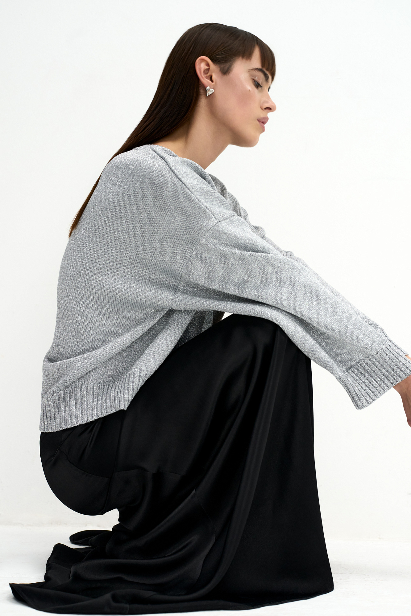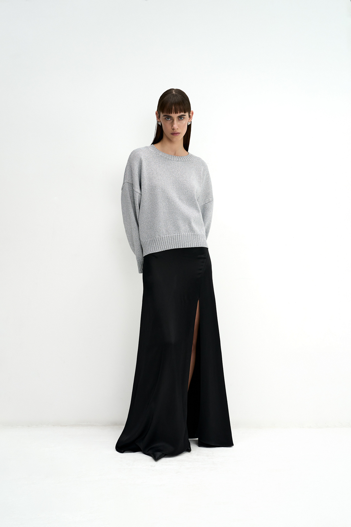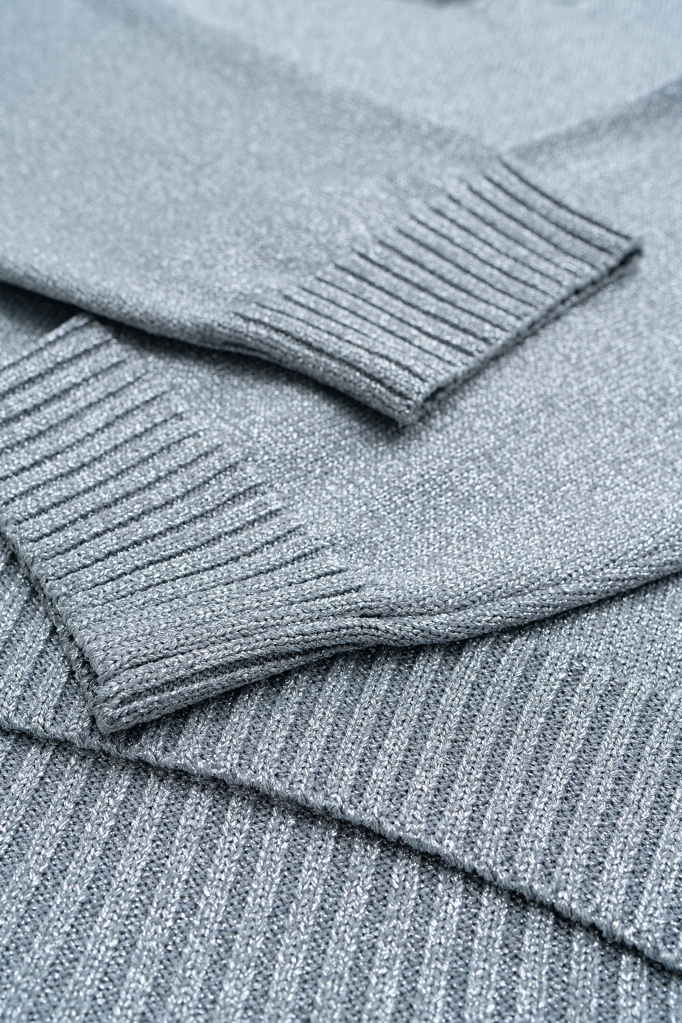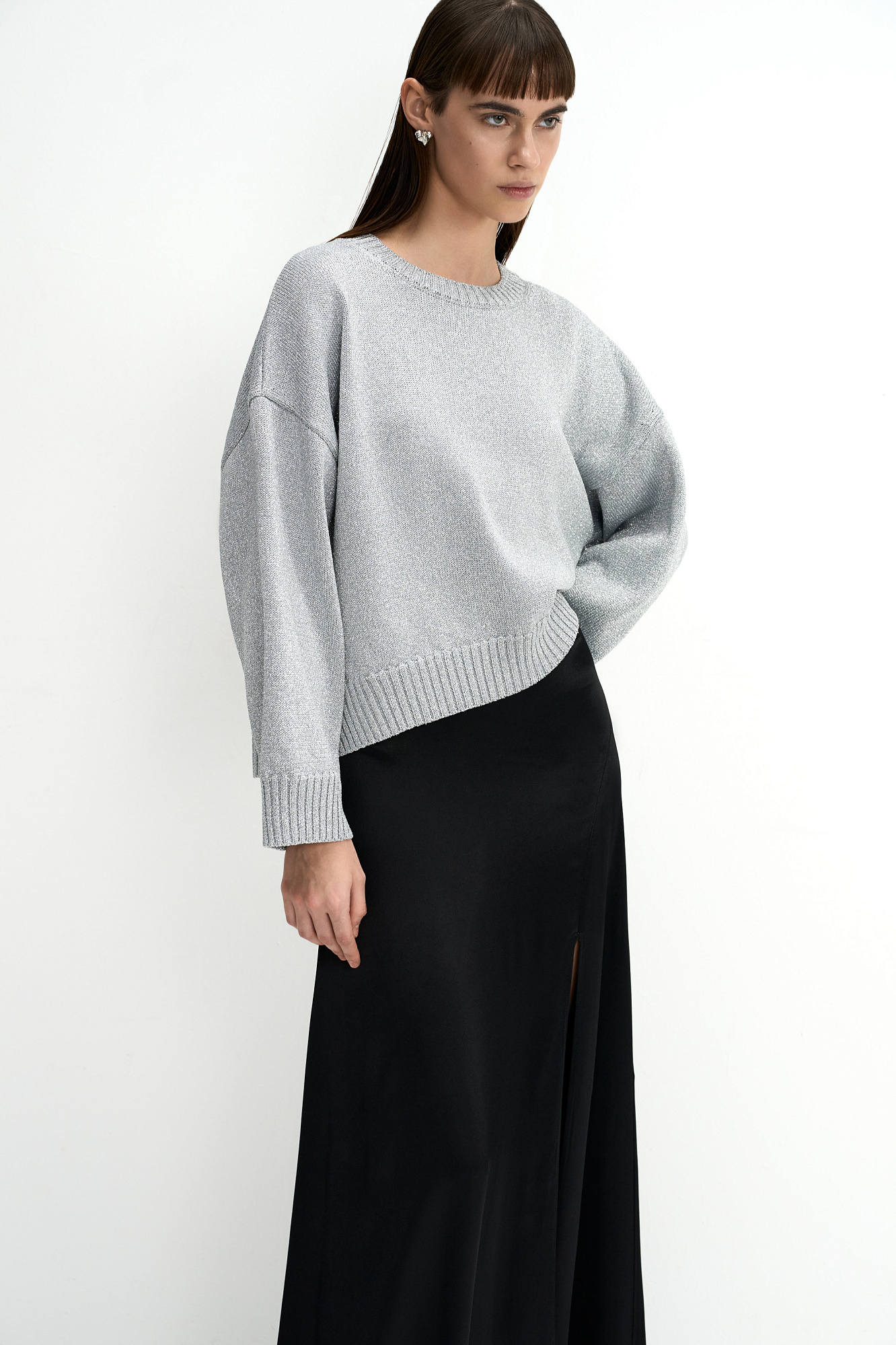 Трикотажный джемпер свободного силуэта со спущенной линией плеча и круглым вырезом, декорирован рубчиком по краям. Изделие выполнено из материала с эффектом металлического блеска.