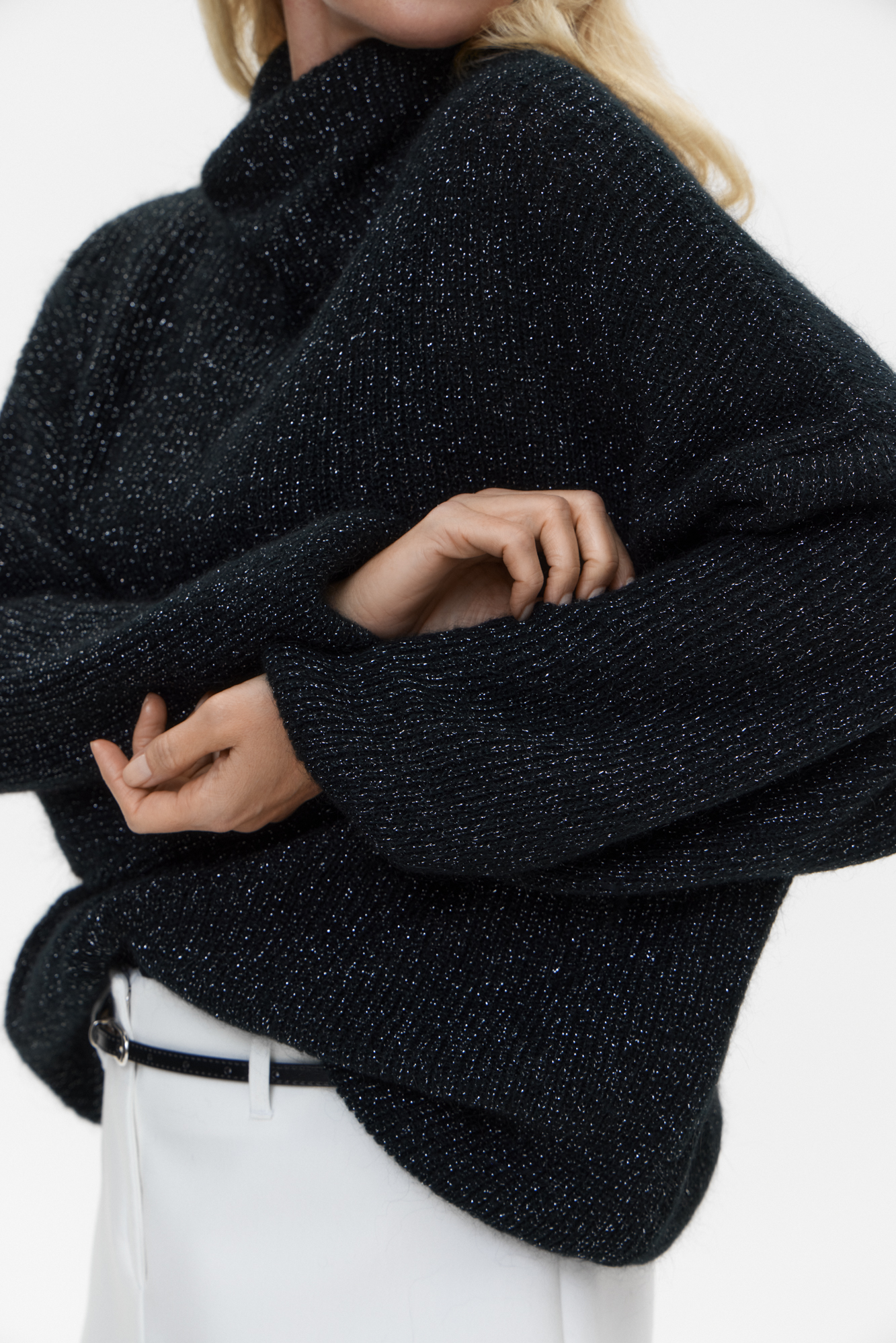 Трикотажный джемпер с люрексом. Модель свободного силуэта со спущенной линией плеча и вывязанным воротником.
