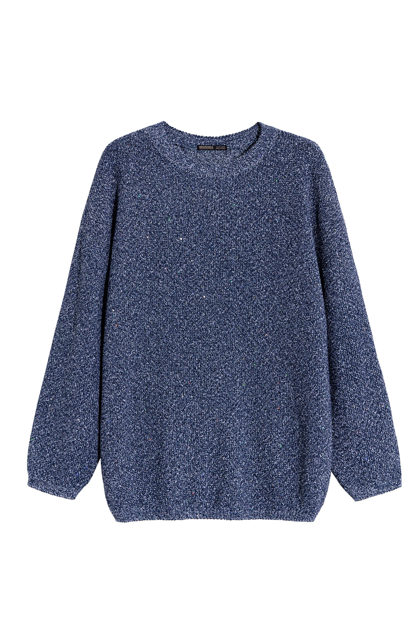 Трикотажный джемпер с голографическими пайетками. Модель свободного силуэта со спущенной линией плеча и круглой горловиной. Дополнить образ можно юбкой в таком же стиле.