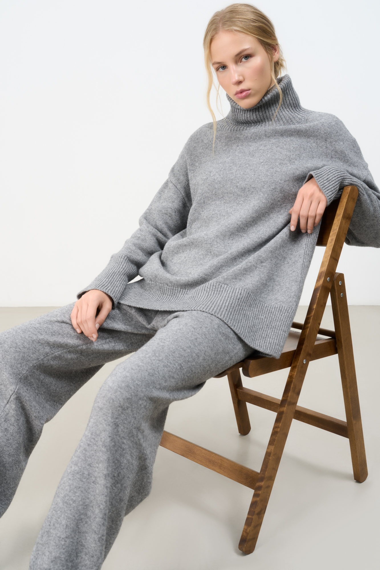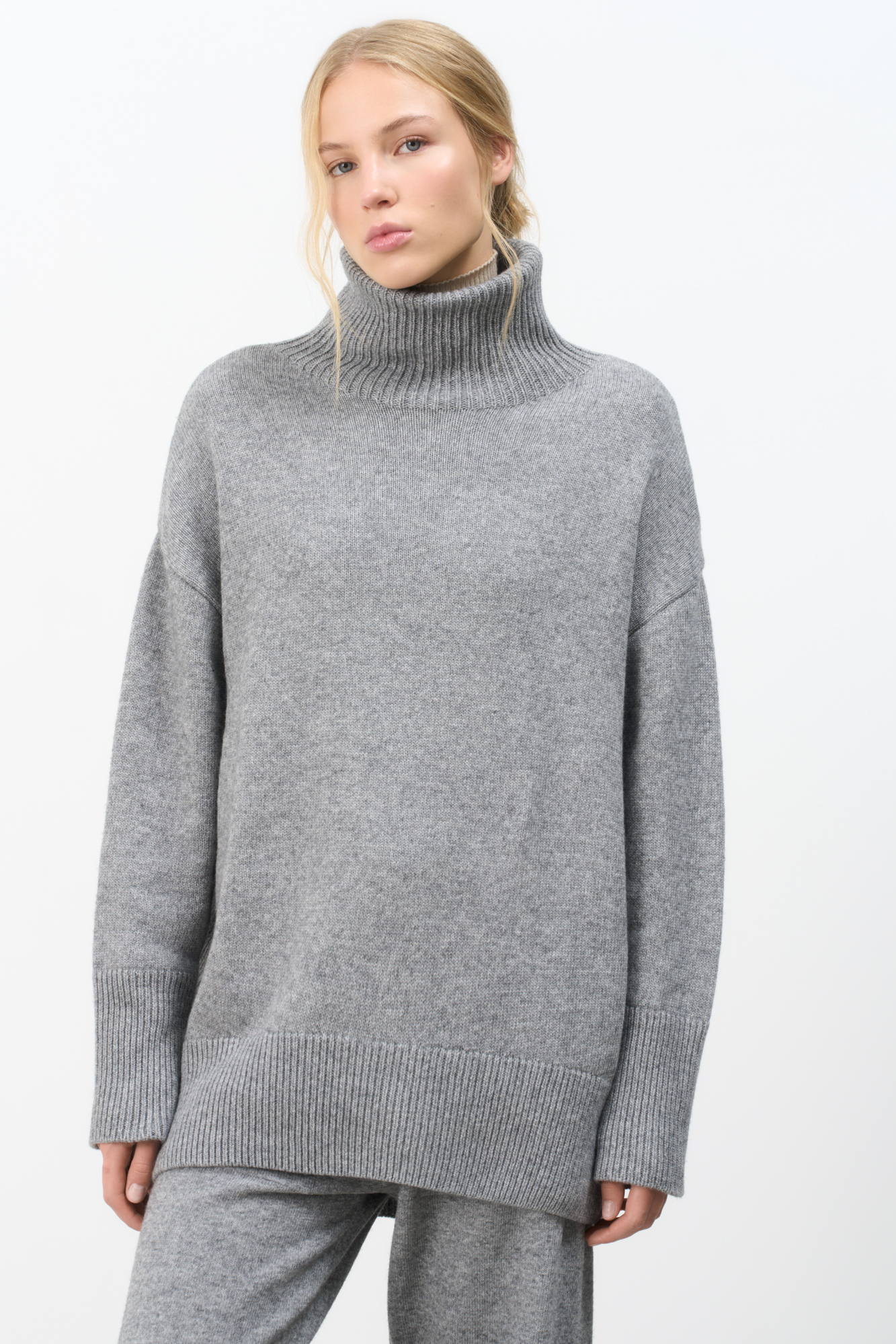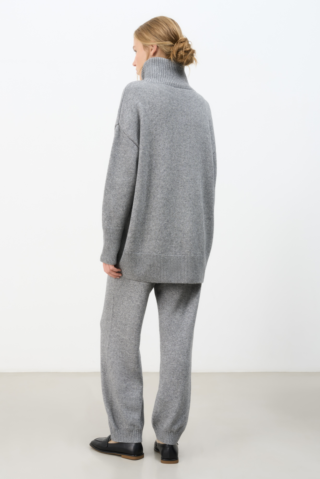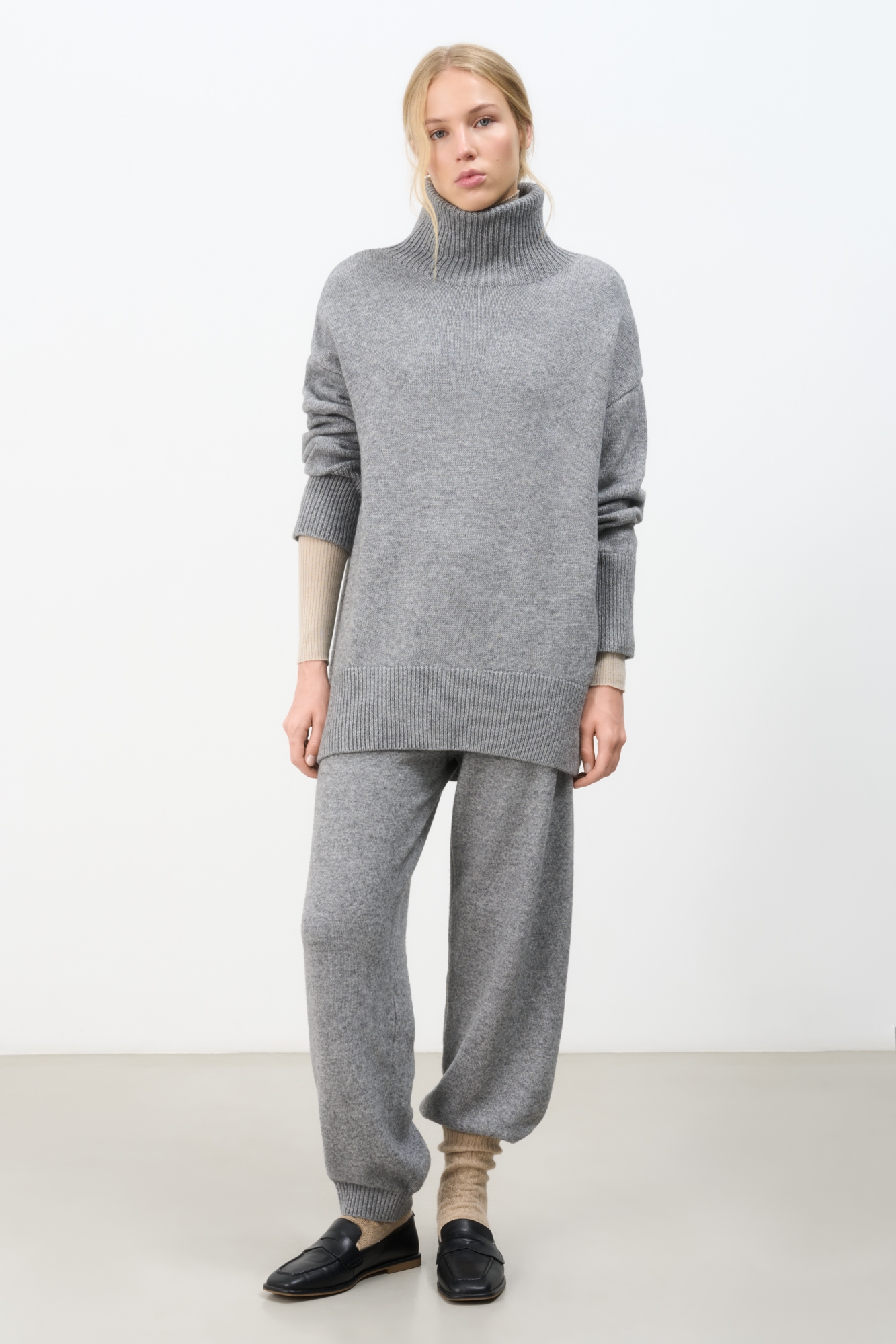 Трикотажный джемпер из мягкой шерсти с добавлением кашемира. Высокий ворот, заниженная линия плеч, удлиненная спинка. Края изделия сделаны в широкий рубчик. Можно дополнить комплектными брюками.