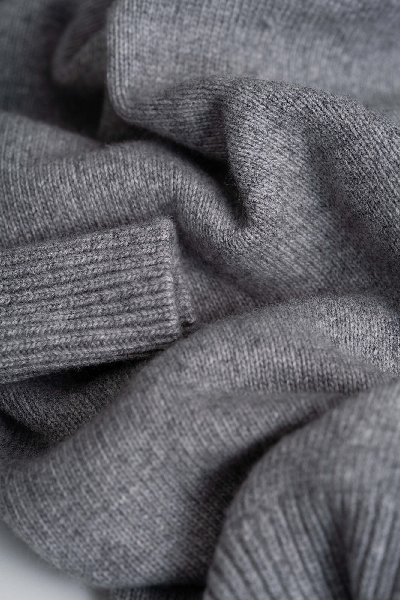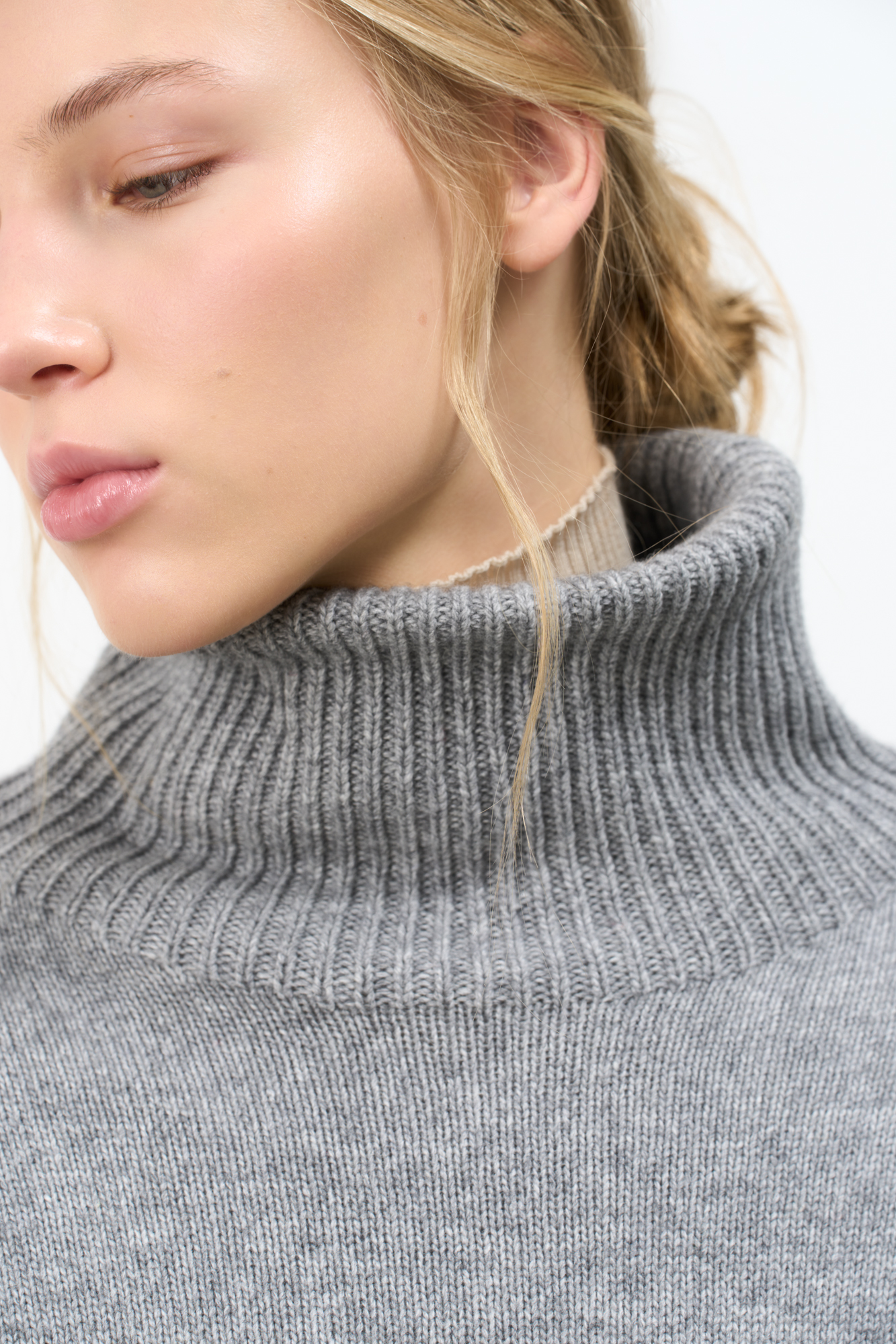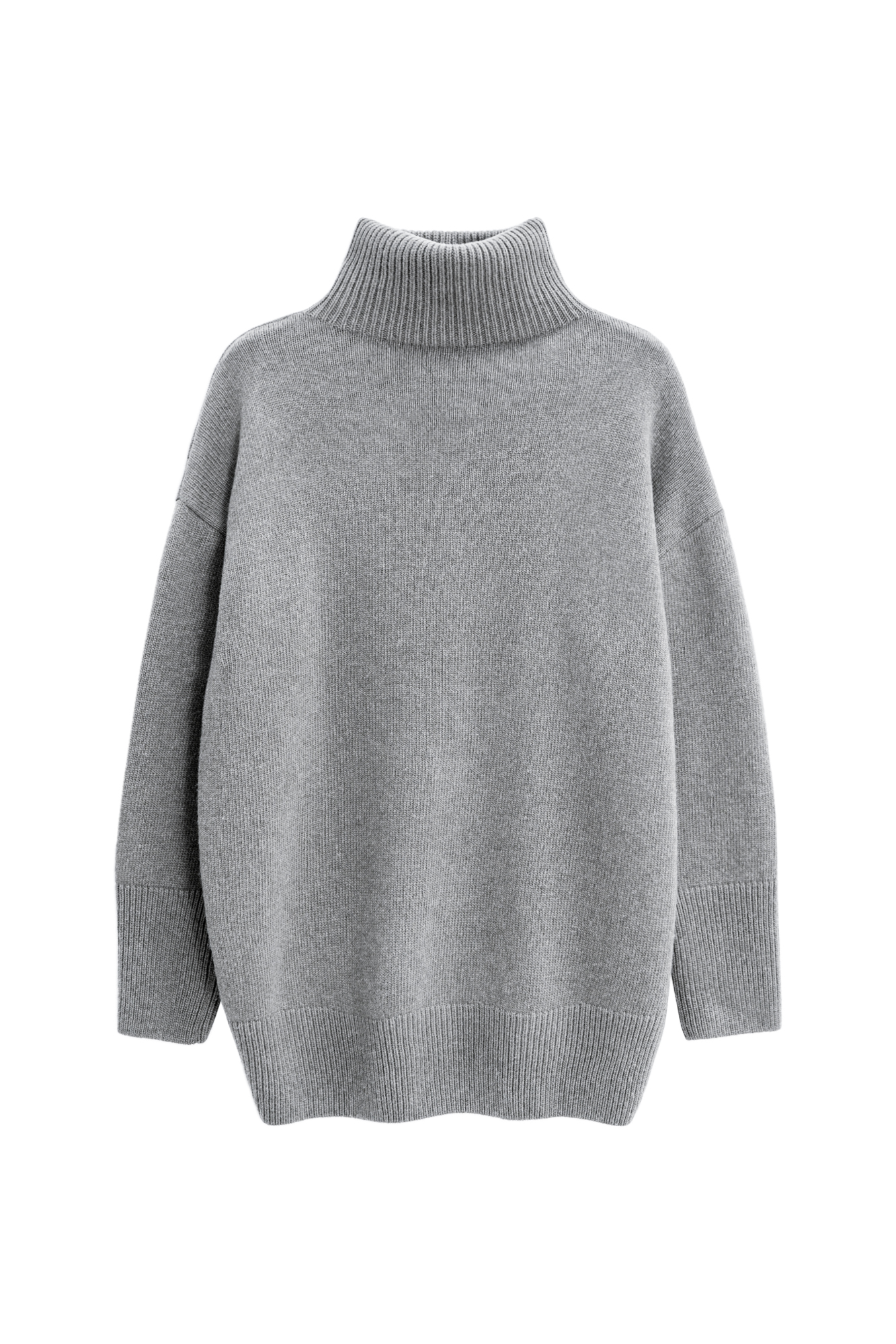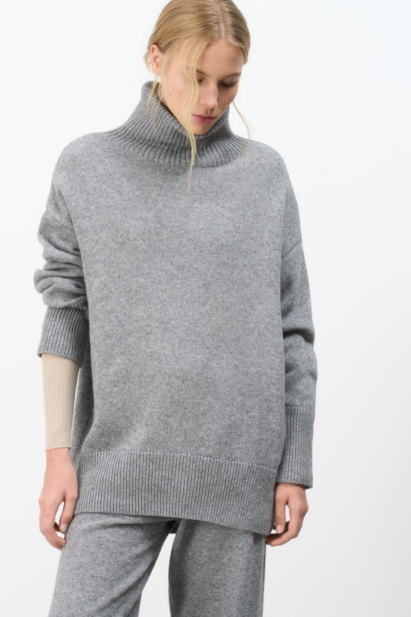 Трикотажный джемпер из мягкой шерсти с добавлением кашемира. Высокий ворот, заниженная линия плеч, удлиненная спинка. Края изделия сделаны в широкий рубчик. Можно дополнить комплектными брюками.