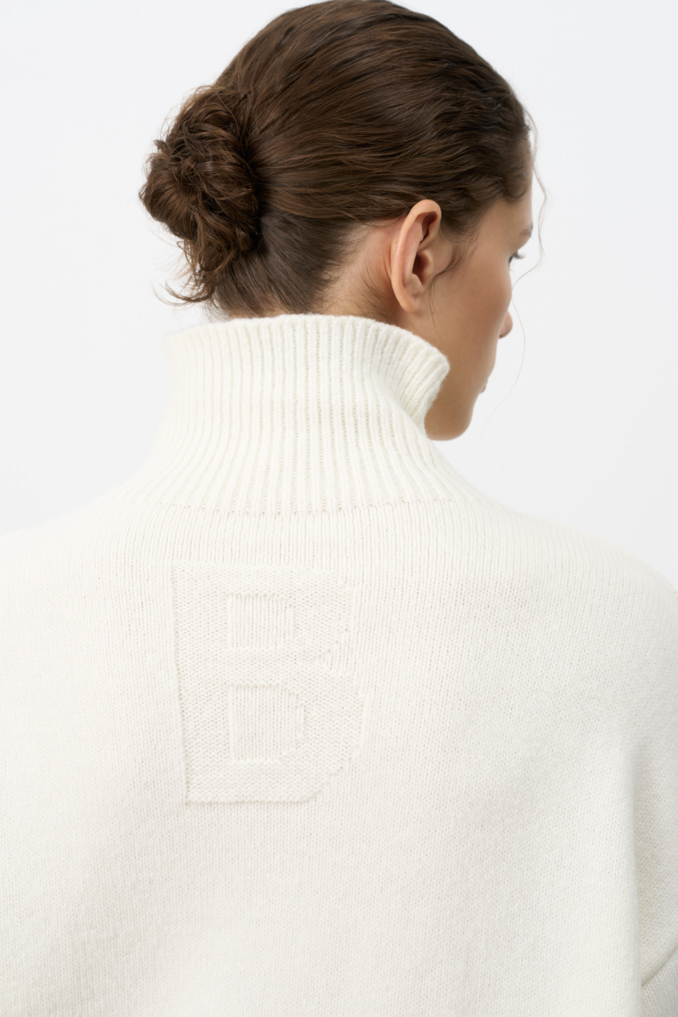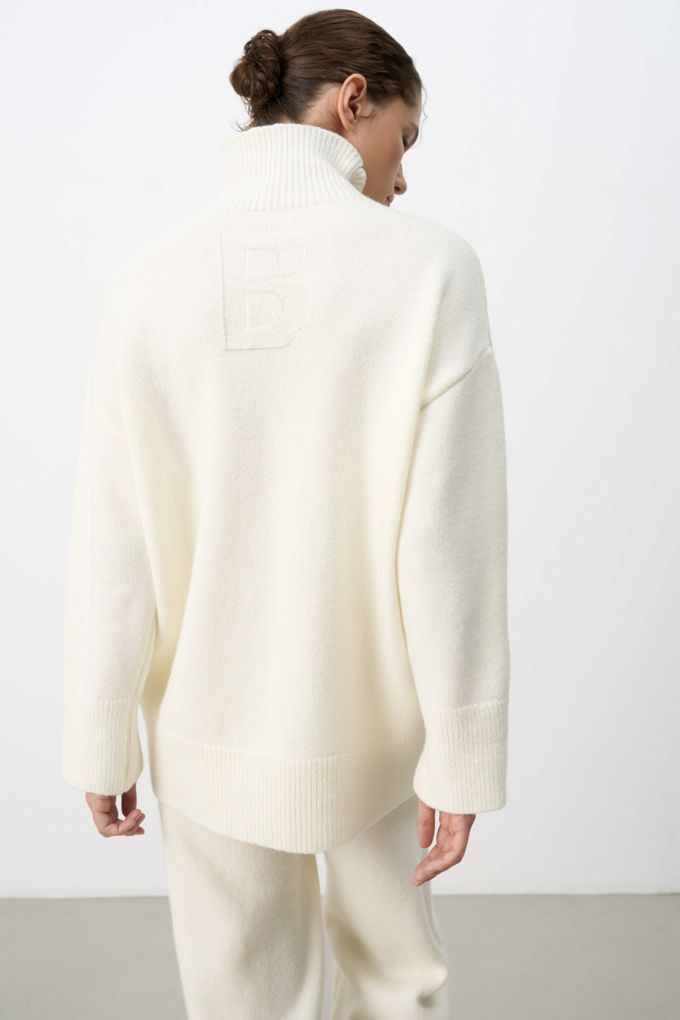 Джемпер из тончайшей мериносовой шерсти. Можно носить с обеих сторон. Возле воротника вывязана буква "B".