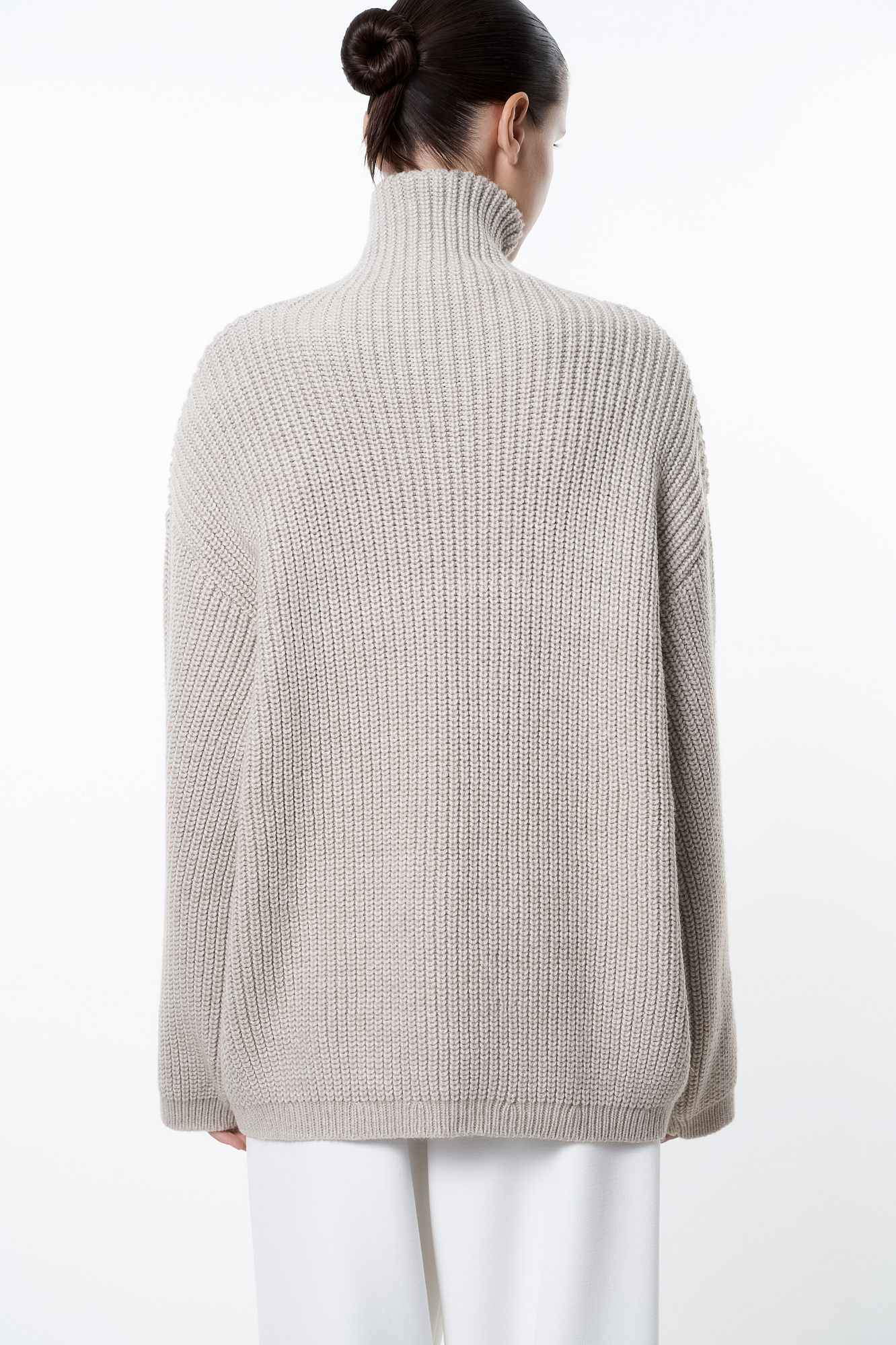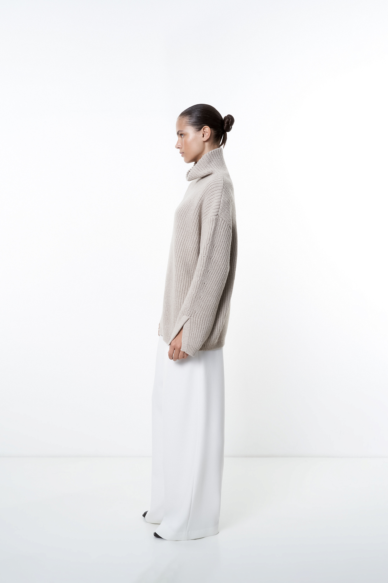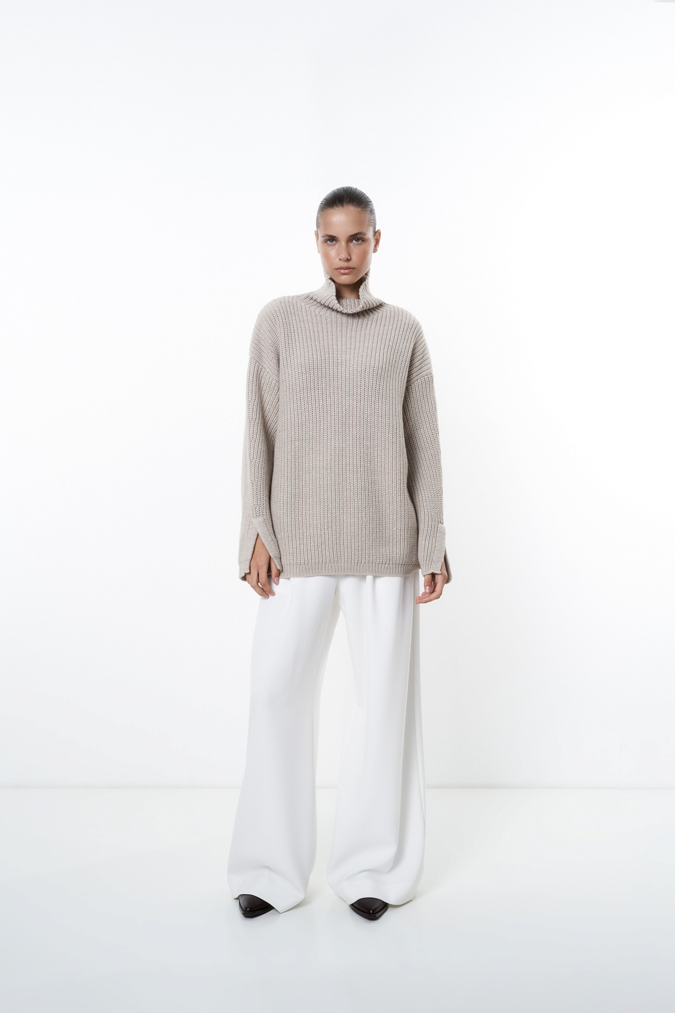 Трикотажный джемпер с шерстью альпака. Модель свободного силуэта со спущенным плечом, высоким воротом и разрезами на манжетах.