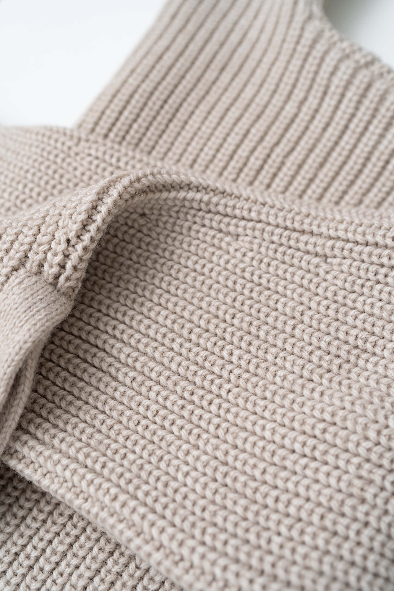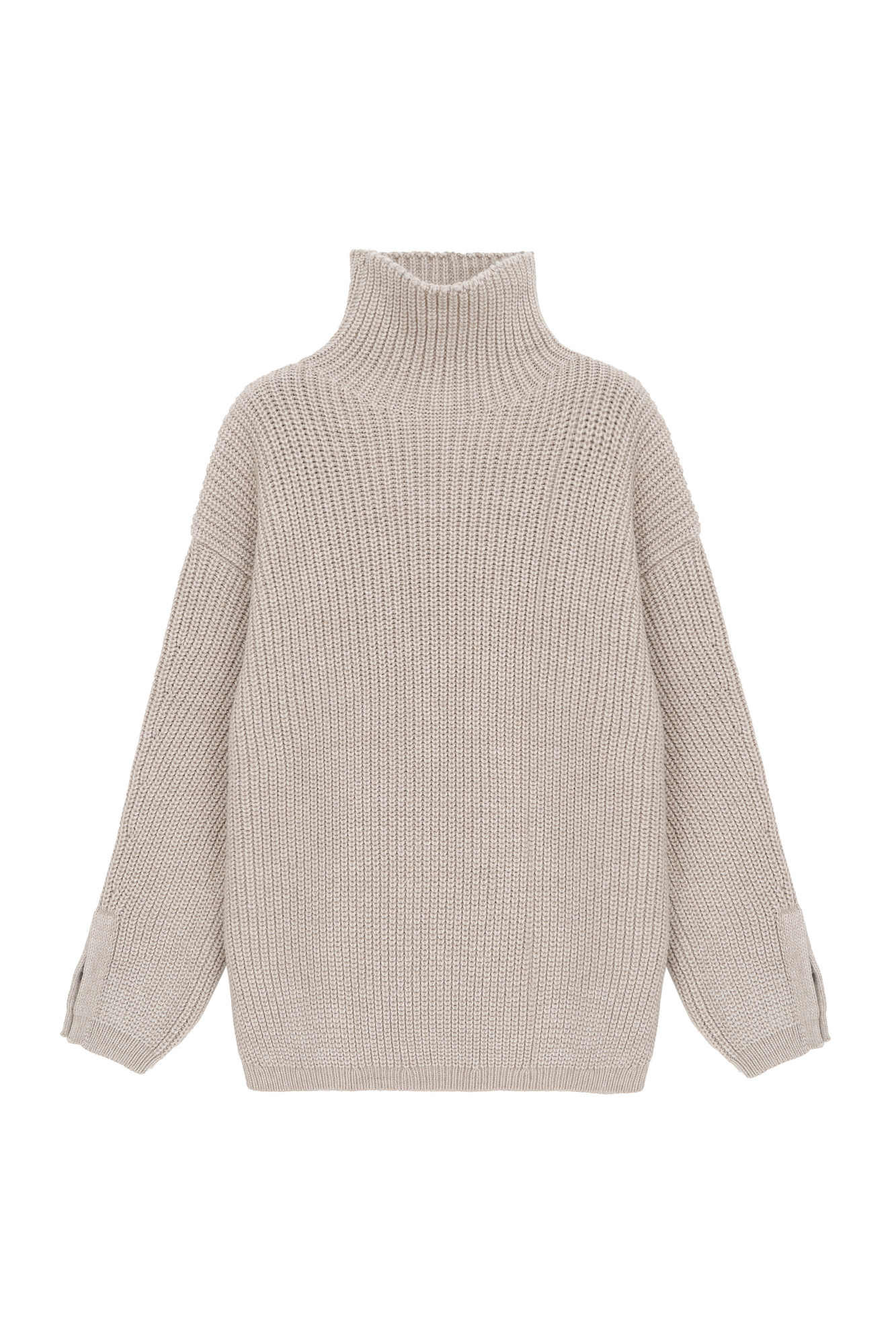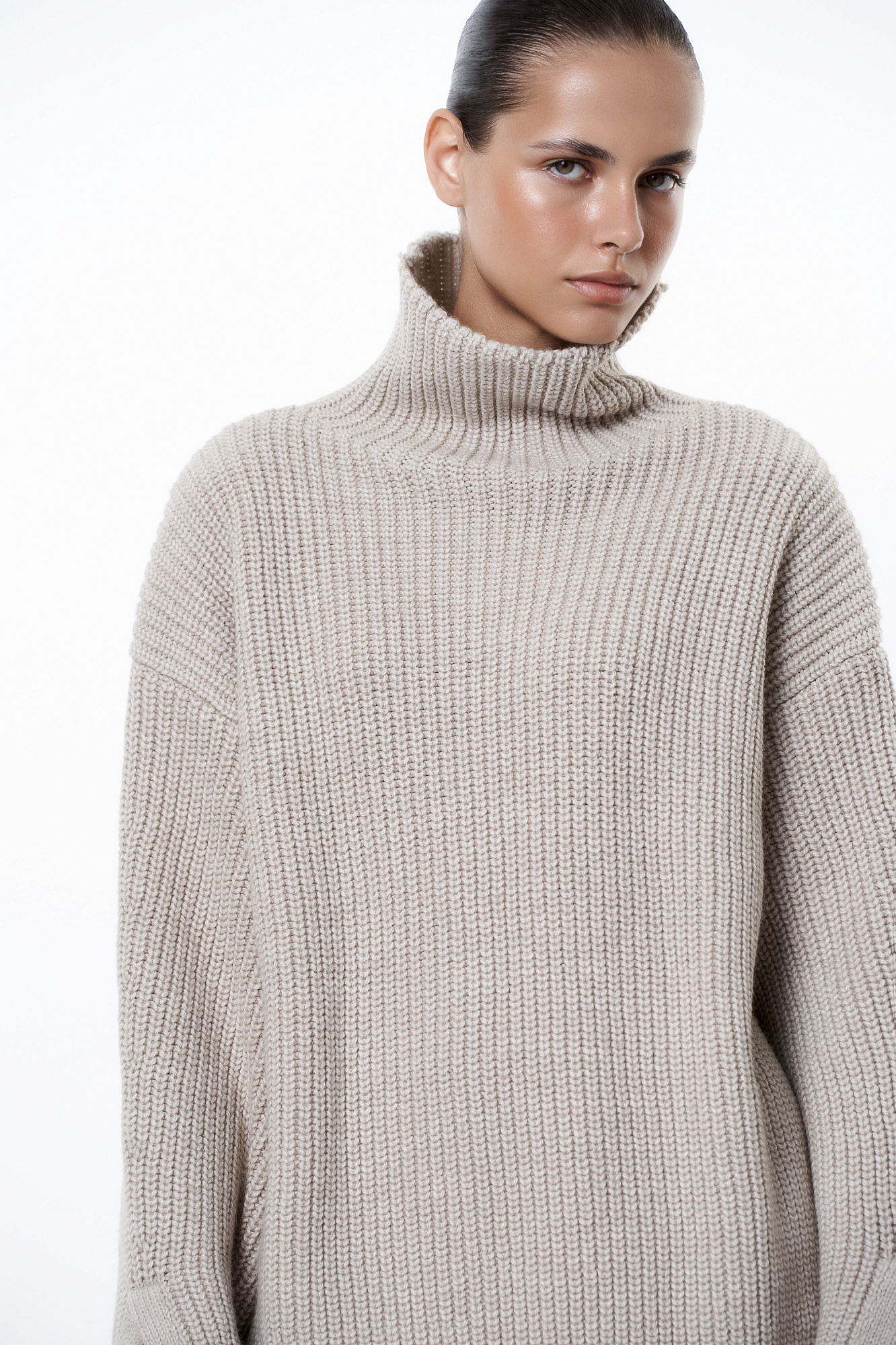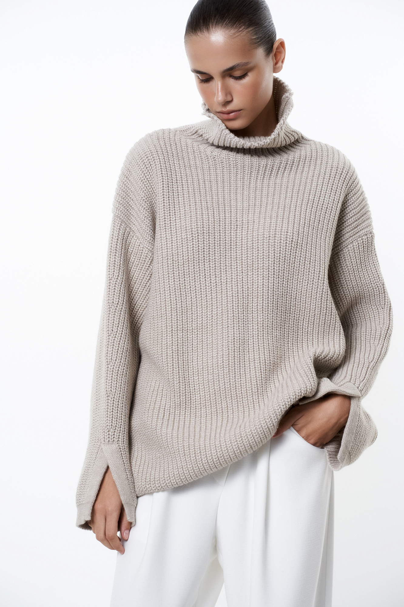 Трикотажный джемпер с шерстью альпака. Модель свободного силуэта со спущенным плечом, высоким воротом и разрезами на манжетах.