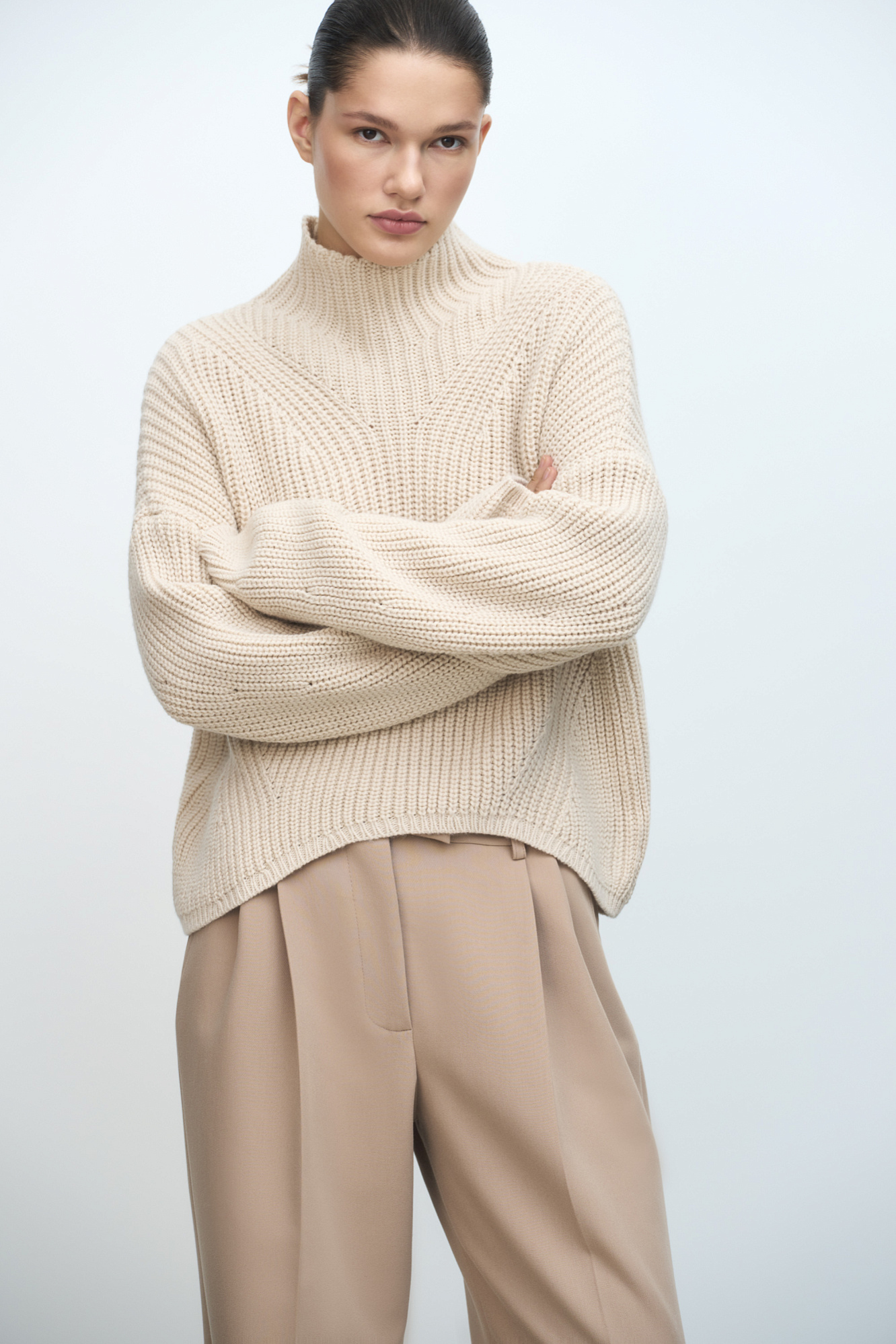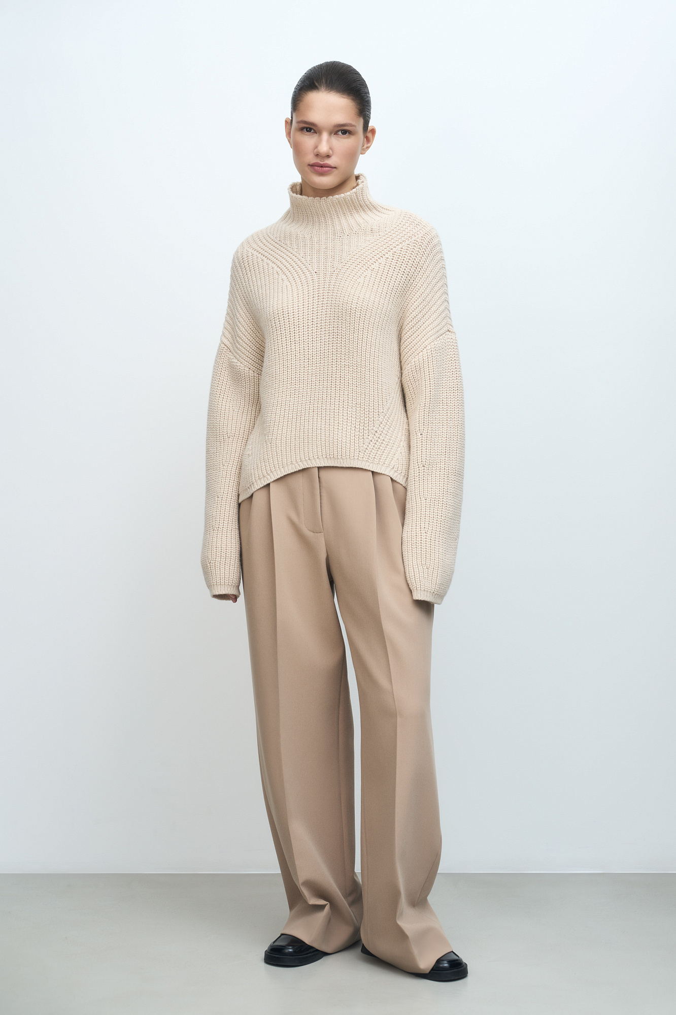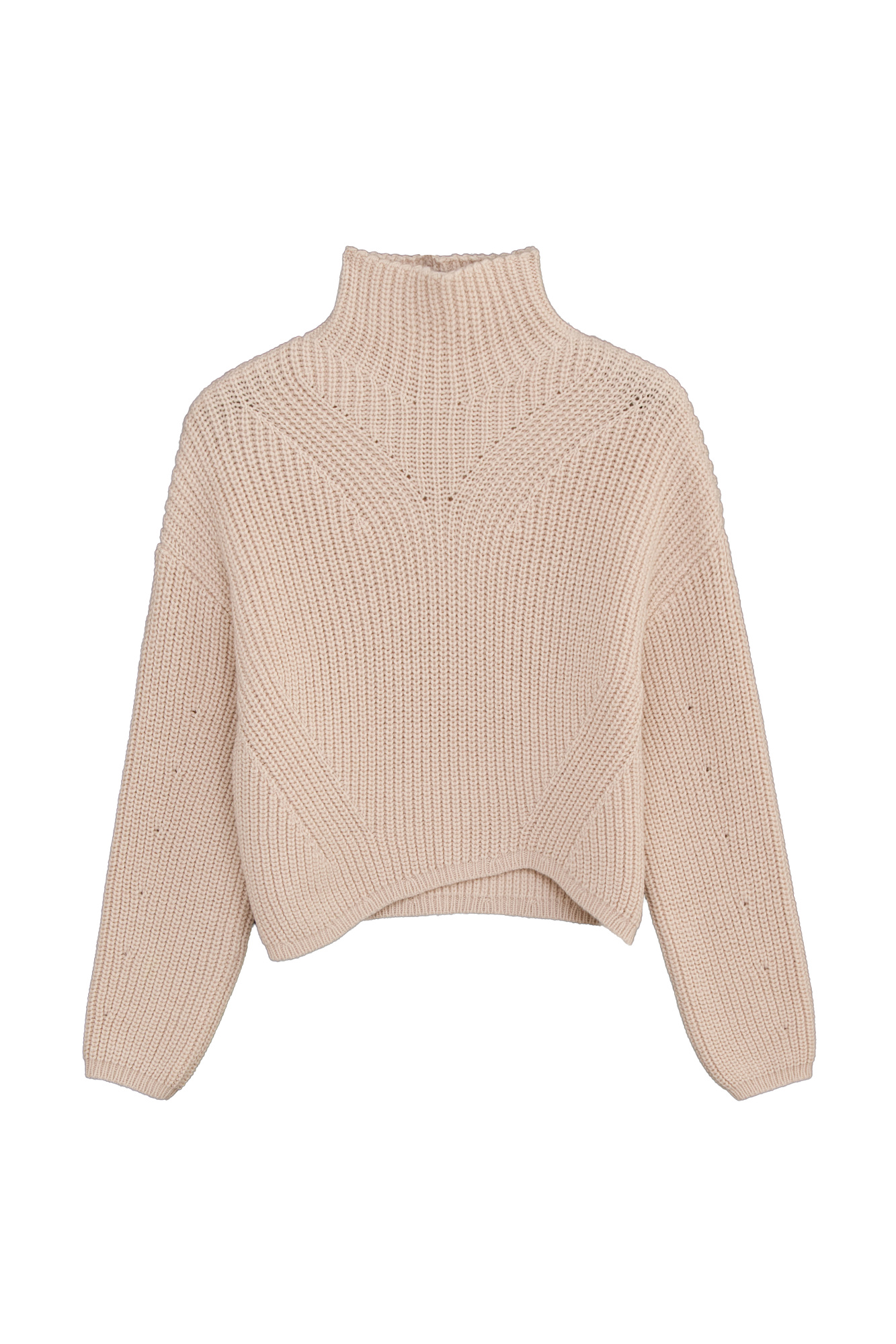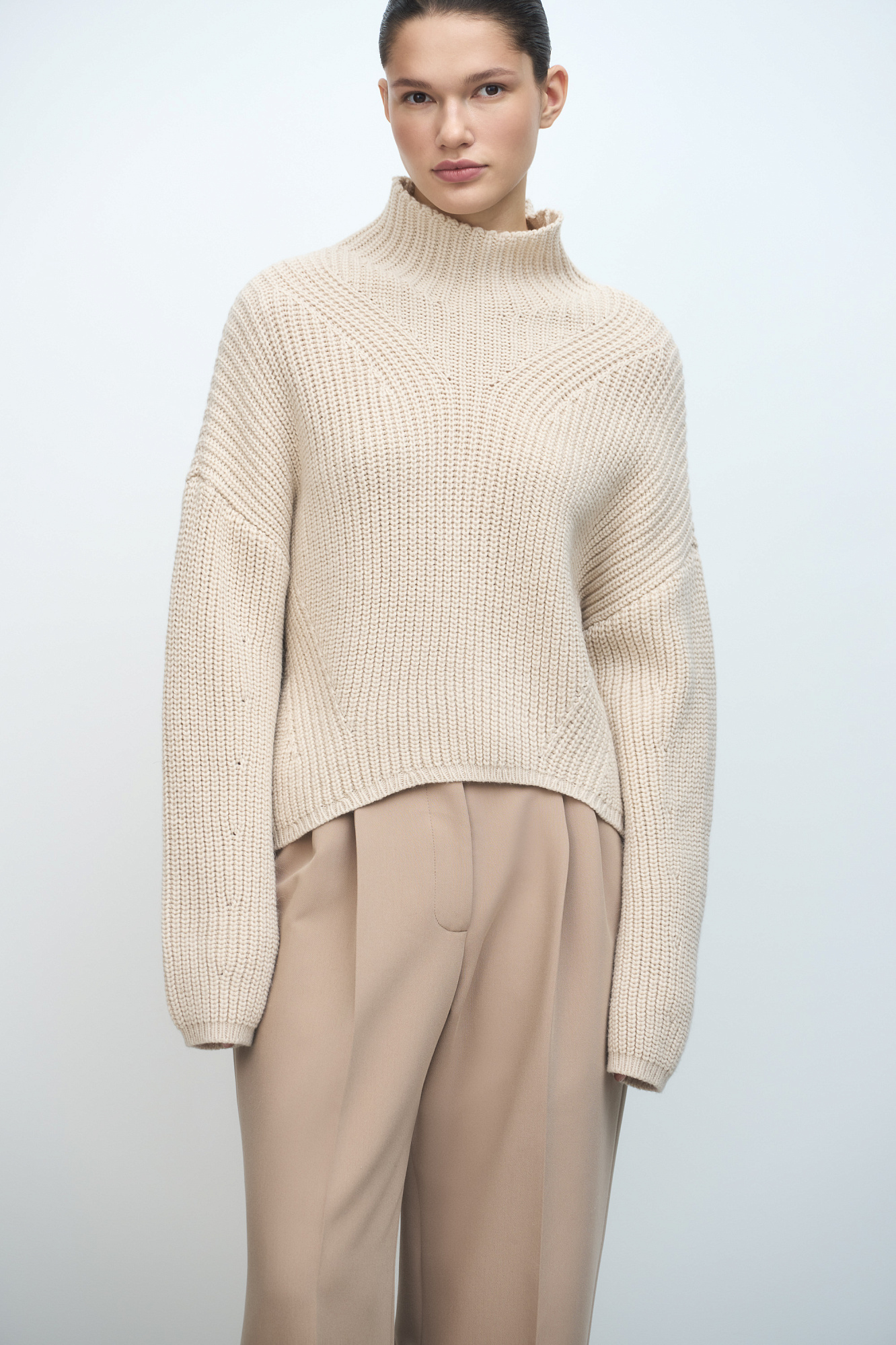 Трикотажный джемпер из шерсти Альпака с асимметричным нижним краем и декоративными дорожками. Модель свободного силуэта со спущенным плечом.