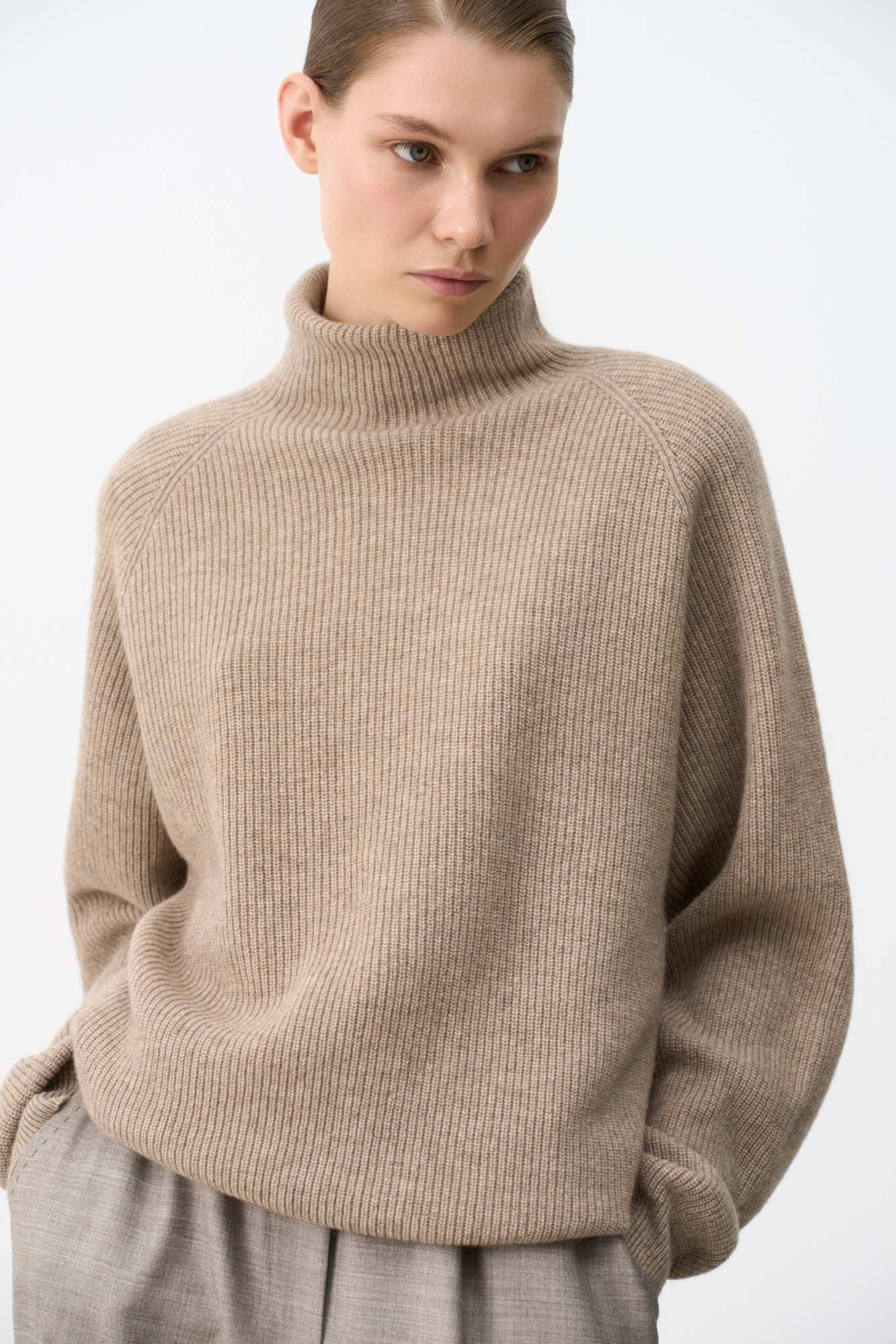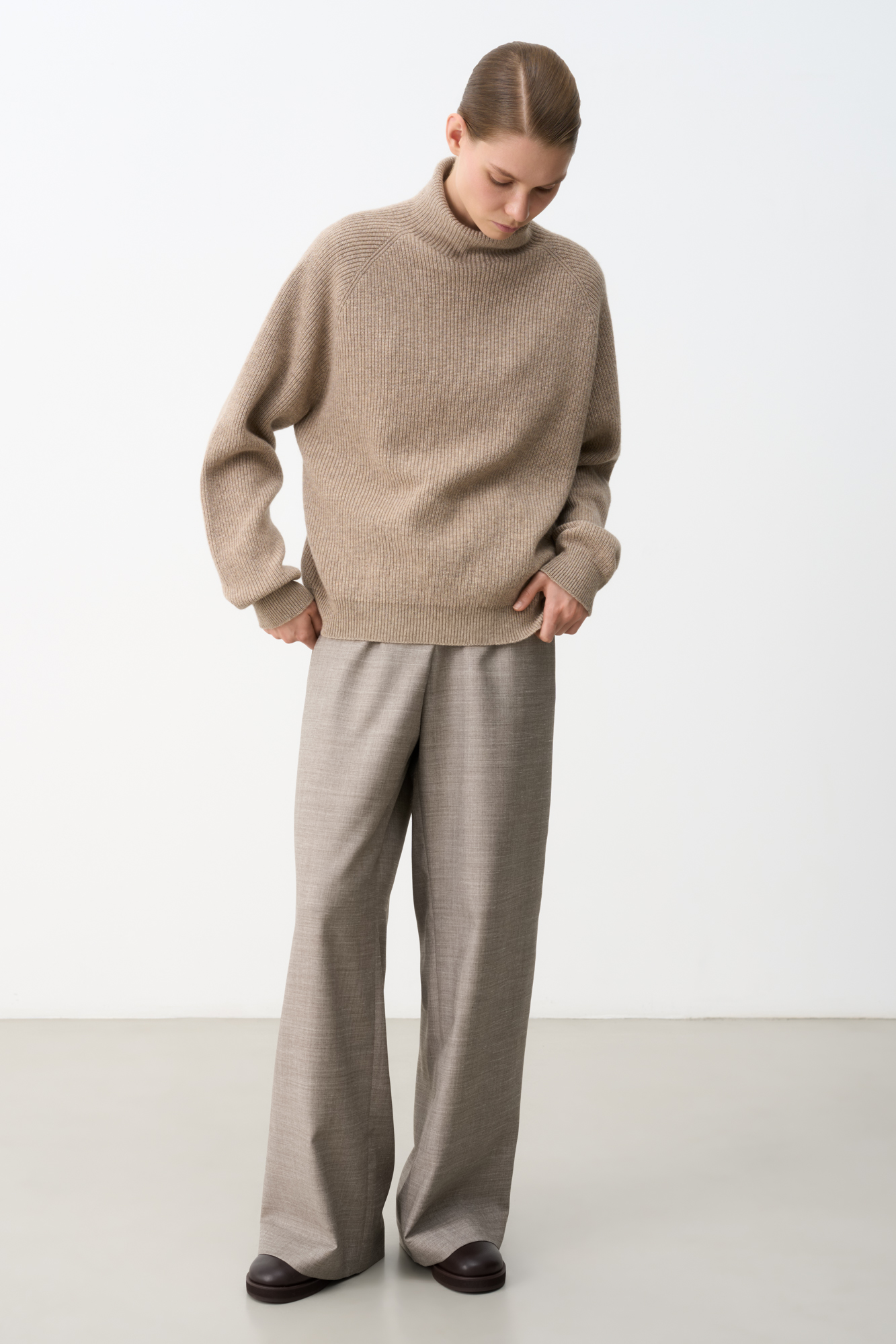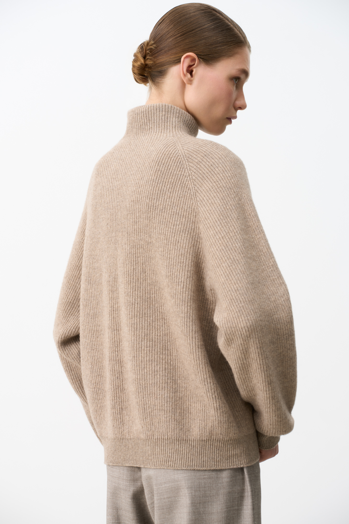 Трикотажный джемпер из шерсти и кашемира. Модель свободного силуэта с аккуратным воротником-стойкой и рукавом формы реглан. Низ изделия и манжеты рукавов выполнены на резинке.