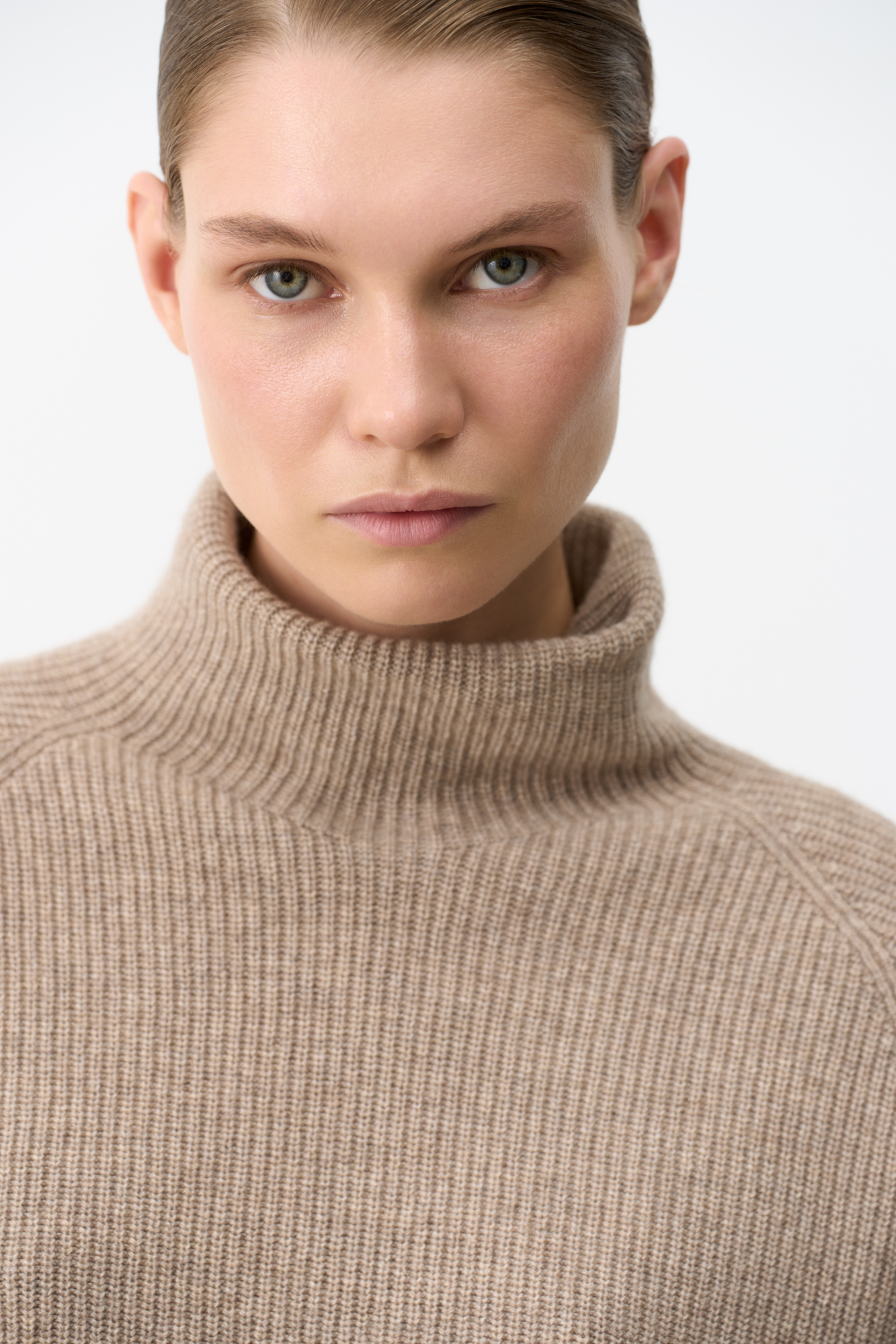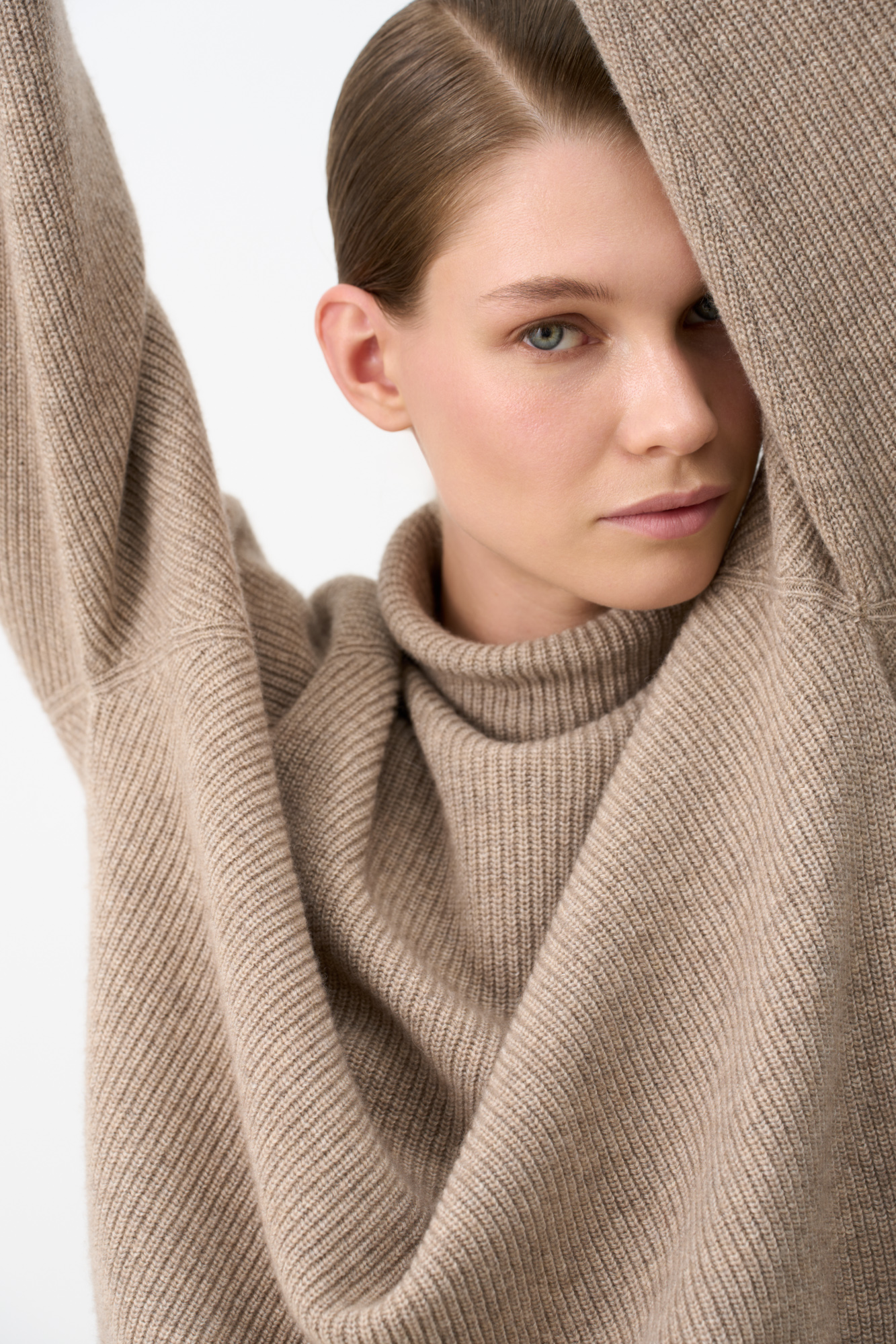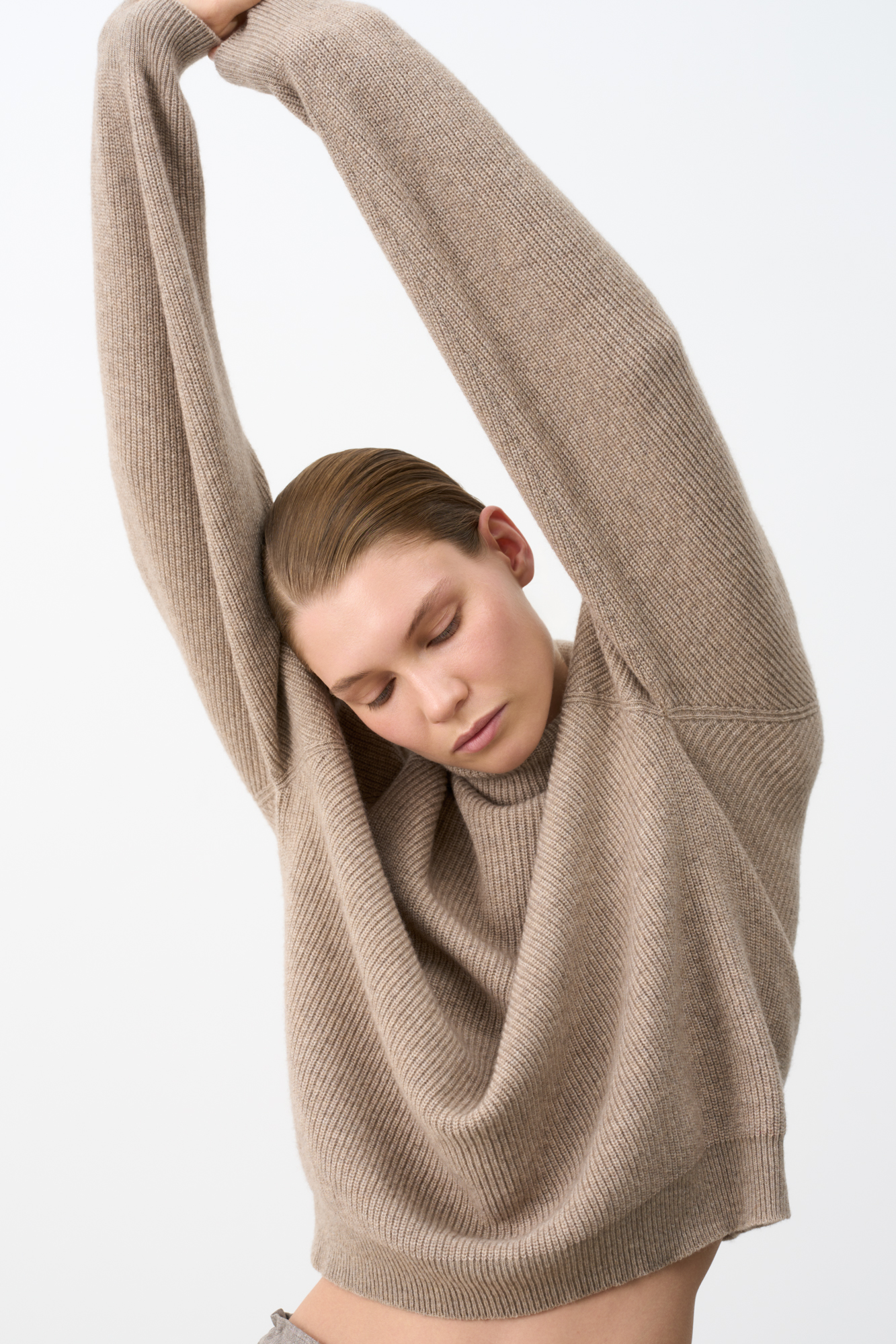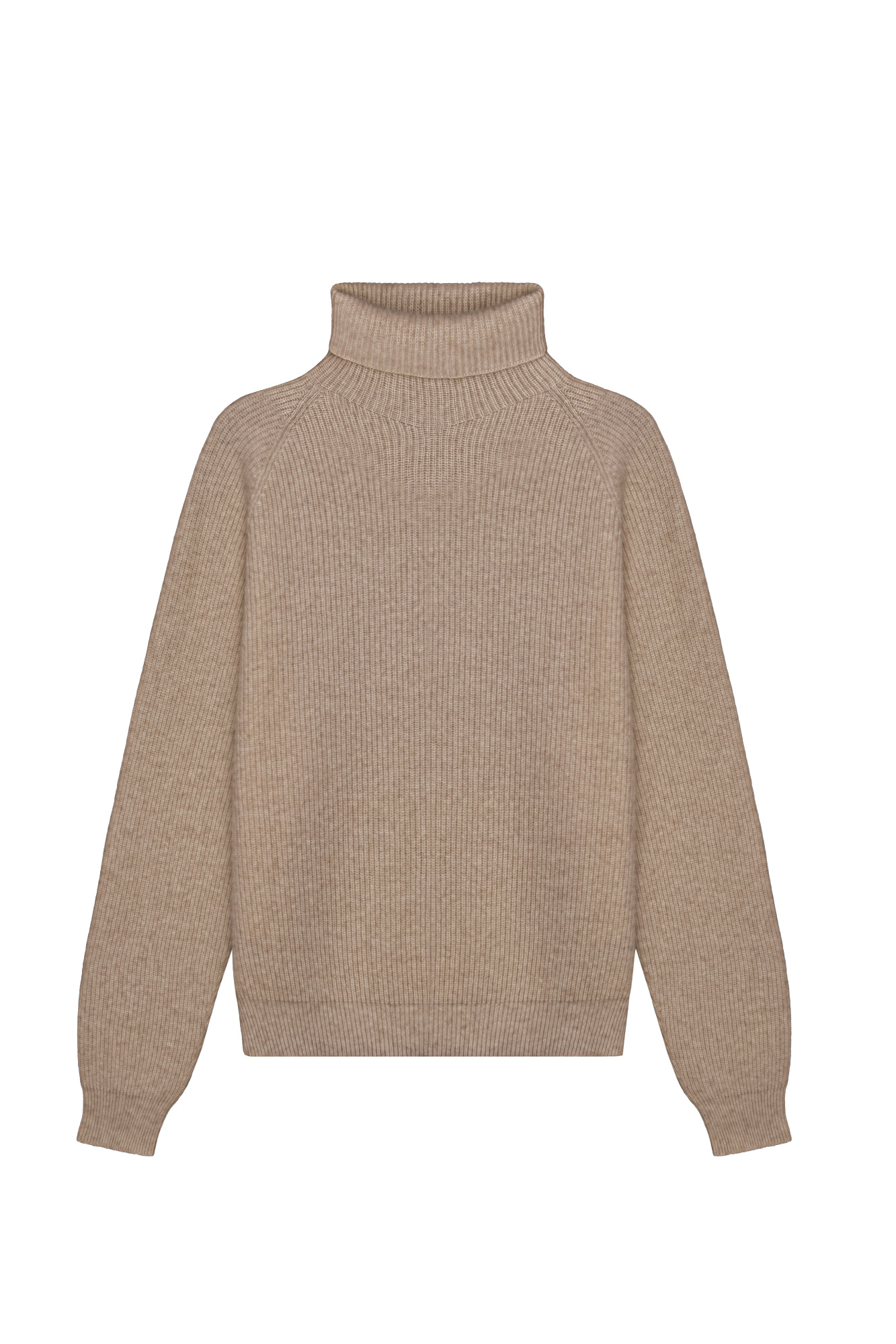 Трикотажный джемпер из шерсти и кашемира. Модель свободного силуэта с аккуратным воротником-стойкой и рукавом формы реглан. Низ изделия и манжеты рукавов выполнены на резинке.