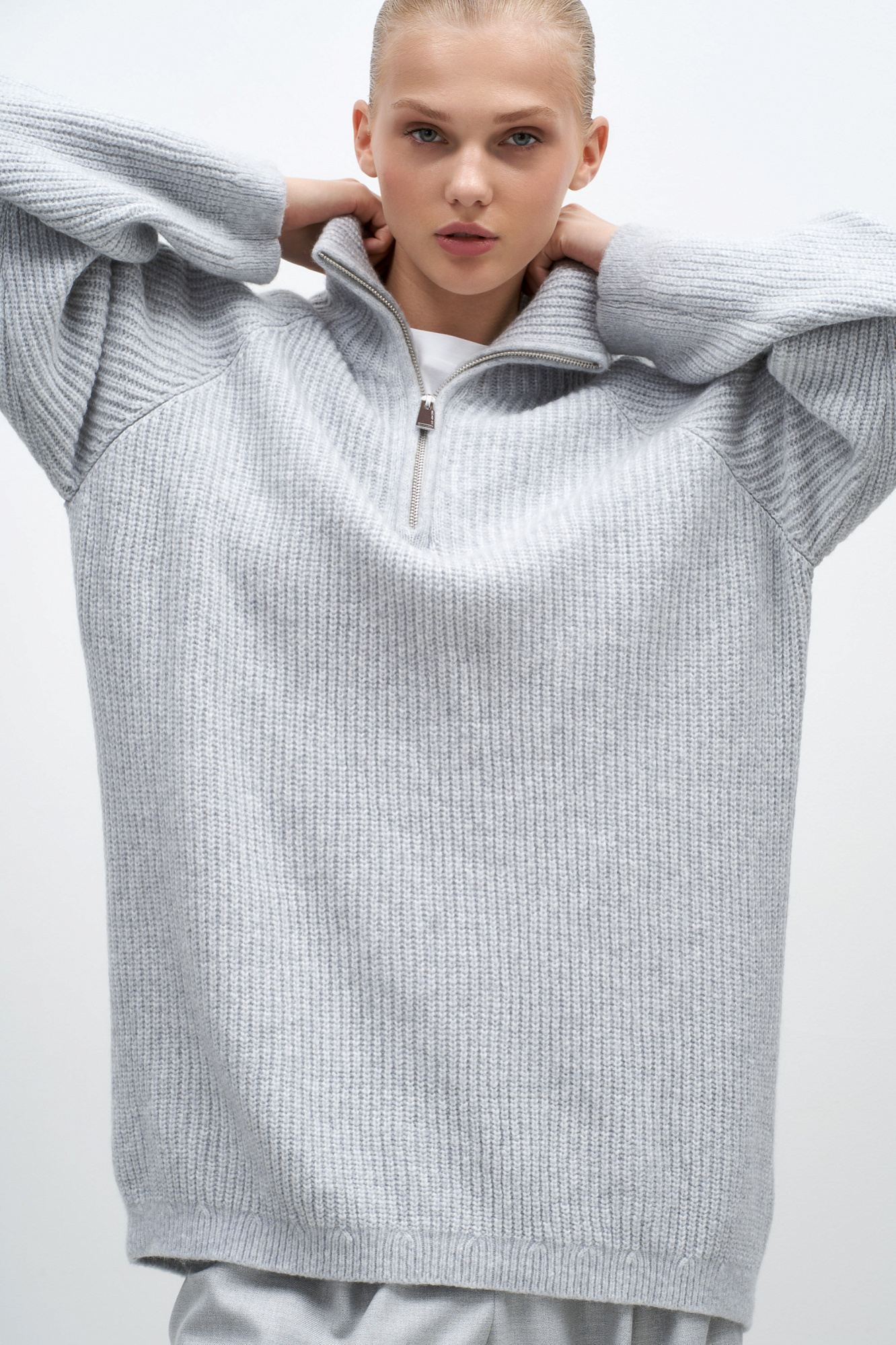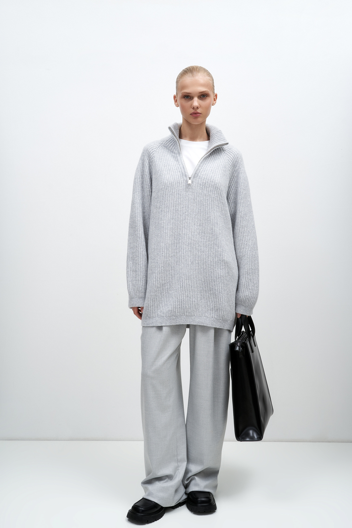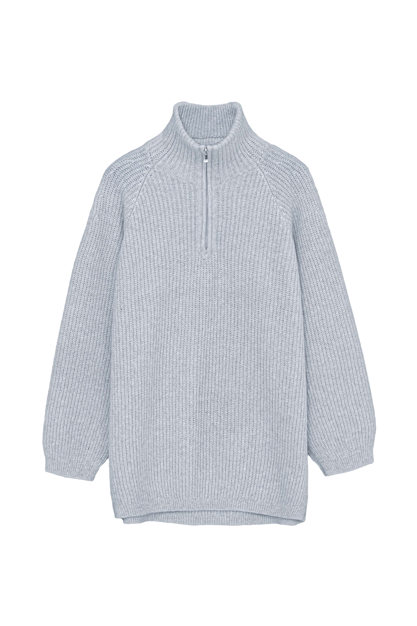 Удлиненный джемпер из мягкой шерсти мериноса экстрафайн. Модель свободного силуэта с высоким воротом и застежкой на молнию.