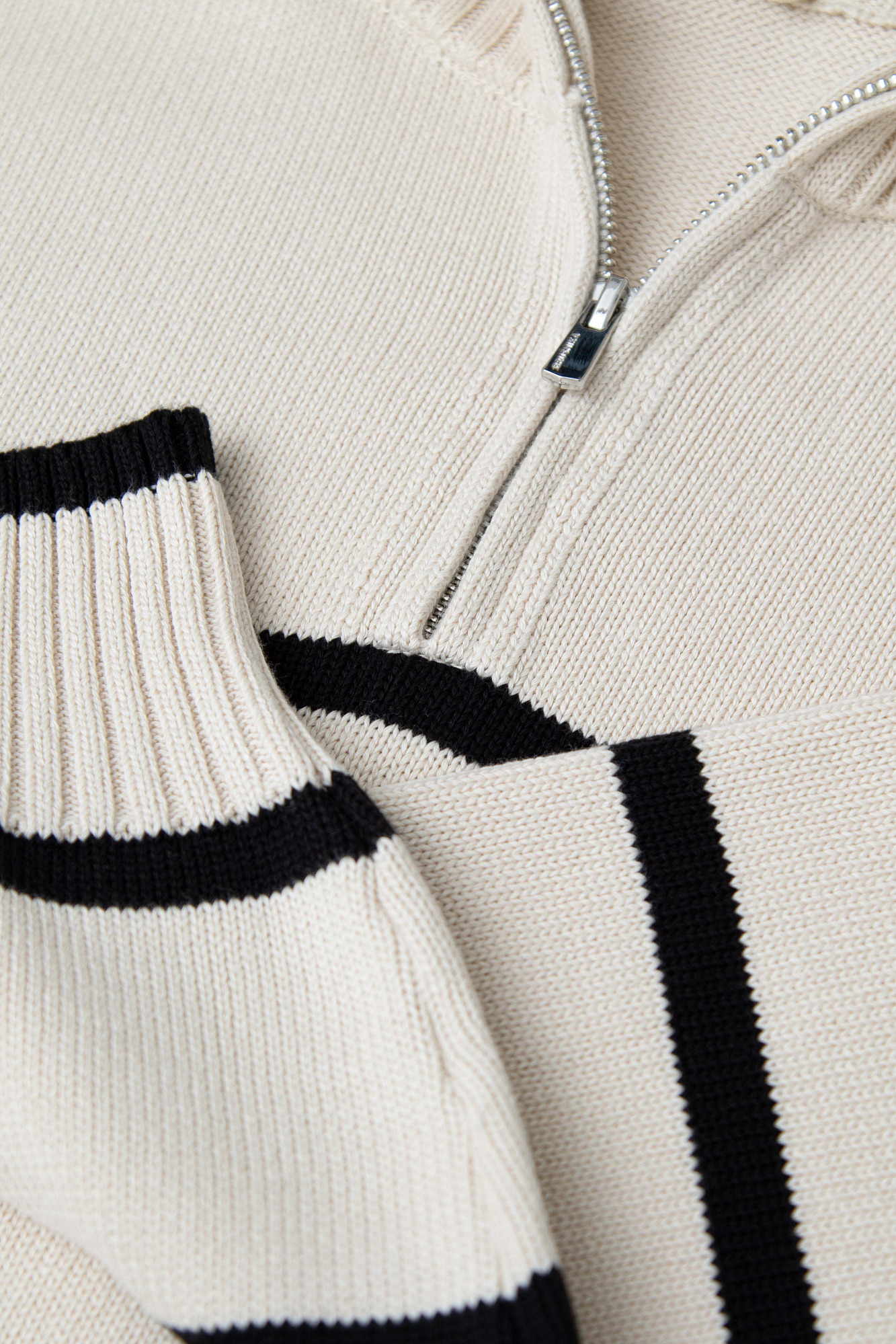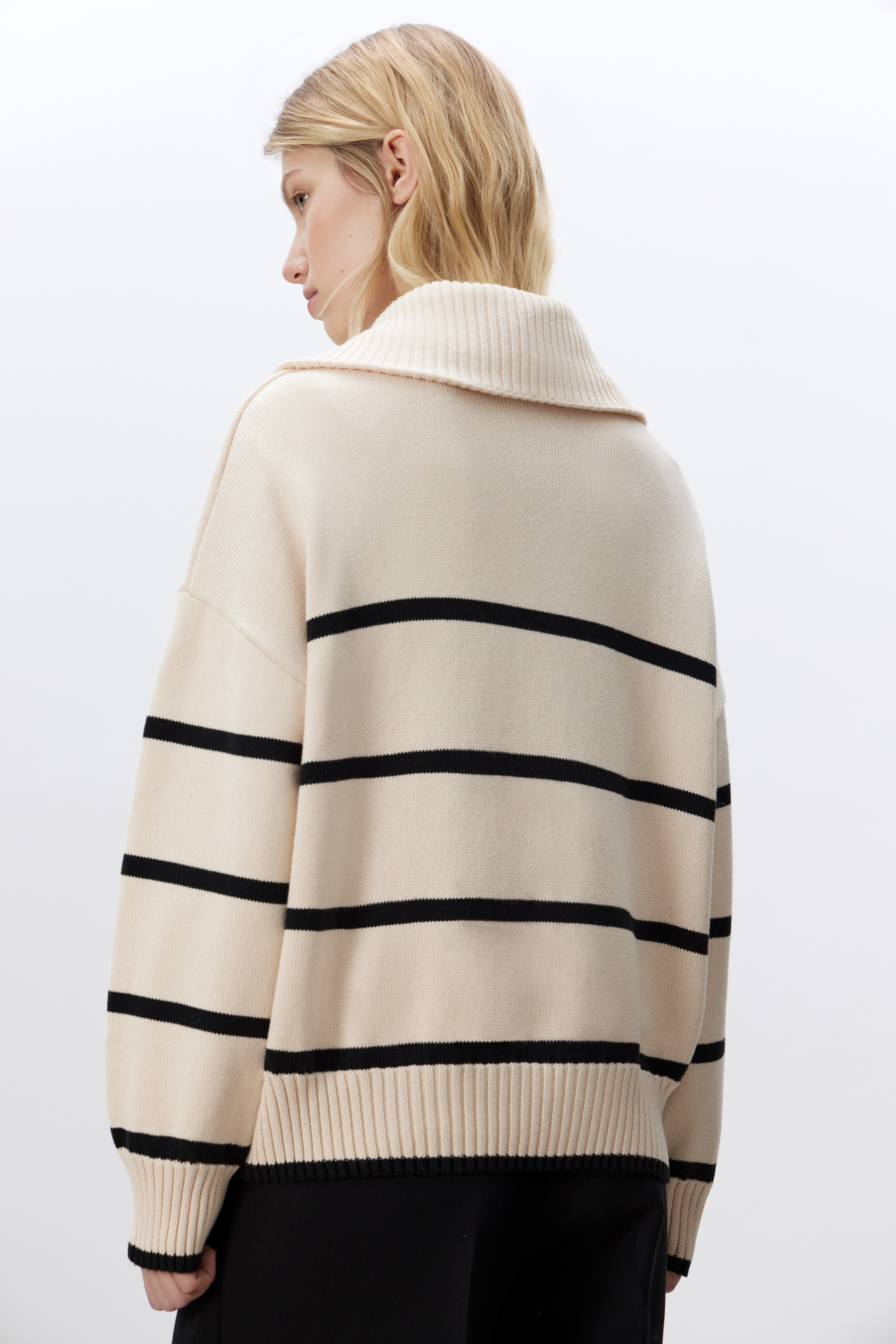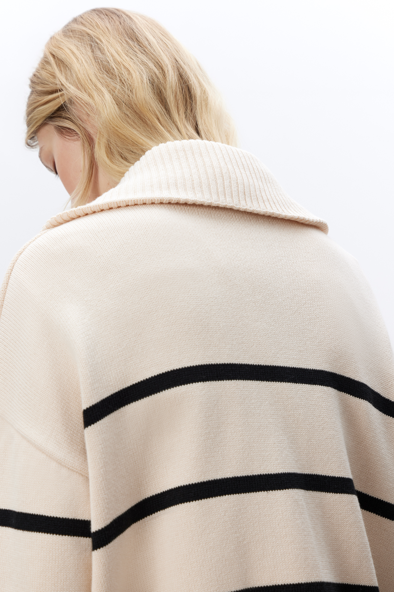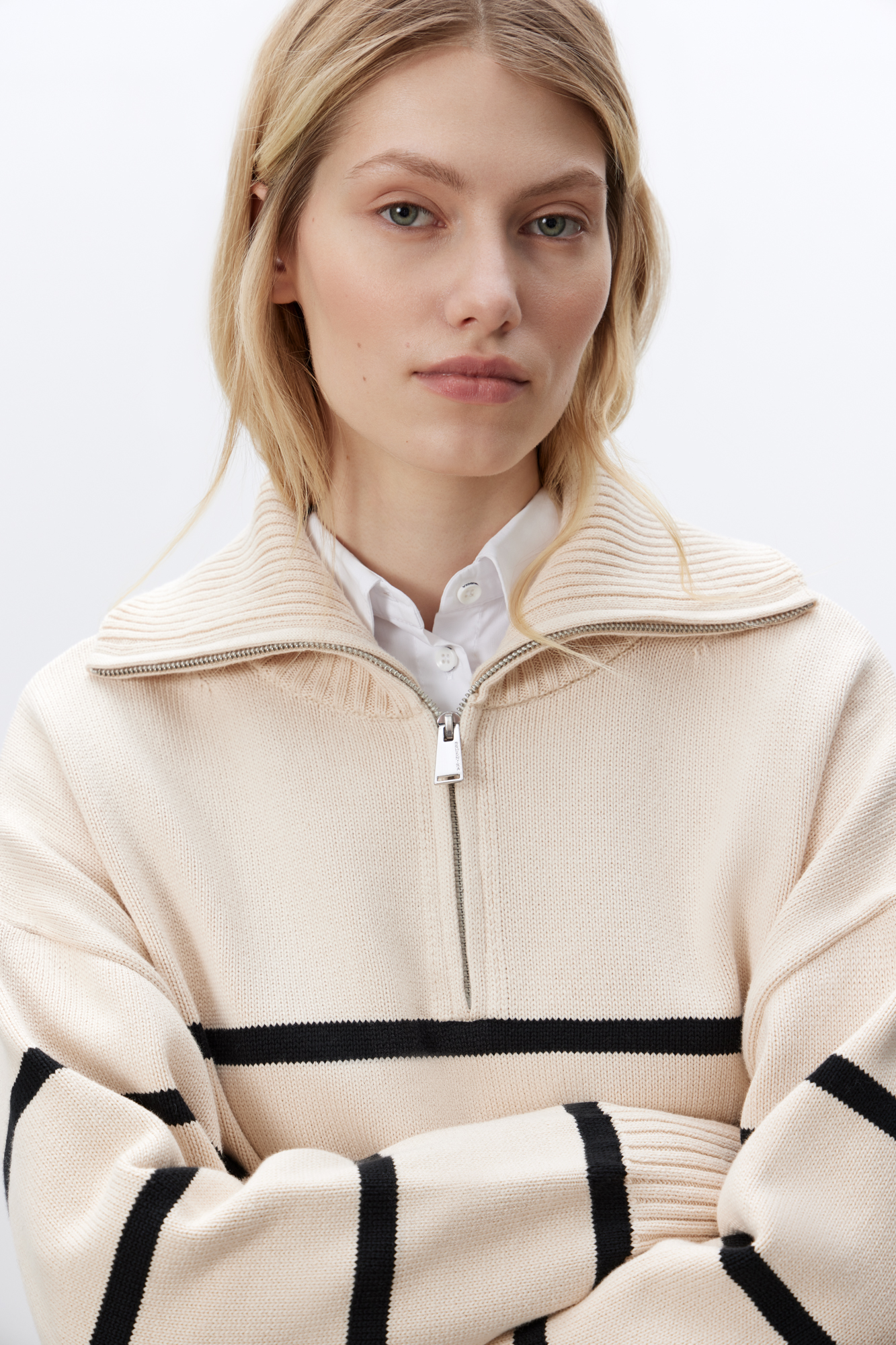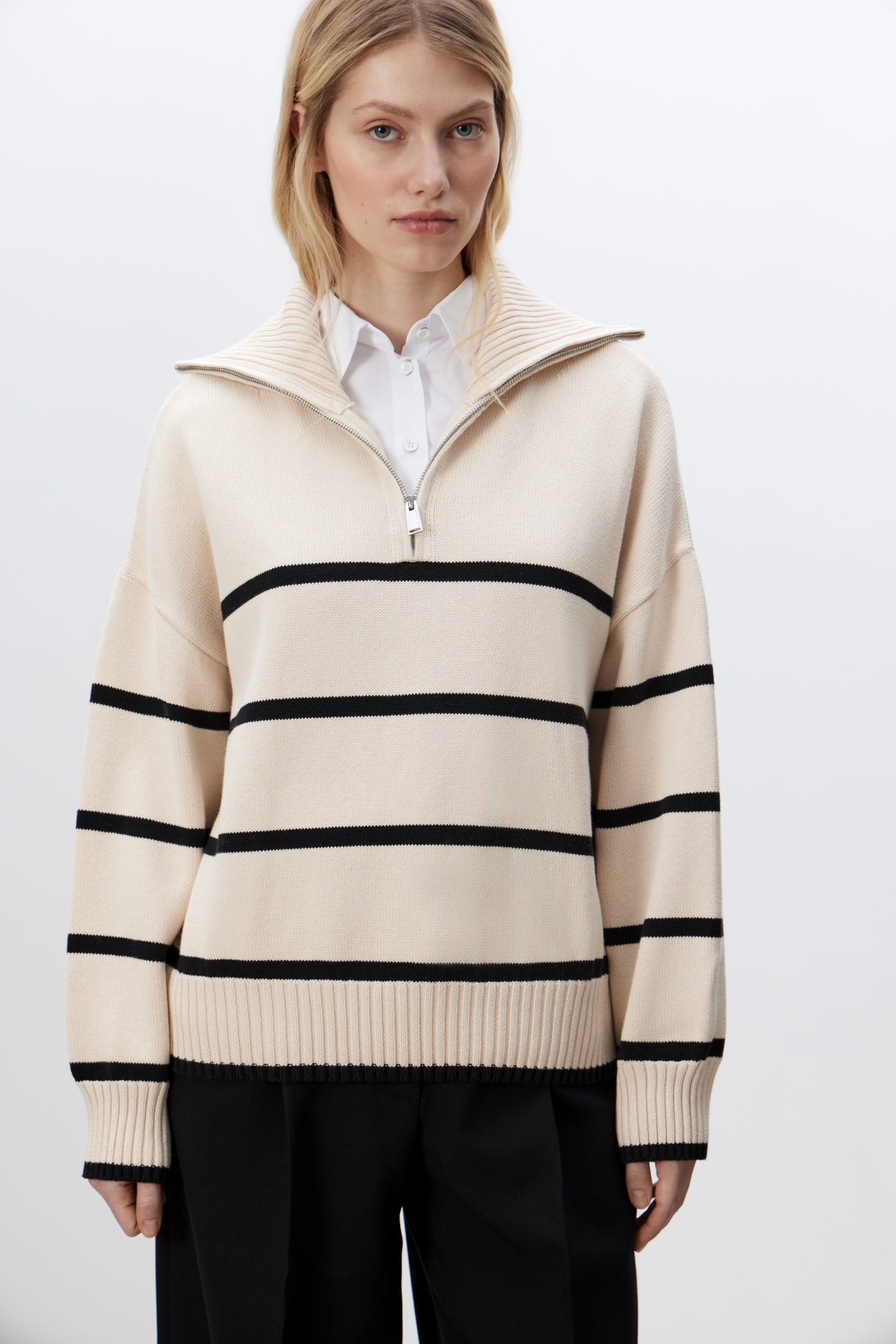 Трикотажный джемпер из 100% хлопка в полоску. Модель свободного силуэта со спущенной линией плеча и воротником-стойкой на молнии.