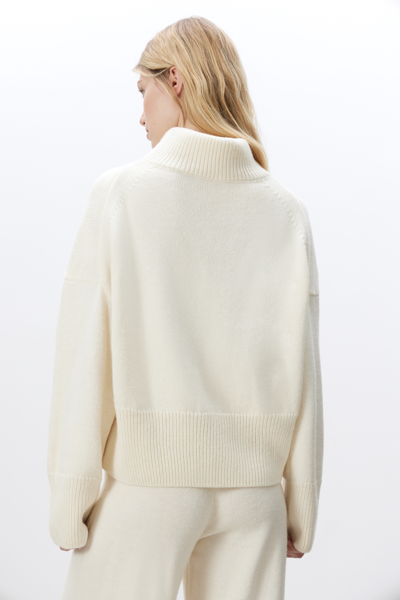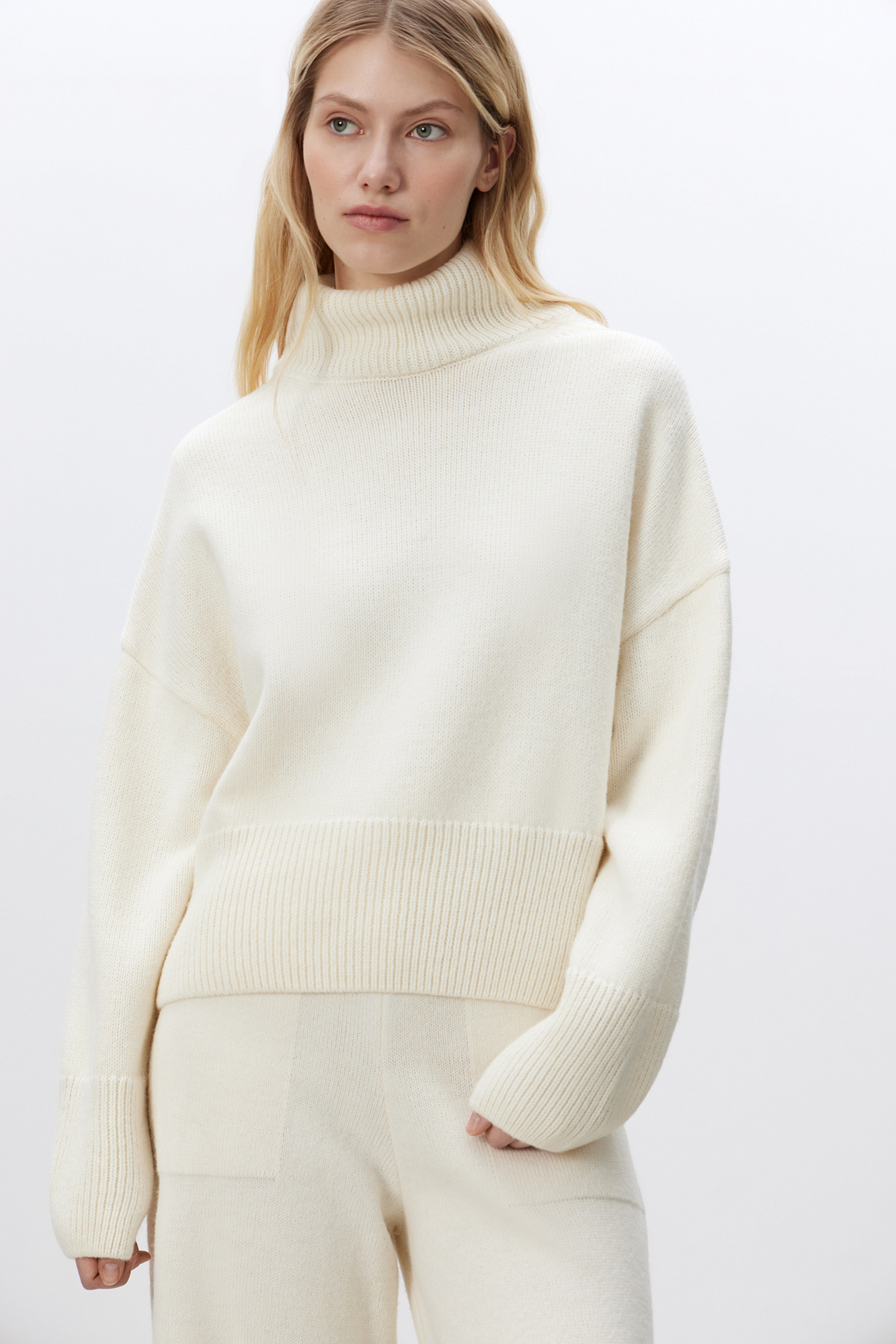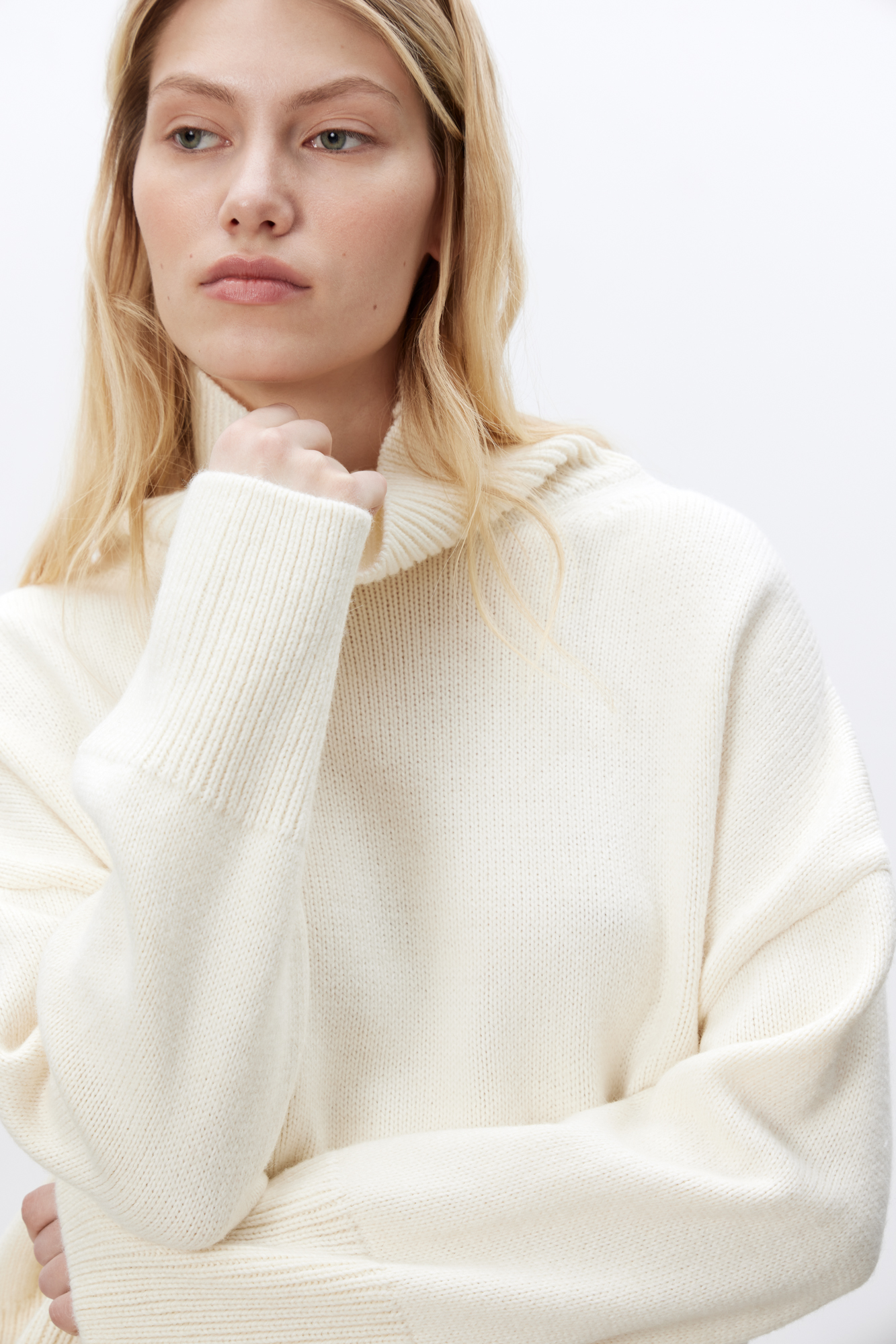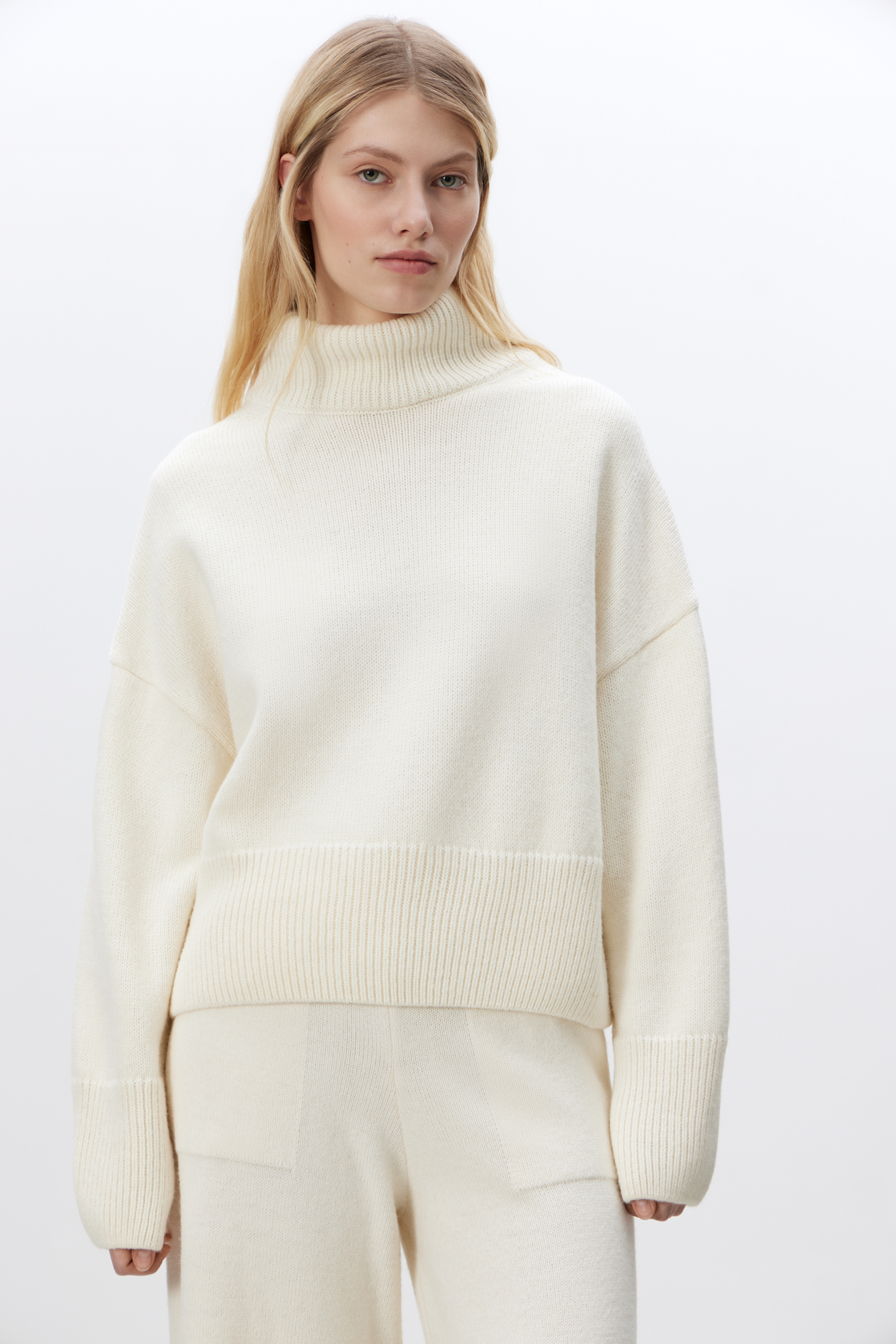 Трикотажный джемпер с шерстью альпака. Модель свободного силуэта с высоким воротником, спущенной линией плеча и длинными рукавами. Манжеты и низ изделия в рубчик.
