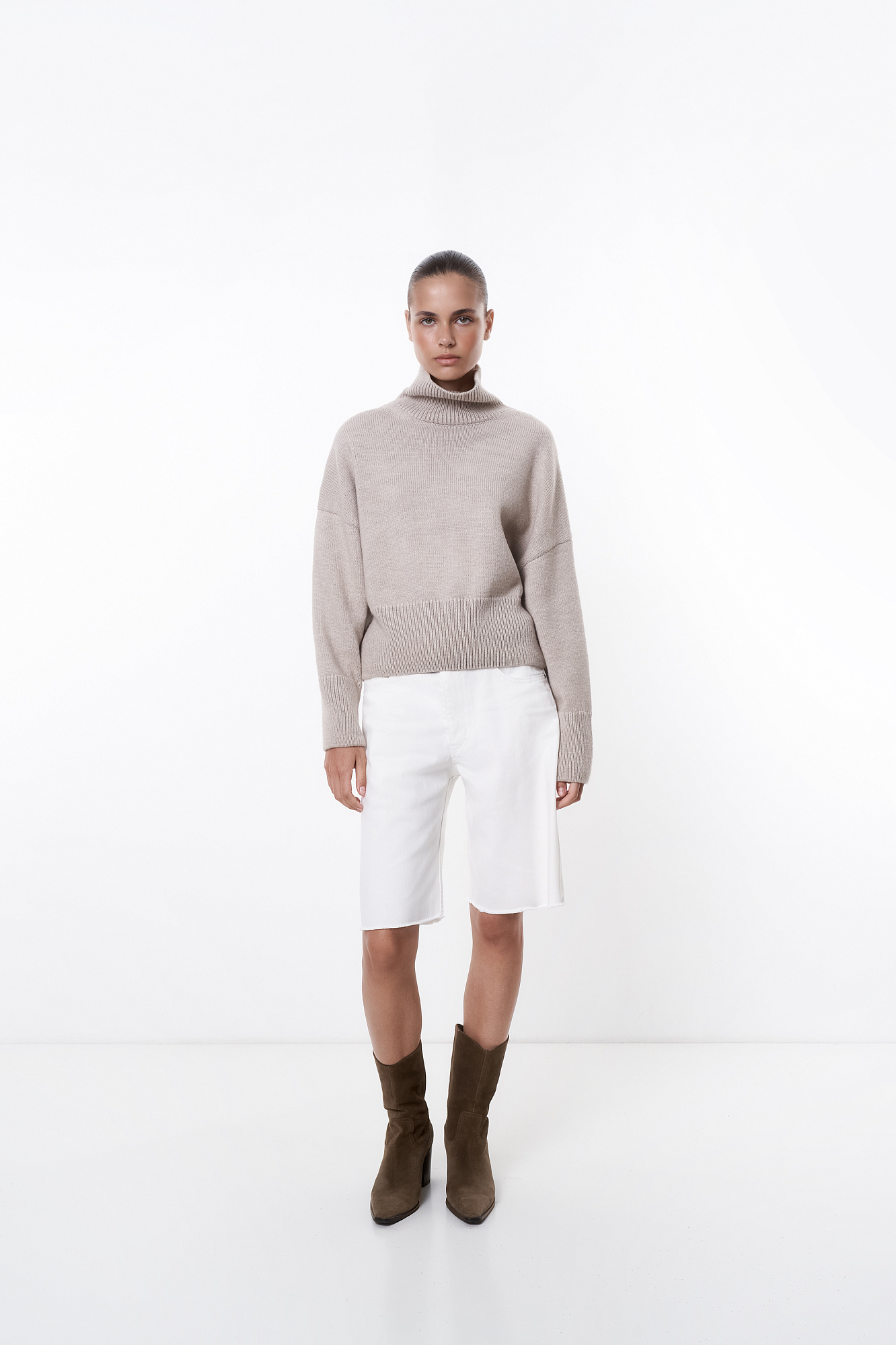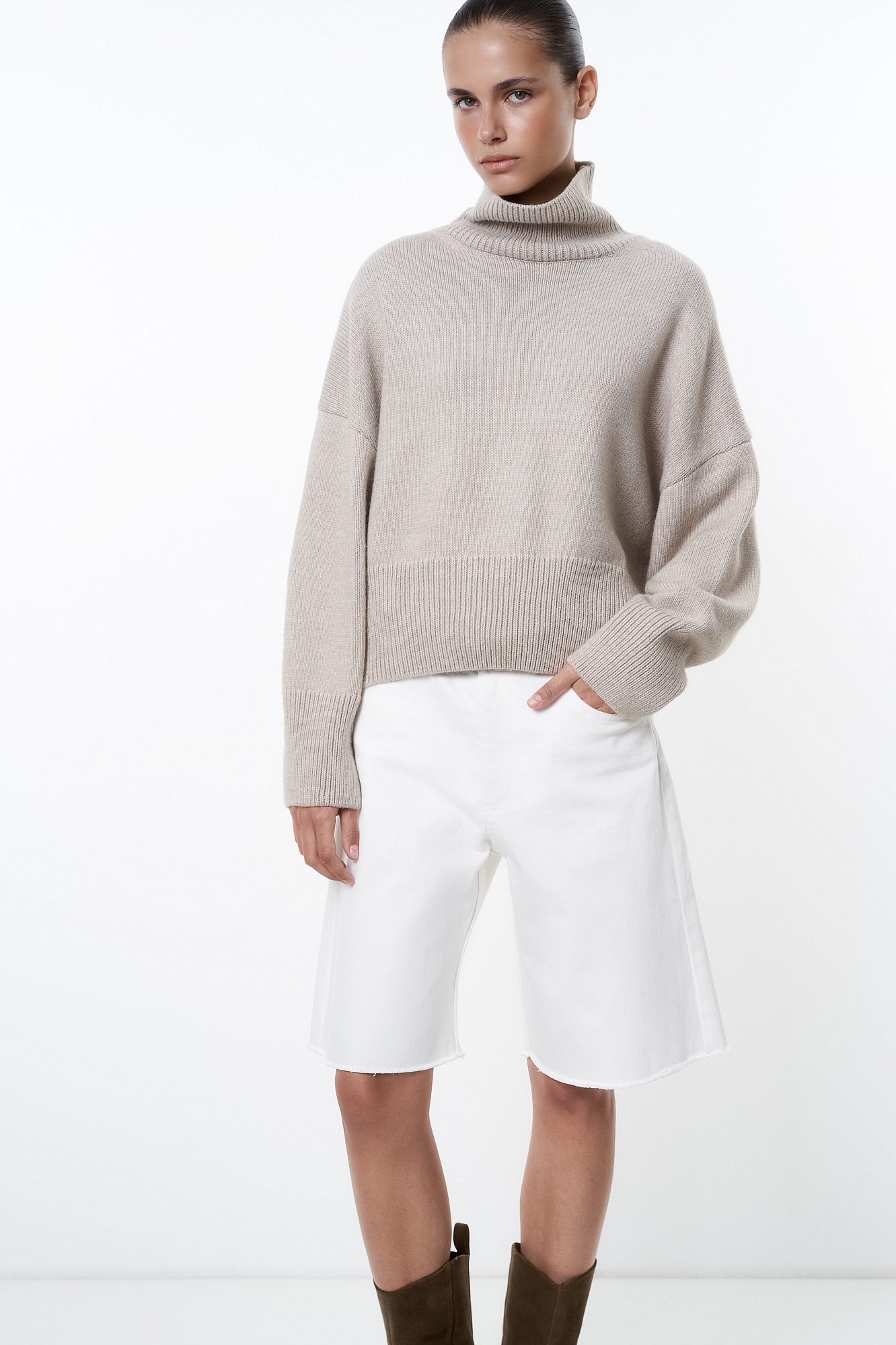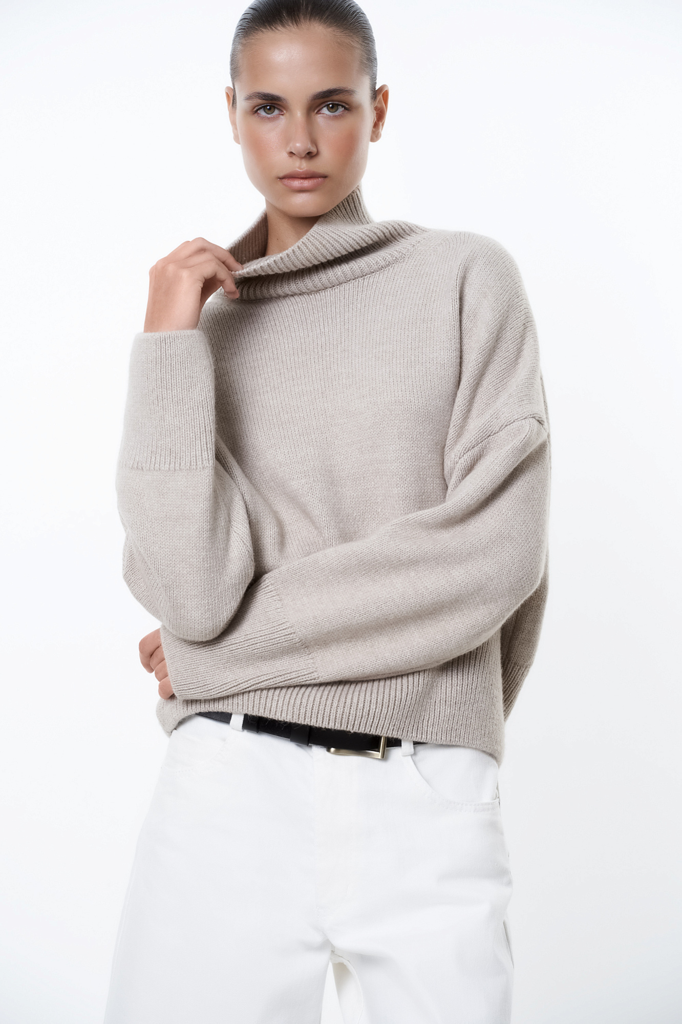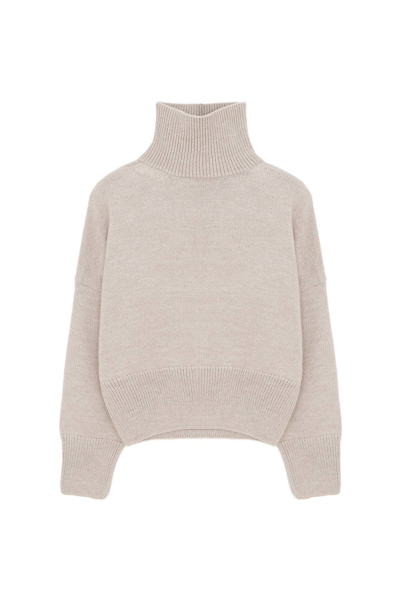 Трикотажный джемпер с шерстью альпака. Модель свободного силуэта с высоким воротником, спущенной линией плеча и длинными рукавами. Манжеты и низ изделия в рубчик.