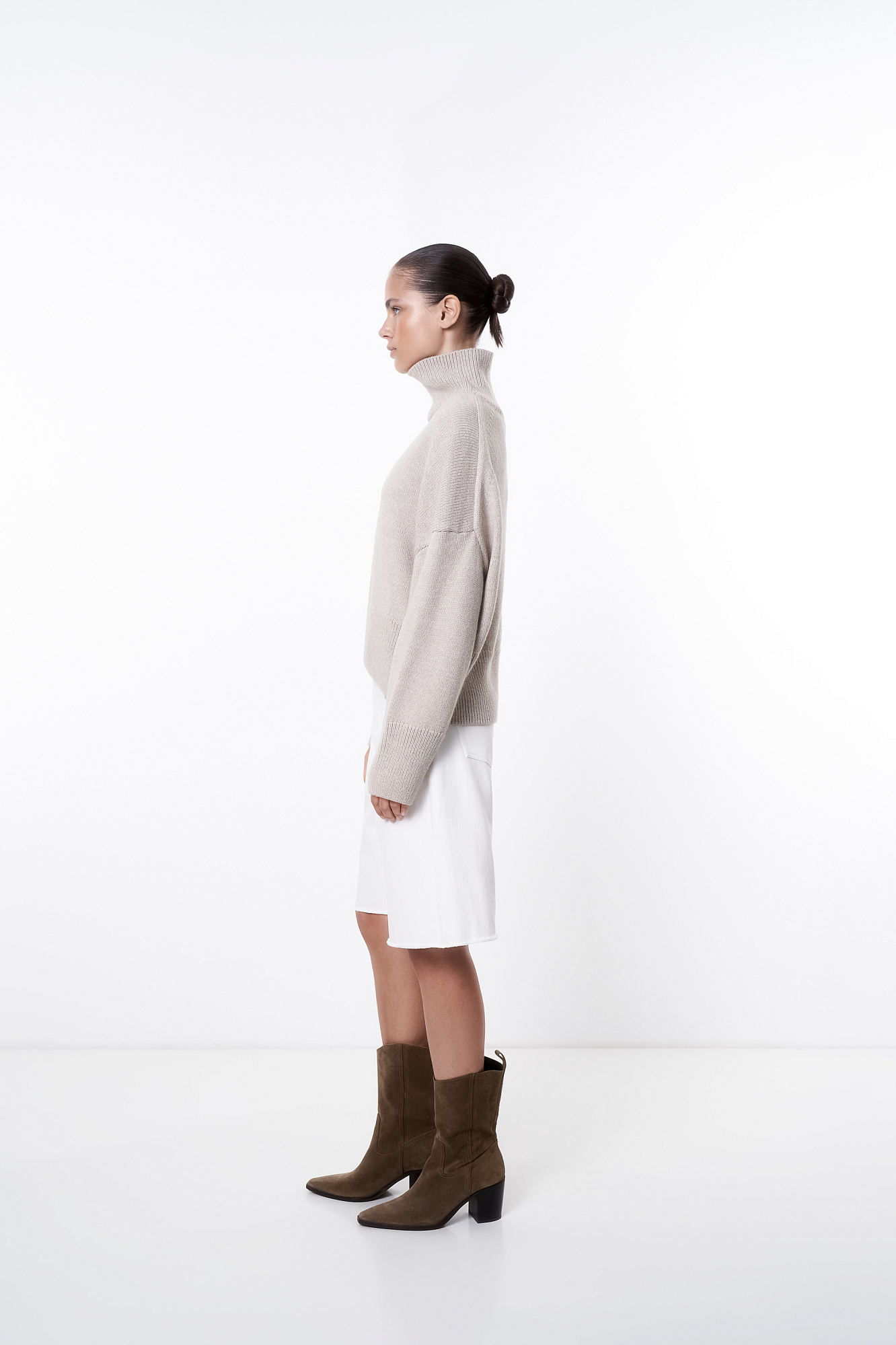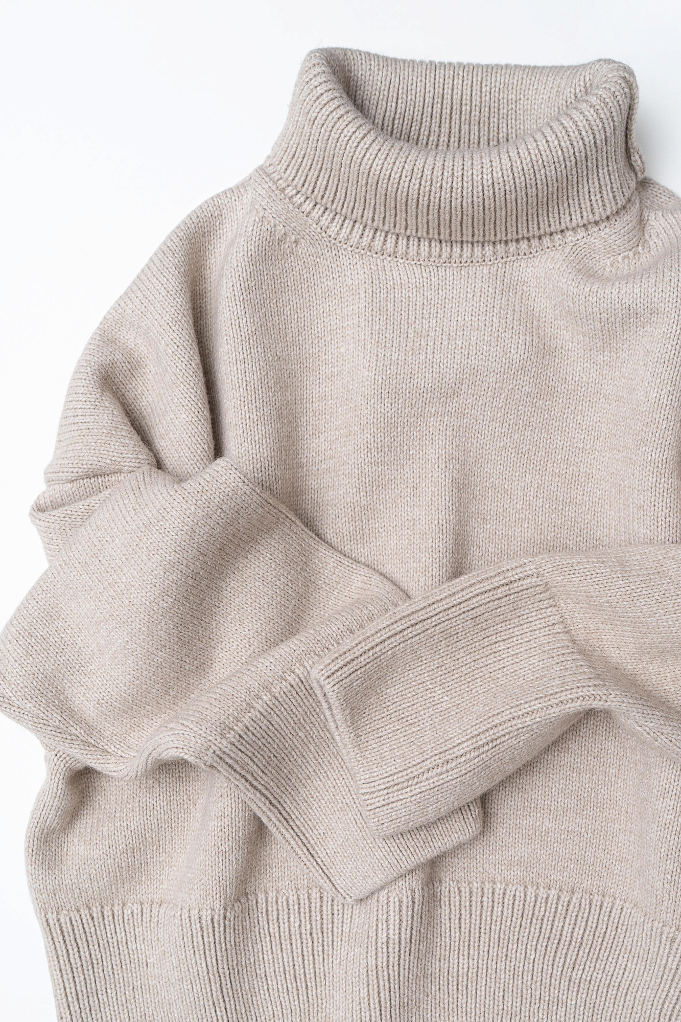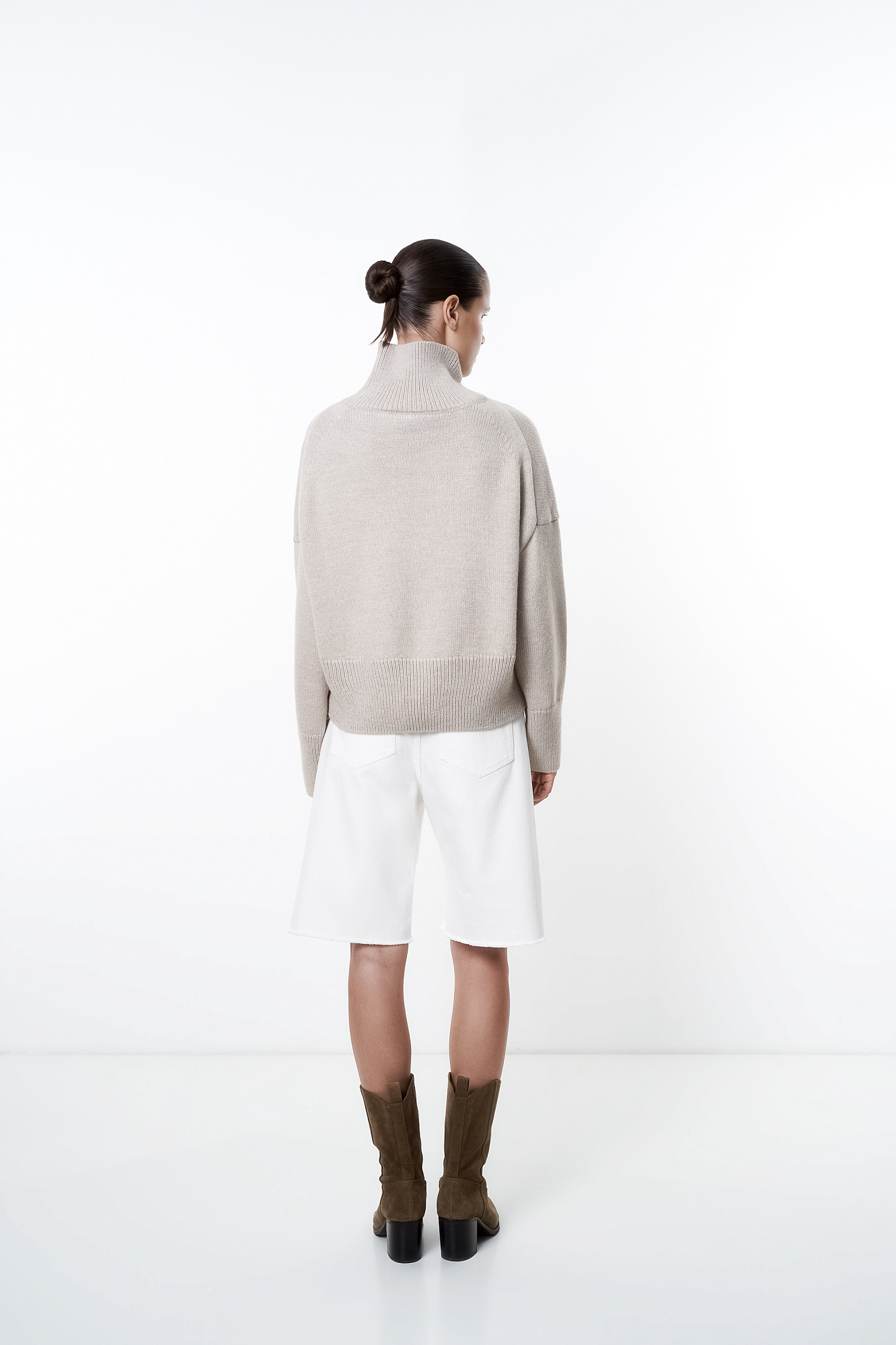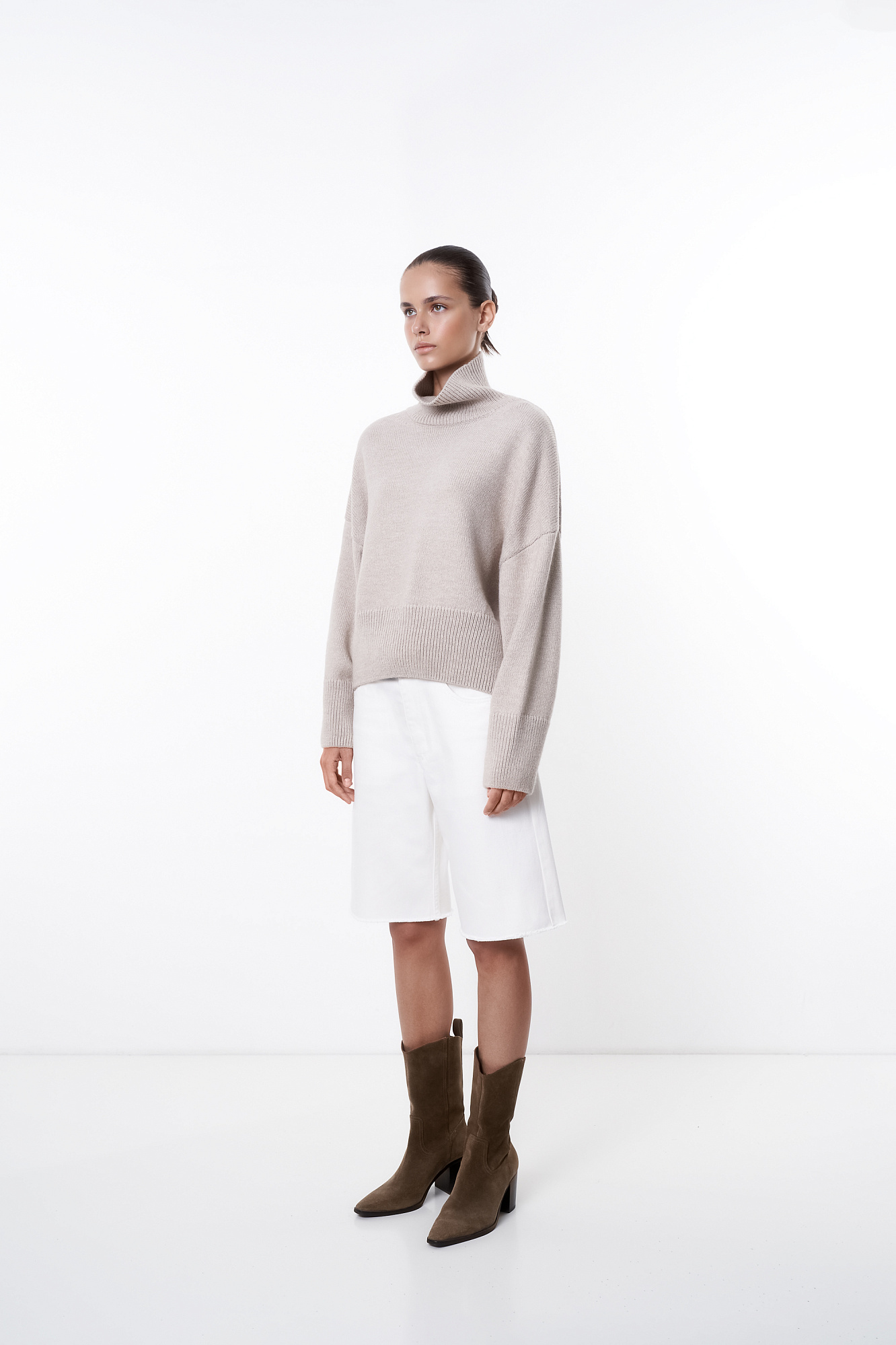 Трикотажный джемпер с шерстью альпака. Модель свободного силуэта с высоким воротником, спущенной линией плеча и длинными рукавами. Манжеты и низ изделия в рубчик.