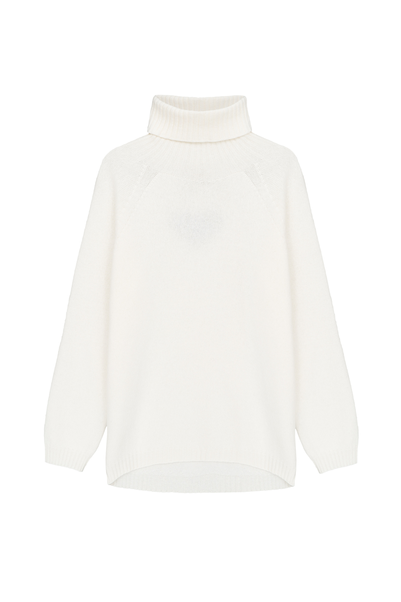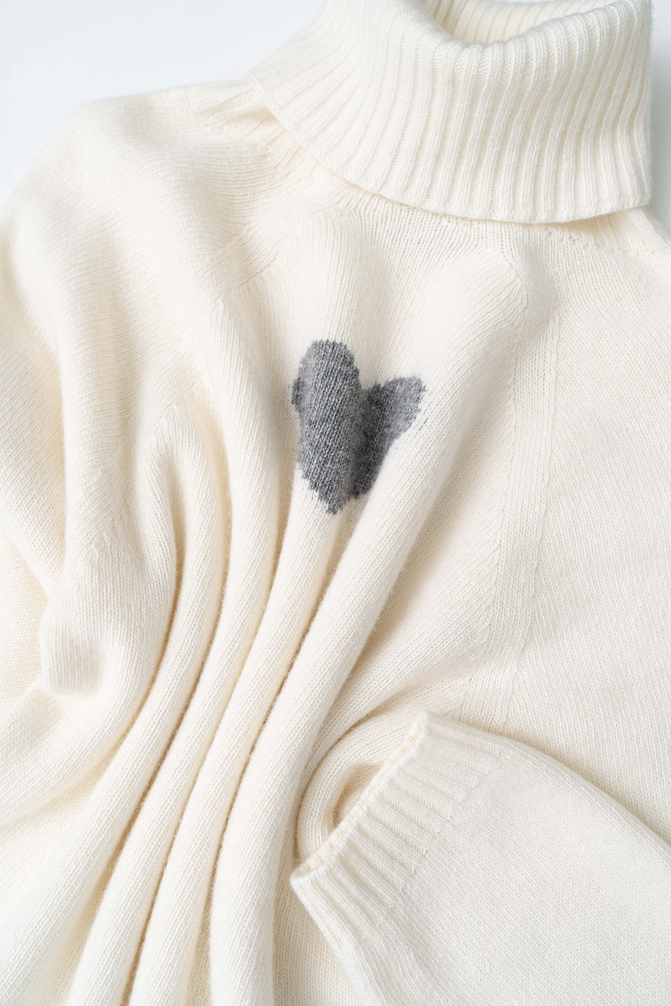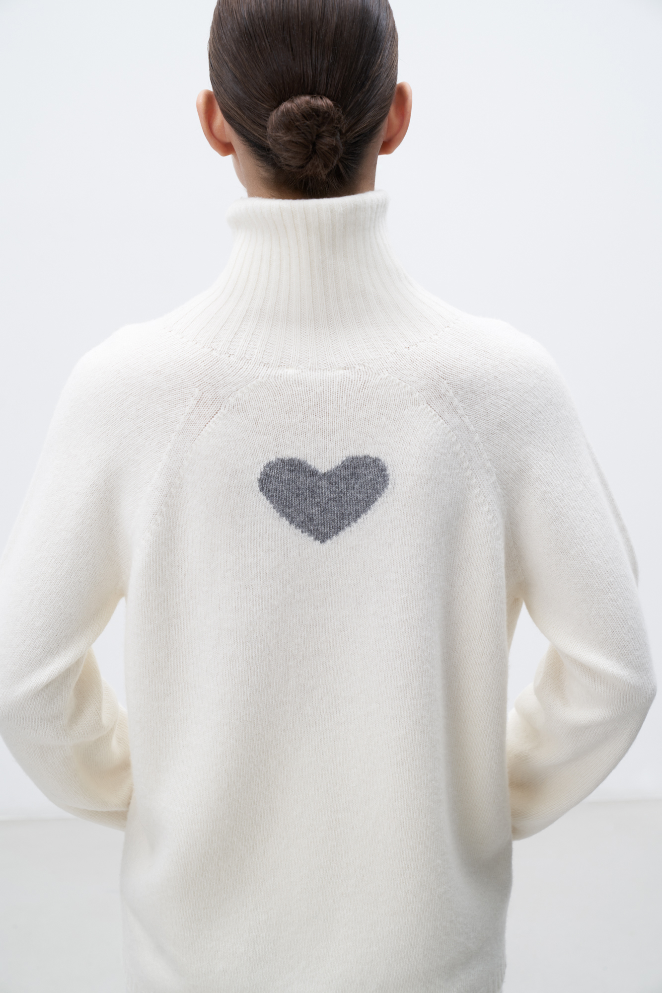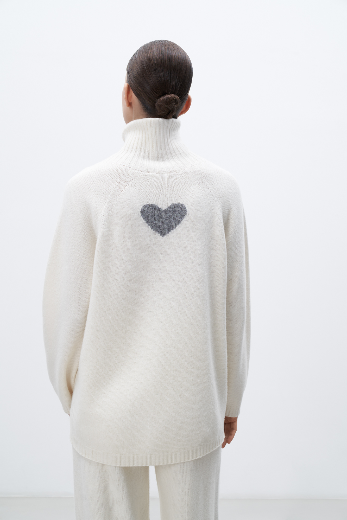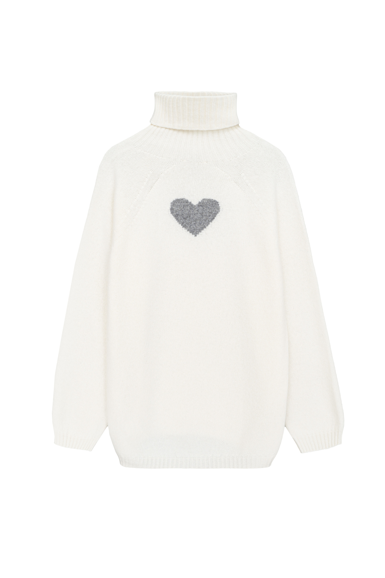 Трикотажный oversize джемпер из шерсти с добавлением кашемира. Высокий воротник в рубчик, спущенный рукав и удлиненная спинка с жаккардовым рисунком в виде сердца.