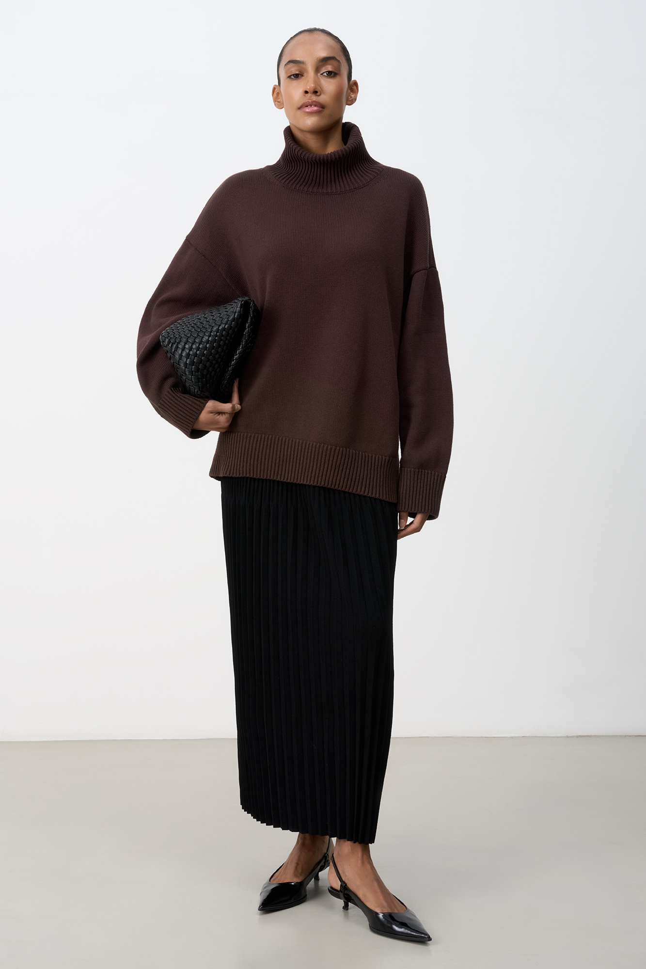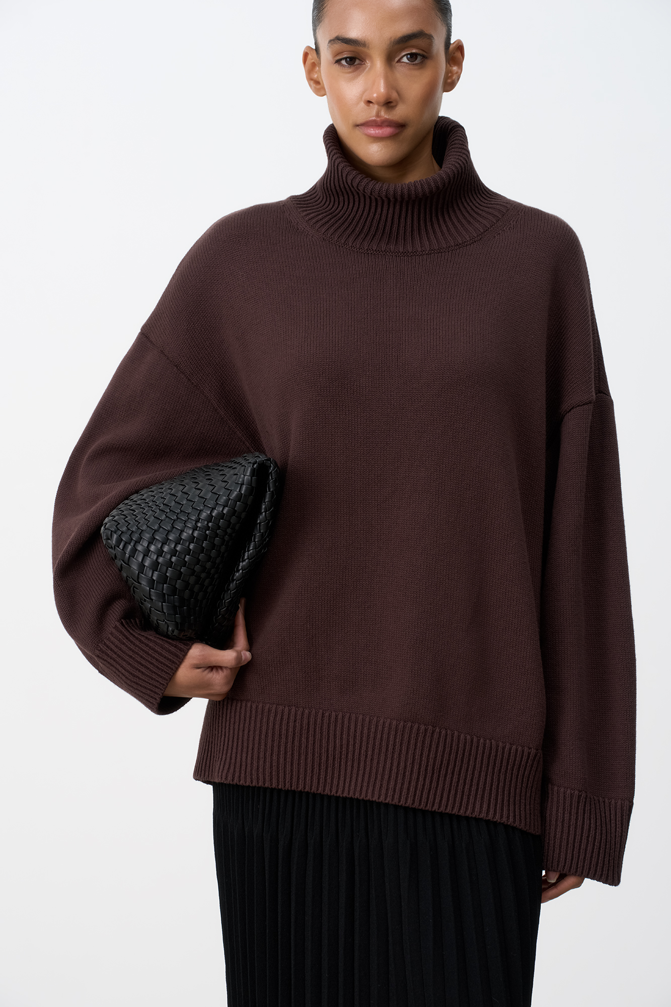 Трикотажный джемпер из 100% хлопка. Модель свободного силуэта со спущенной линией плеча и высоким объемным воротом.