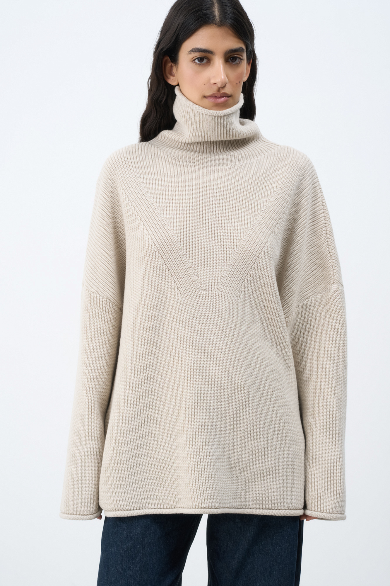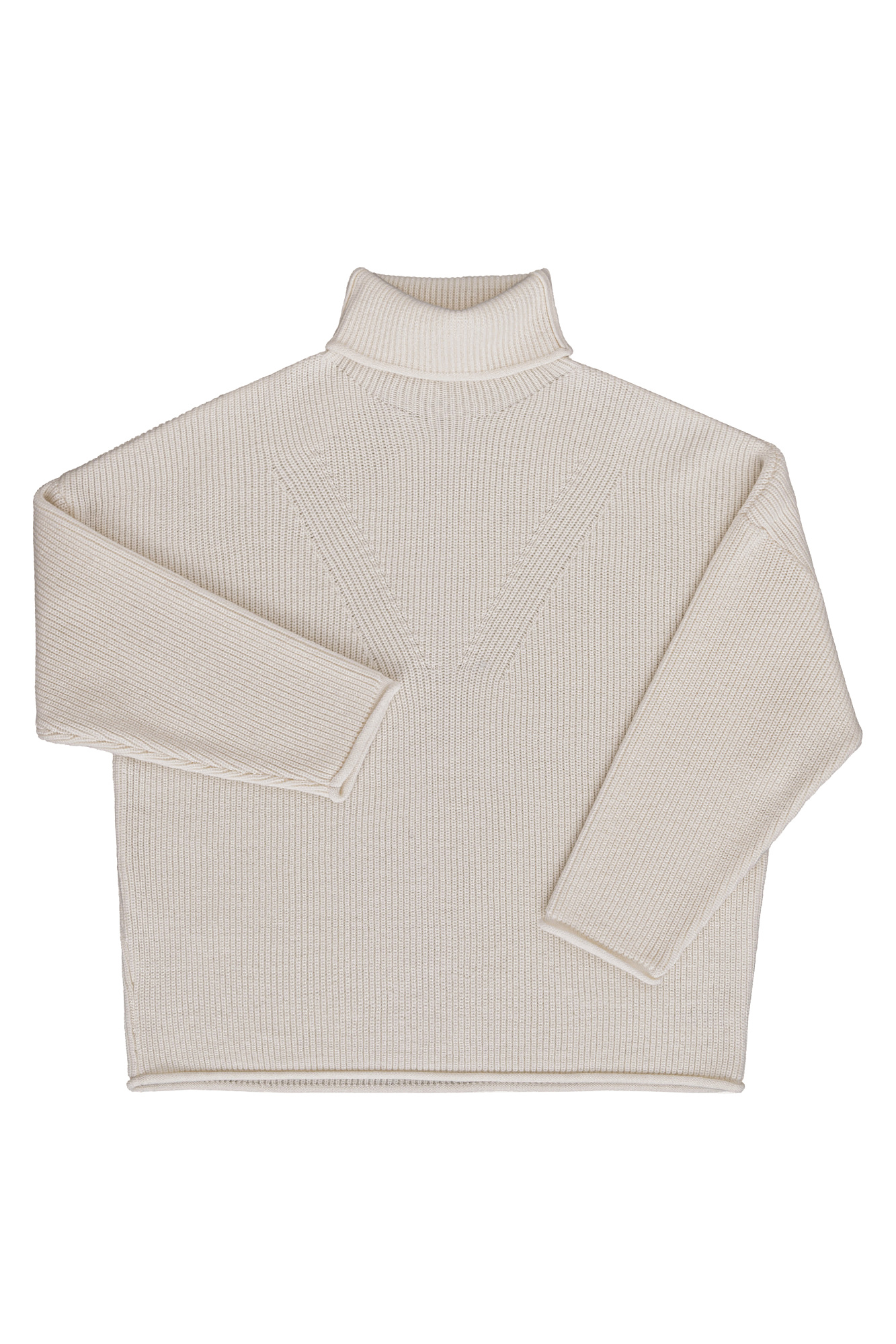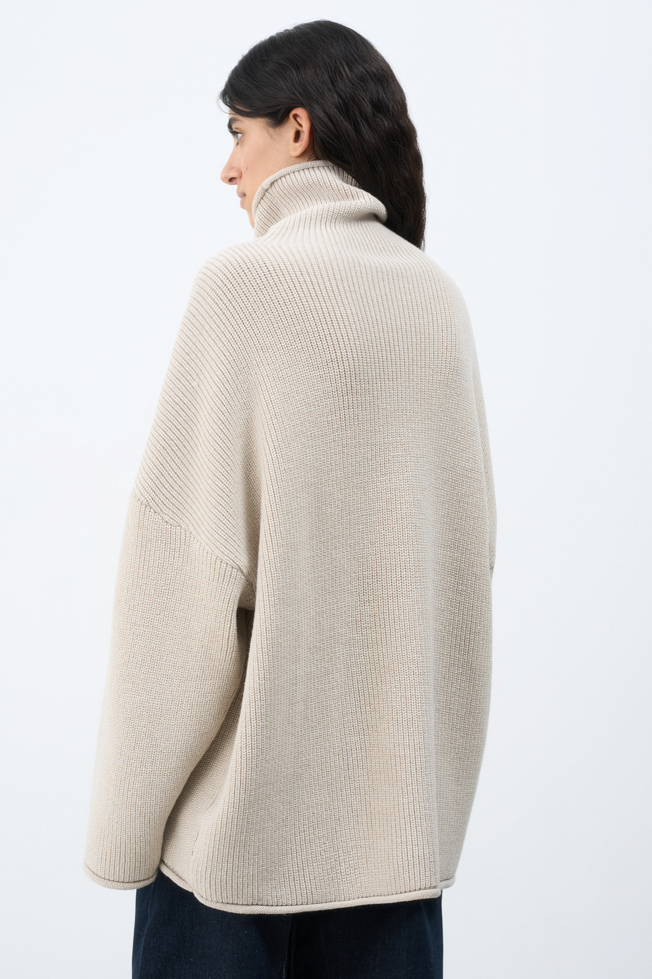 Трикотажный джемпер с высоким воротом. Модель свободного силуэта со спущенной линией плеча и декоративными сбавками.
