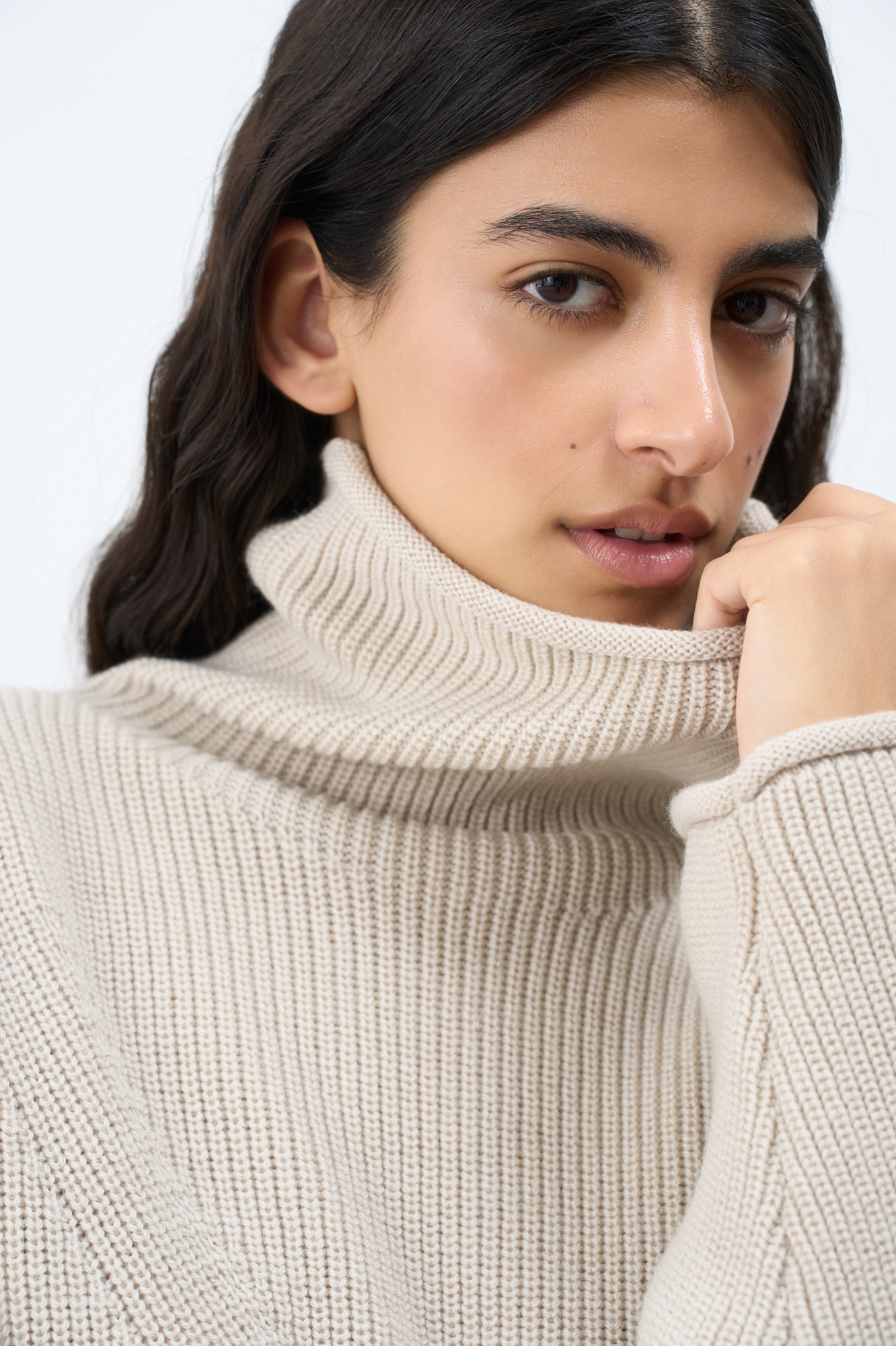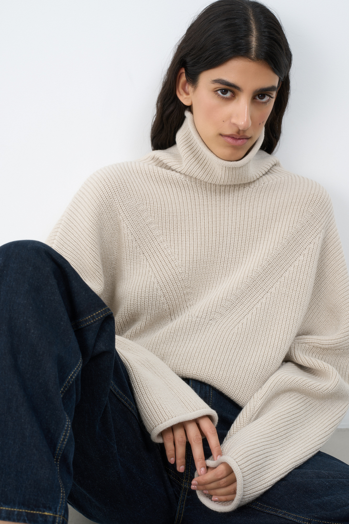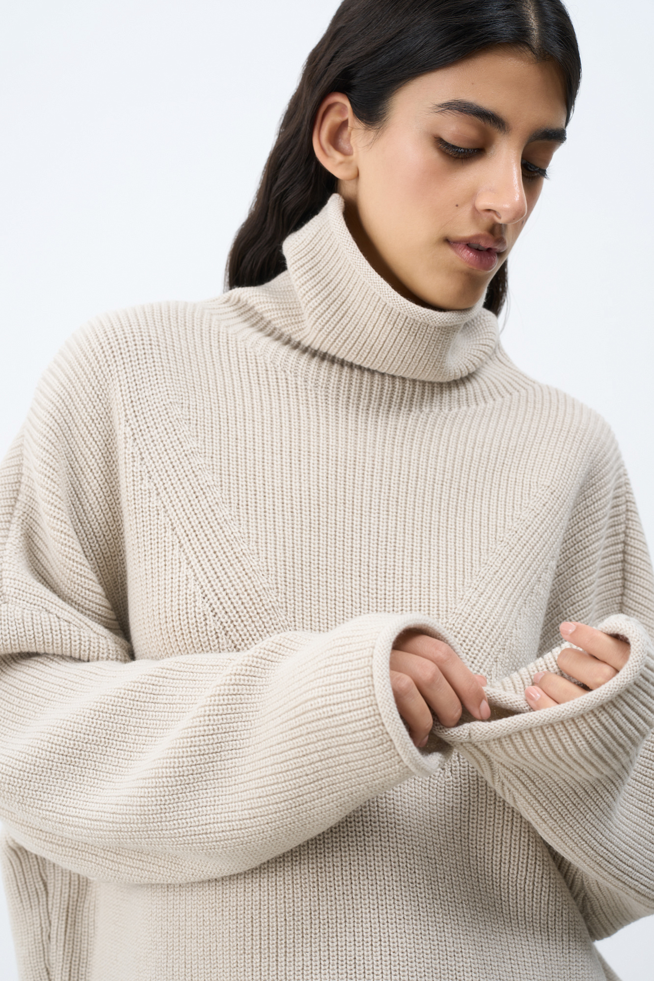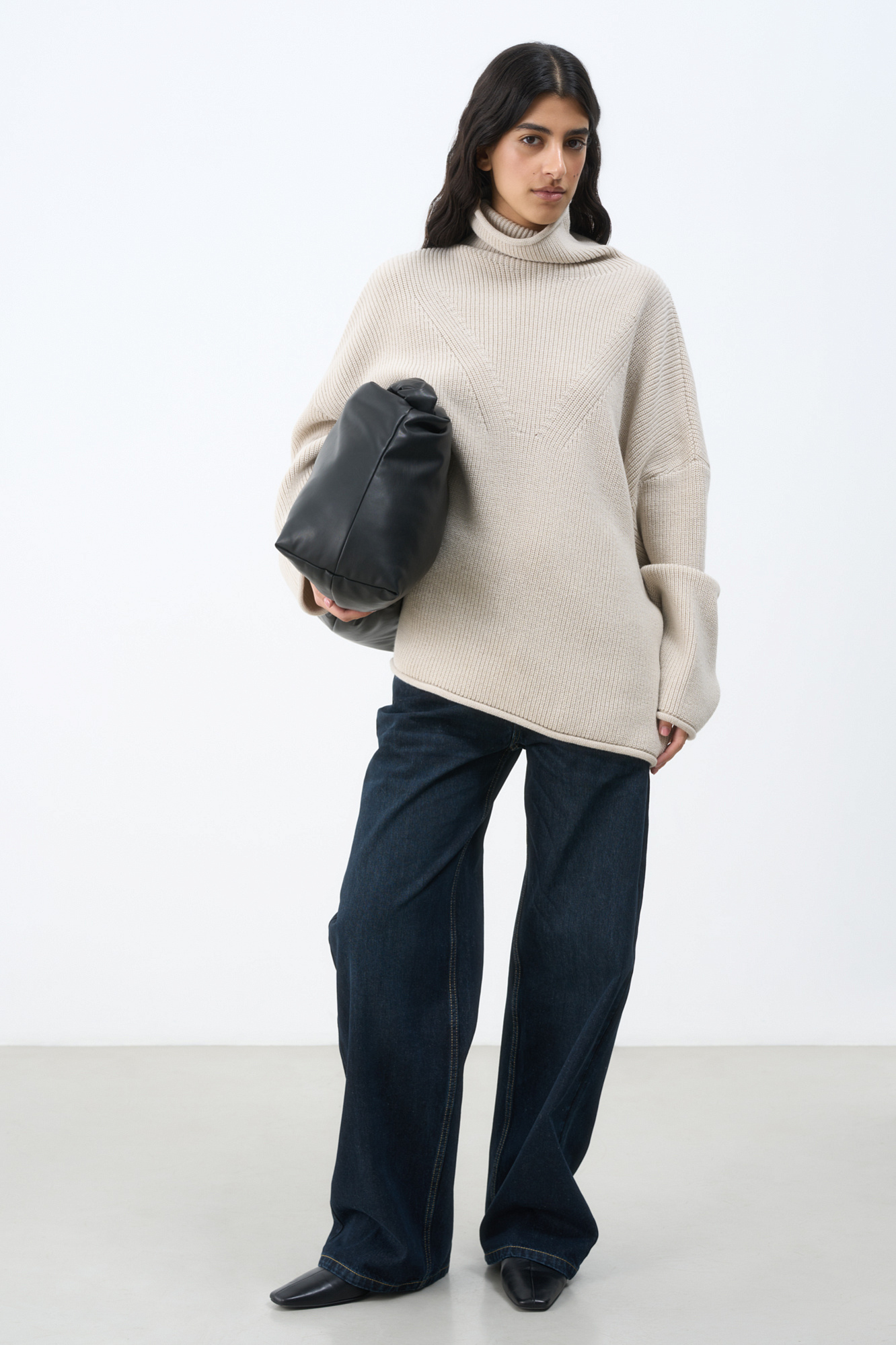 Трикотажный джемпер с высоким воротом. Модель свободного силуэта со спущенной линией плеча и декоративными сбавками.