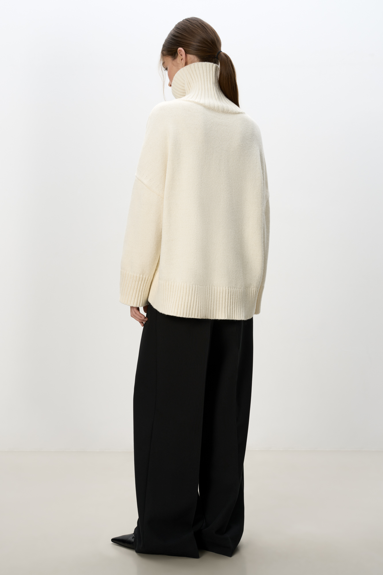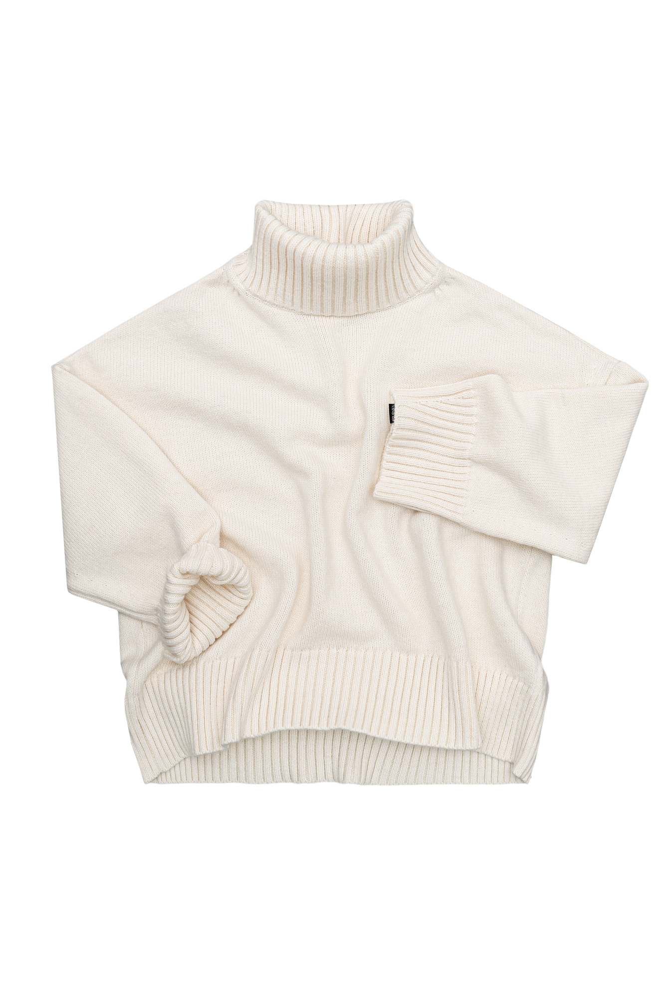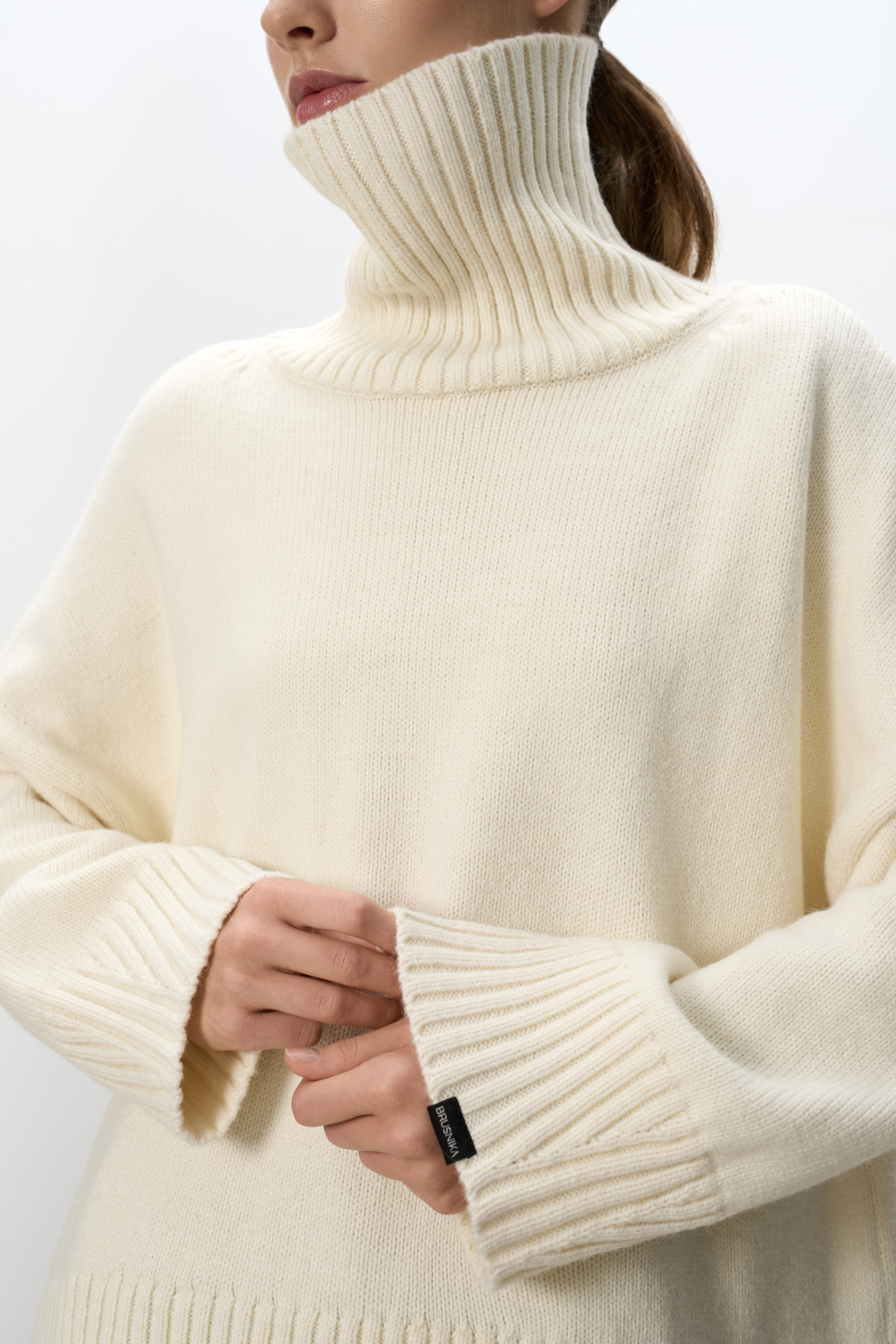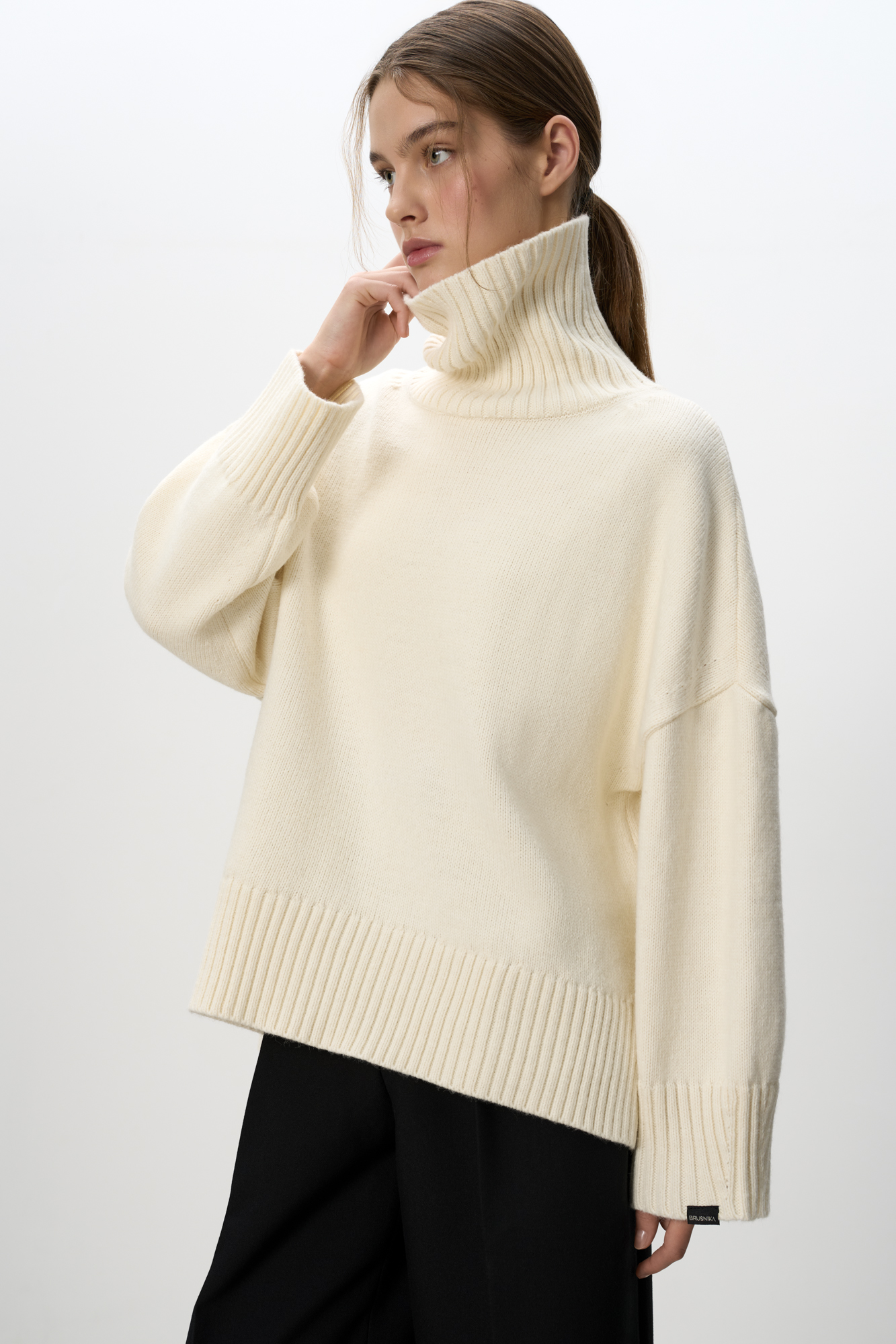 Объемный трикотажный джемпер из шерсти альпака. Модель свободного силуэта, со спущенной линией плеча и высоким воротом. Края изделия выполнены в широкий рубчик. Логотип бренда на манжете.