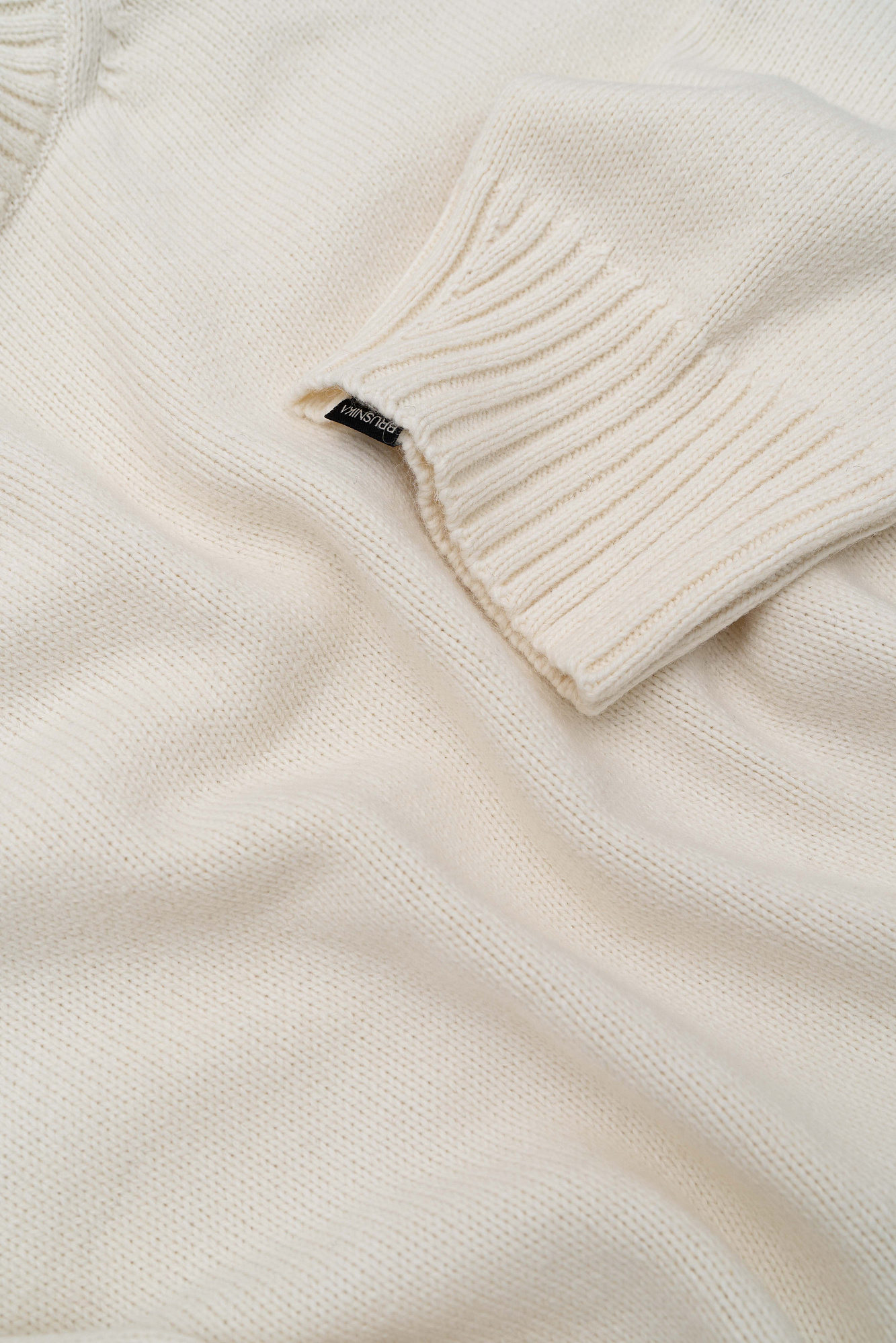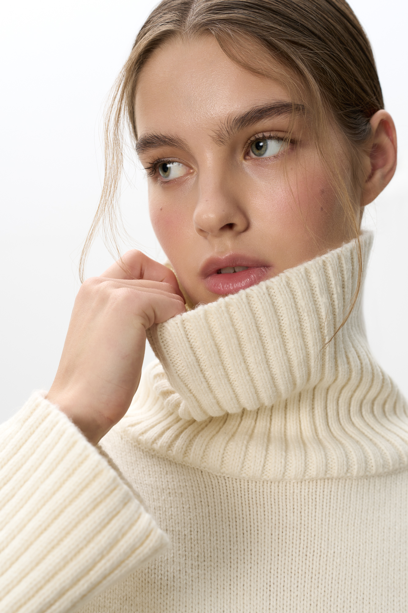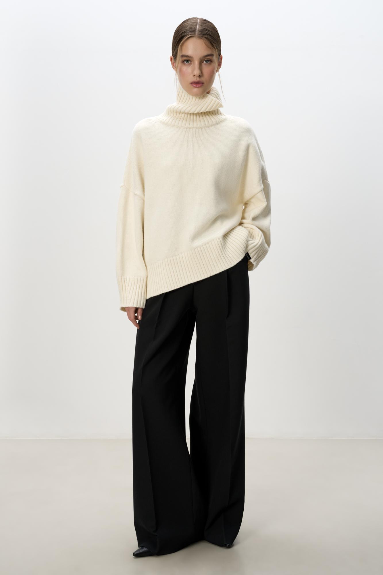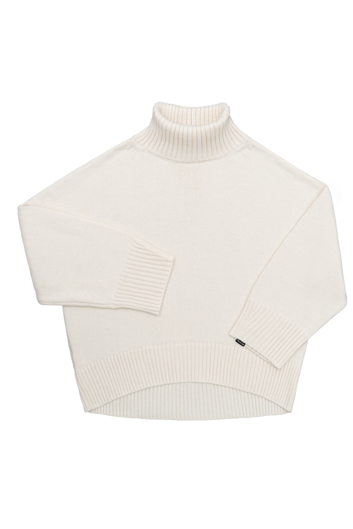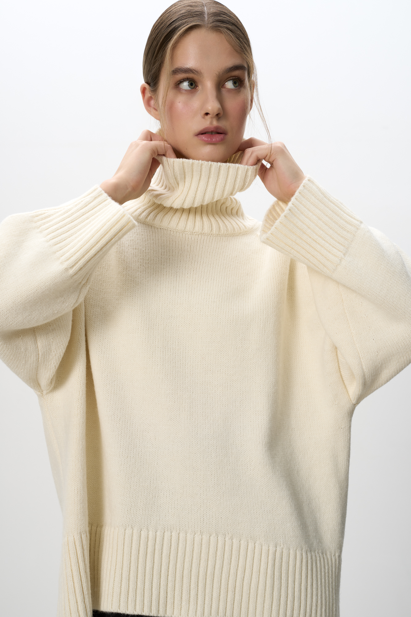 Объемный трикотажный джемпер из шерсти альпака. Модель свободного силуэта, со спущенной линией плеча и высоким воротом. Края изделия выполнены в широкий рубчик. Логотип бренда на манжете.