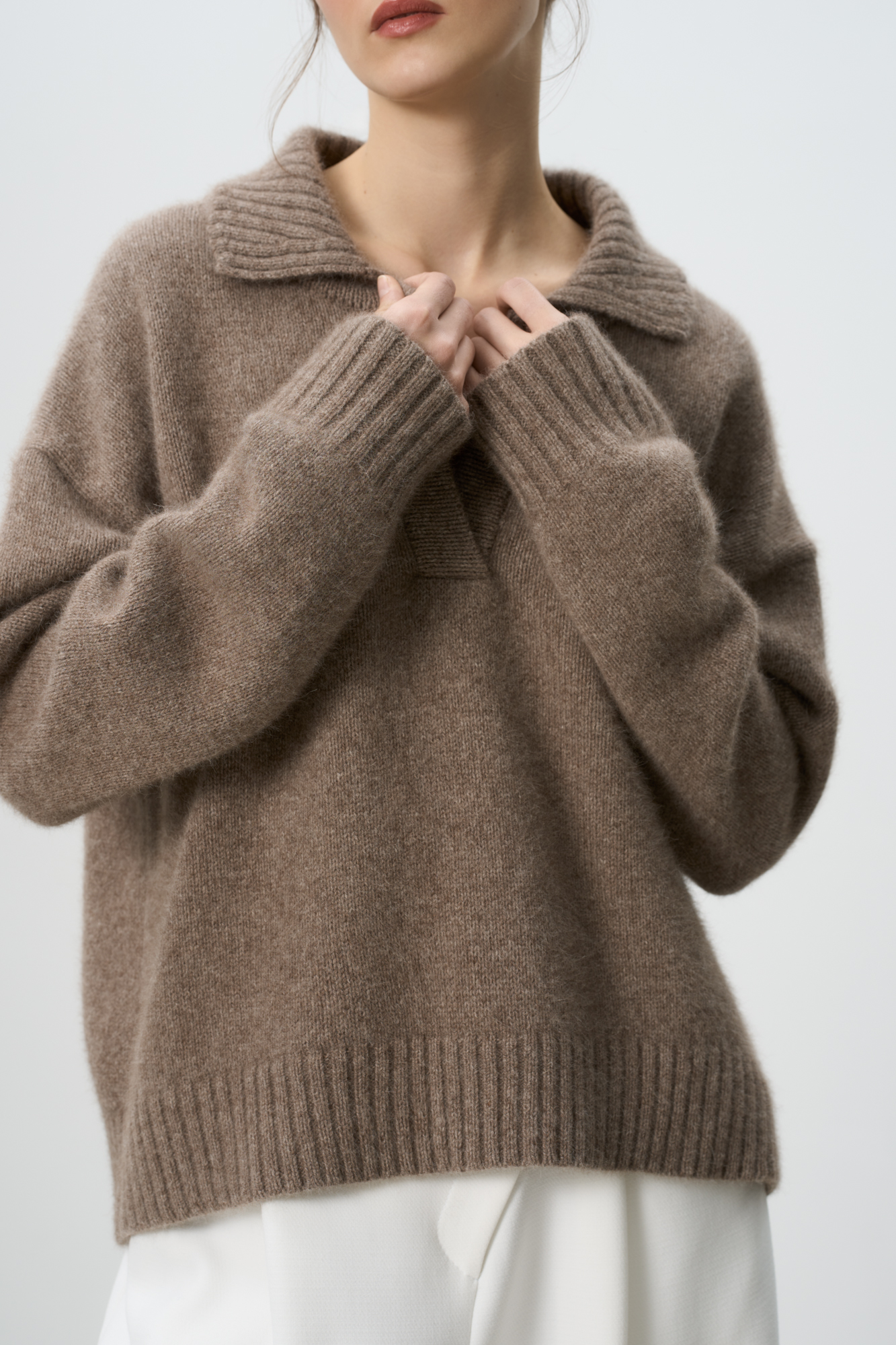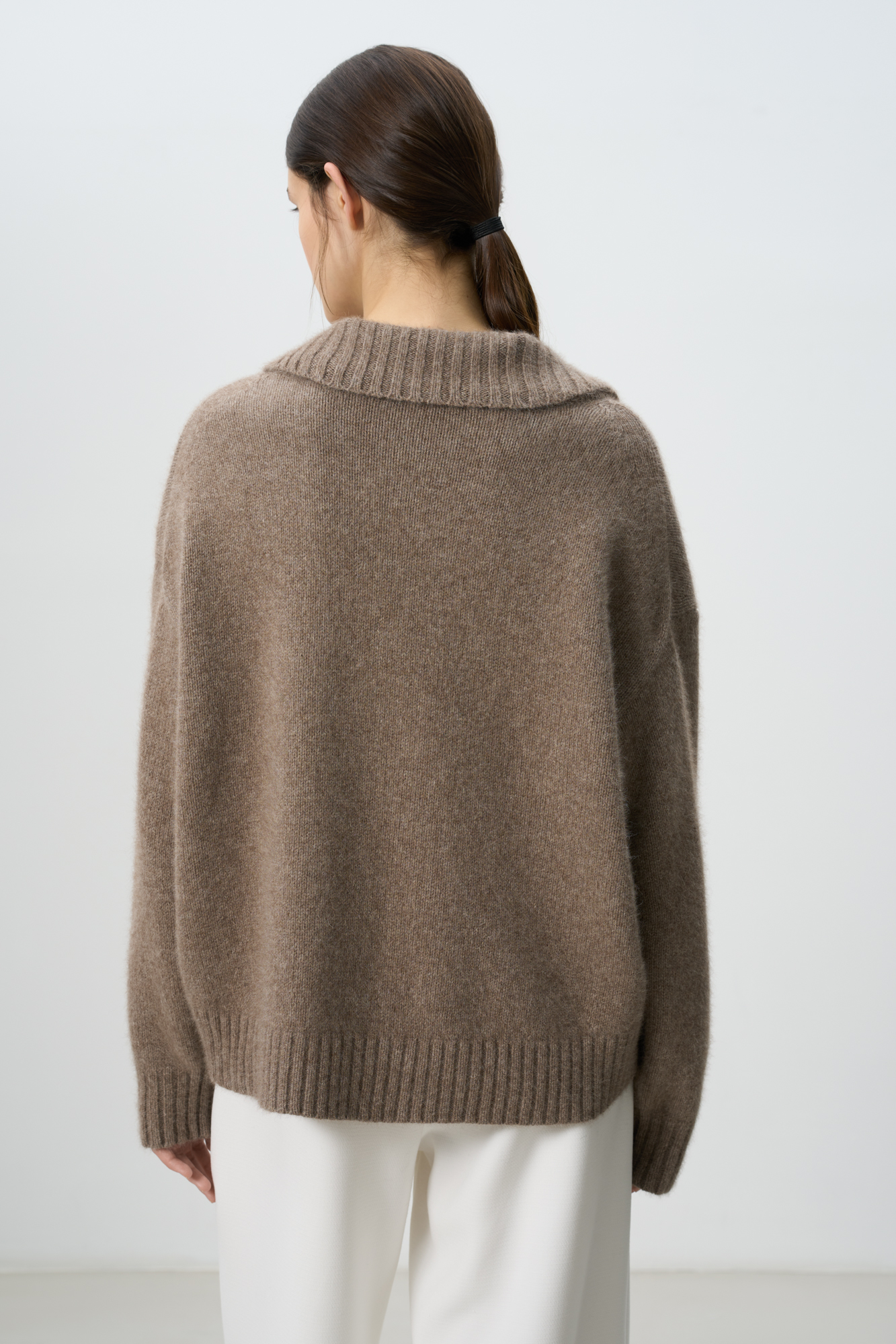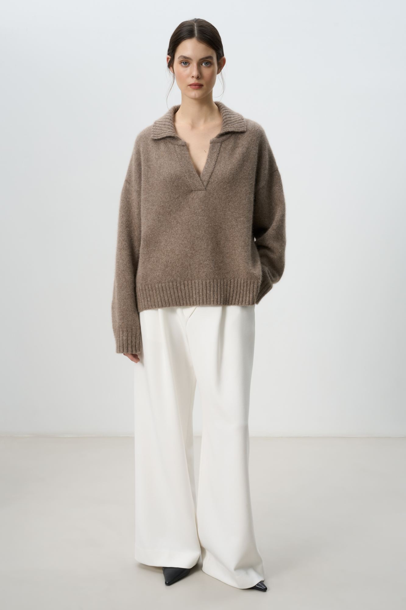 Трикотажный джемпер из смесовой шерсти с добавлением пуха лисы. Модель со спущенной линией плеча и отложным воротником с V-образным вырезом. Воротник, манжеты рукавов и низ изделия выполнены в рубчик.