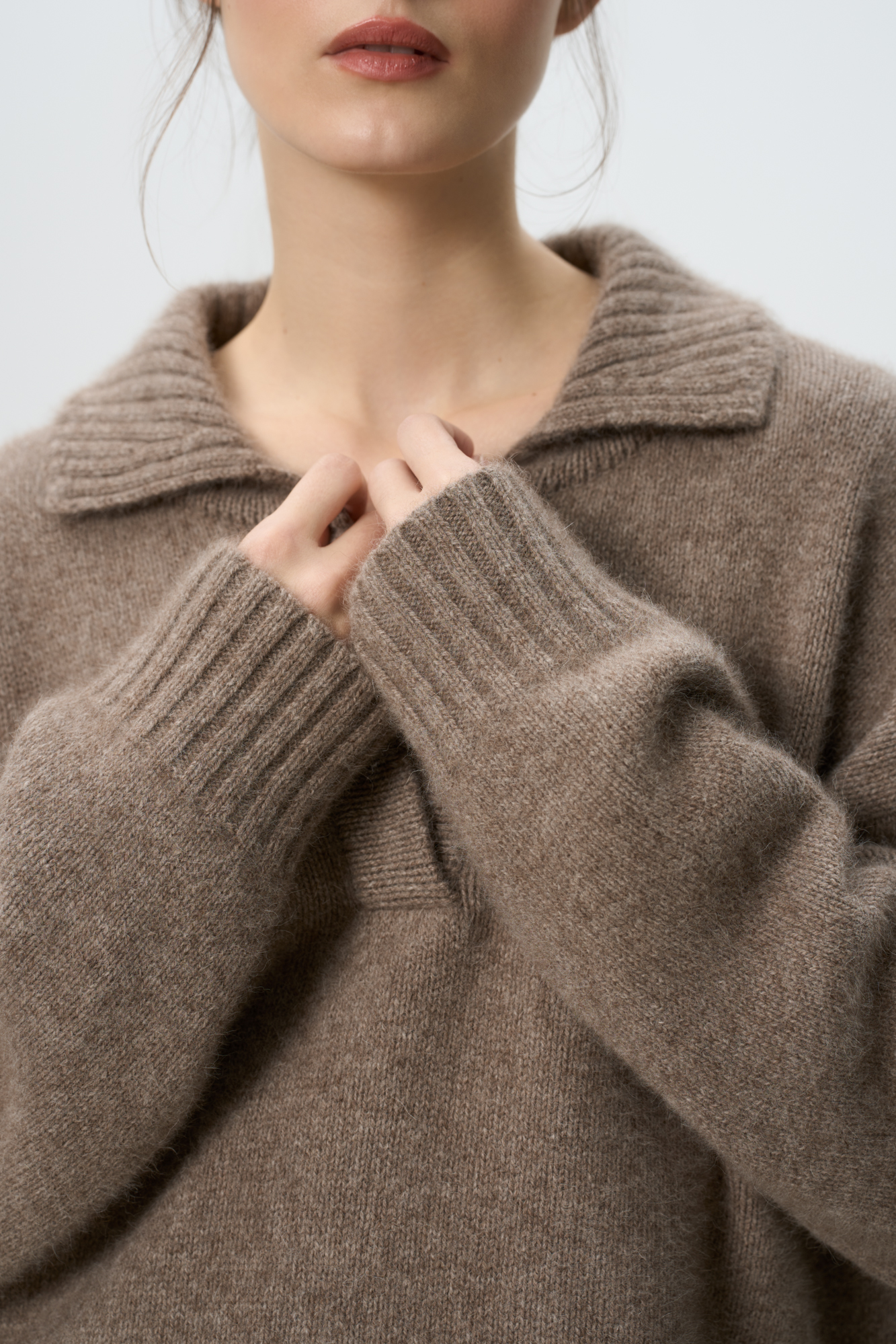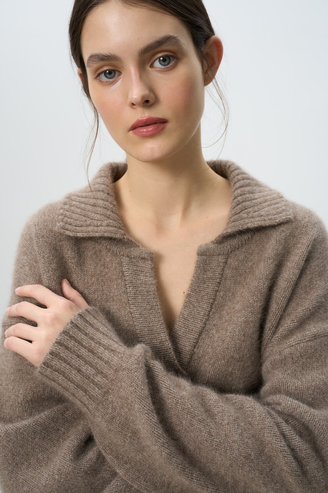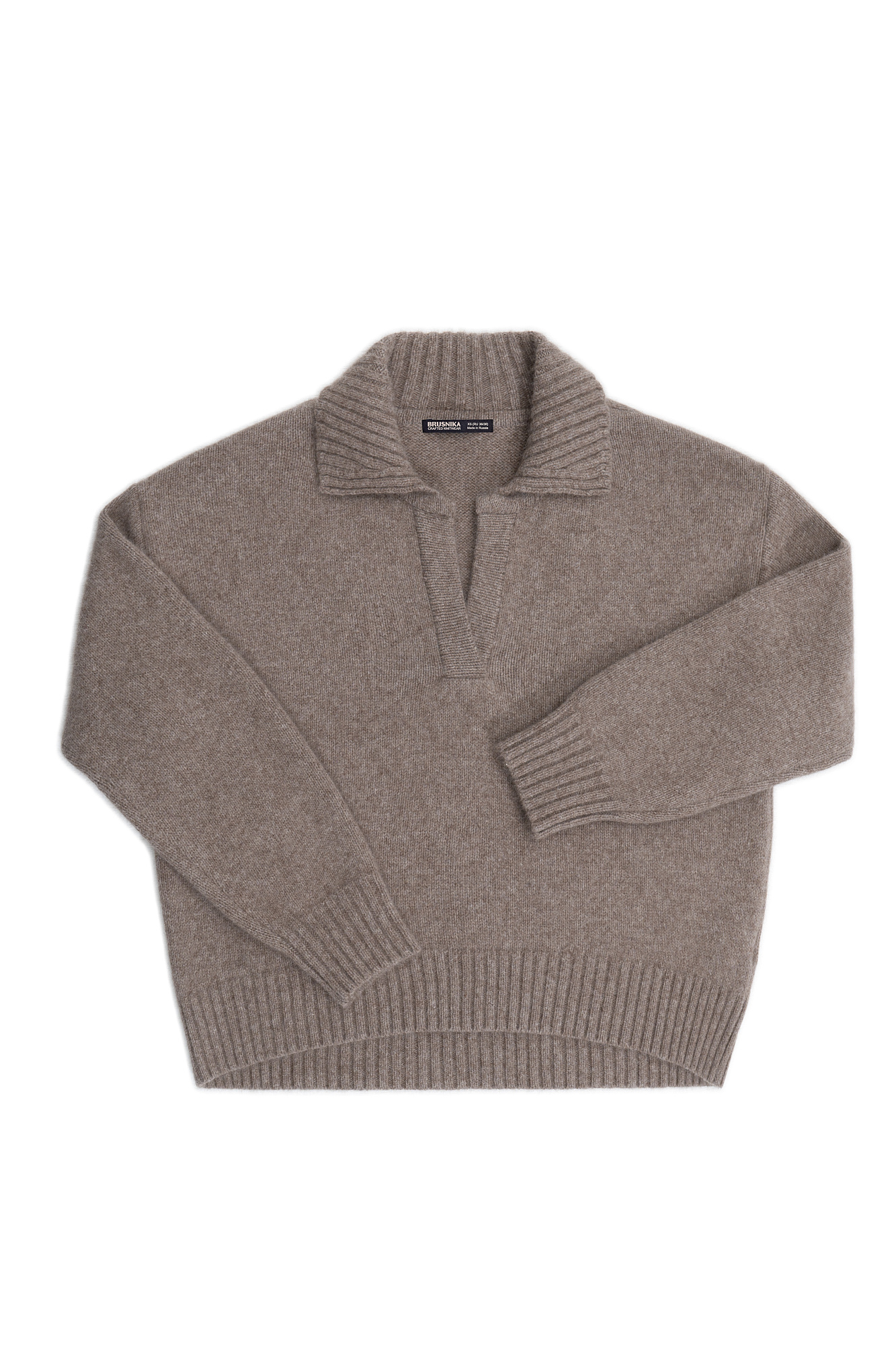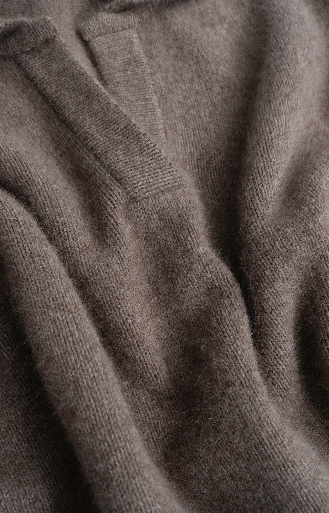 Трикотажный джемпер из смесовой шерсти с добавлением пуха лисы. Модель со спущенной линией плеча и отложным воротником с V-образным вырезом. Воротник, манжеты рукавов и низ изделия выполнены в рубчик.