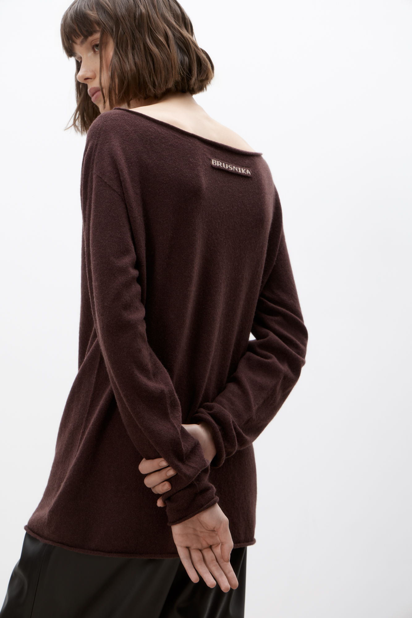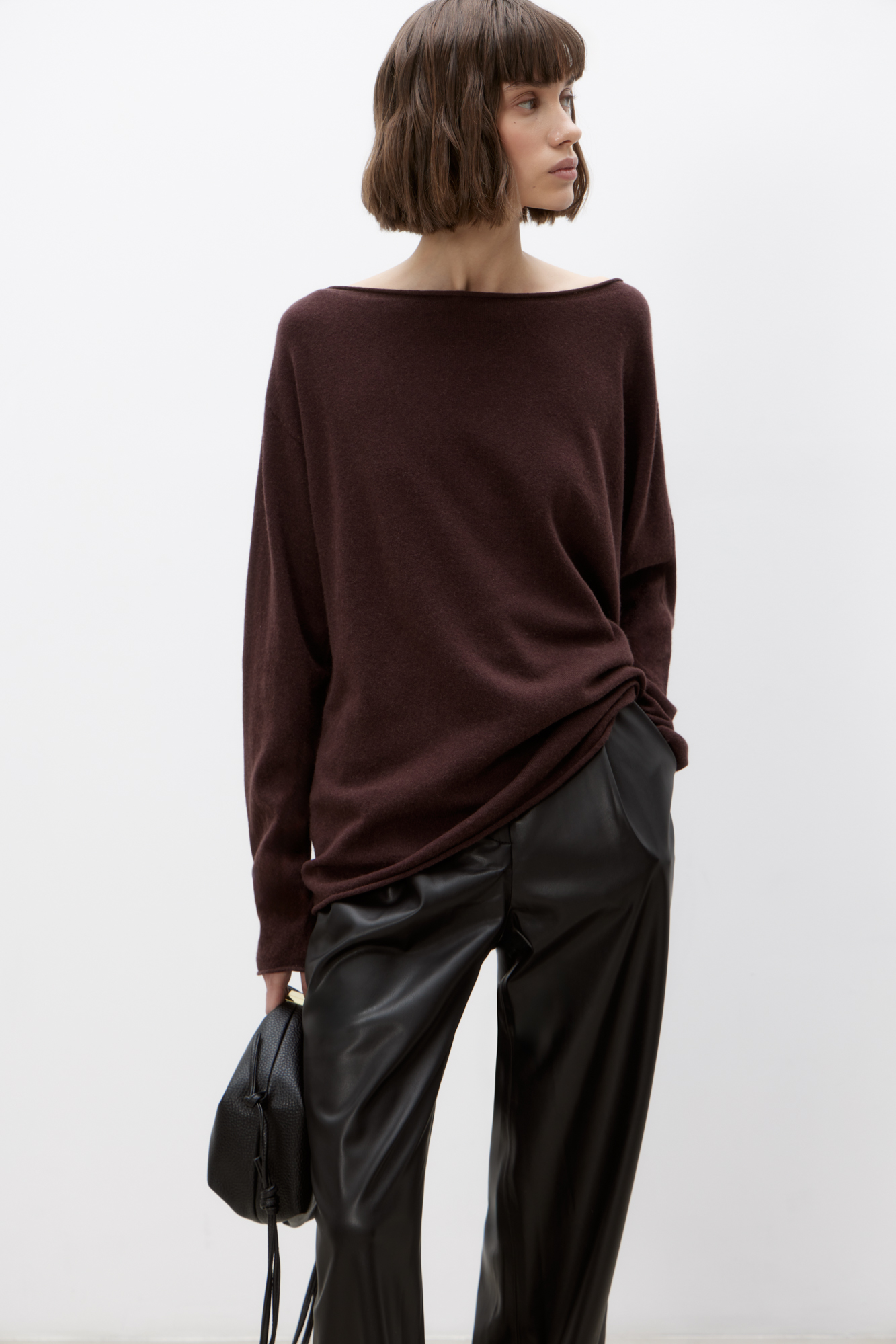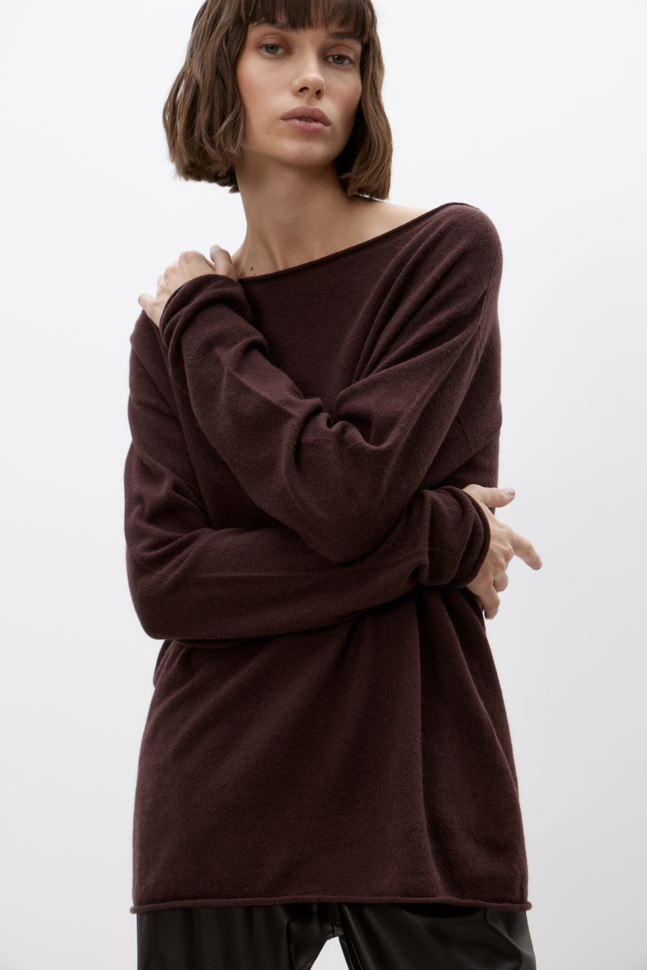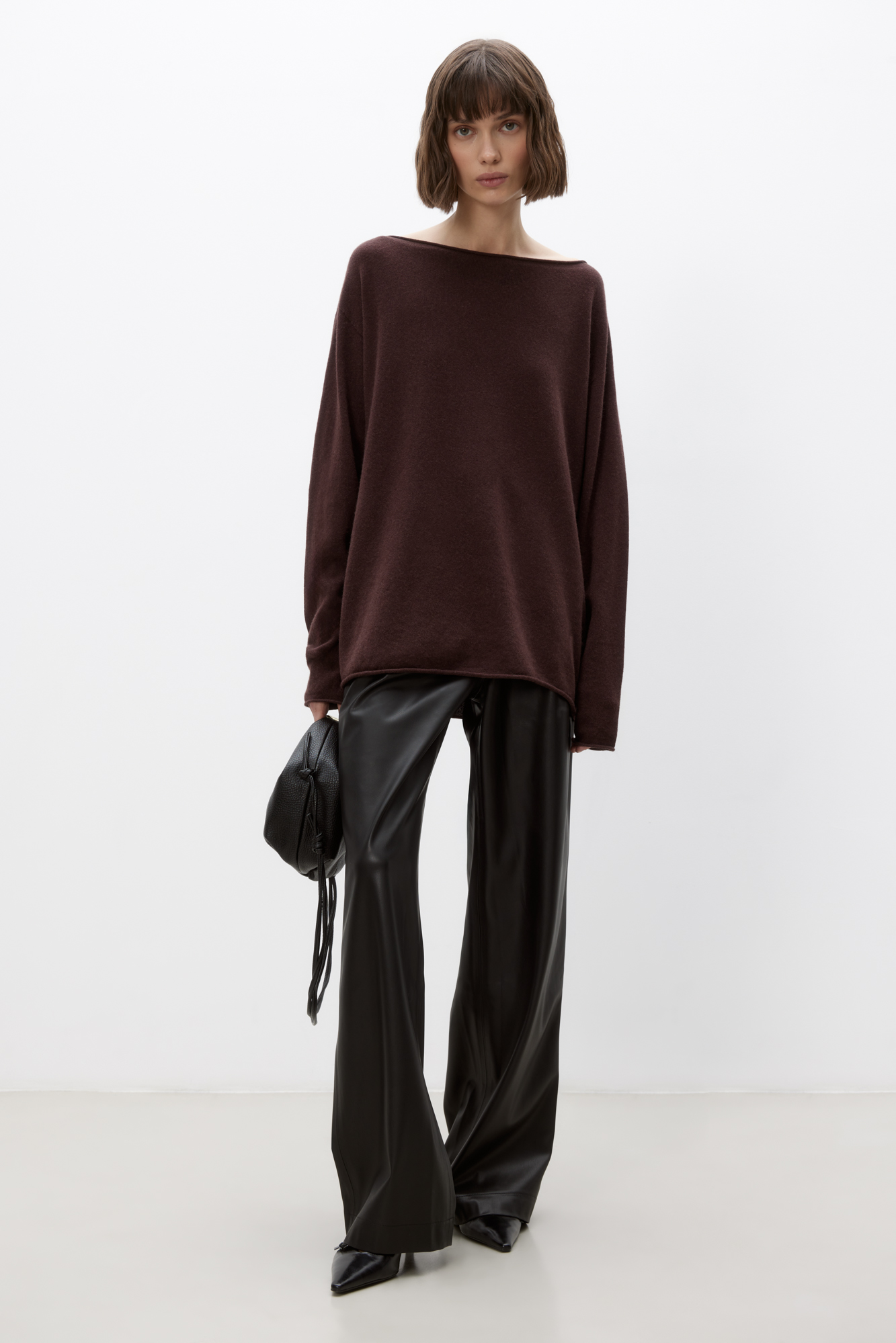 Трикотажный джемпер с закрученными краями из шерсти с добавлением кашемира. Модель свободного силуэта со спущенной линией плеча.