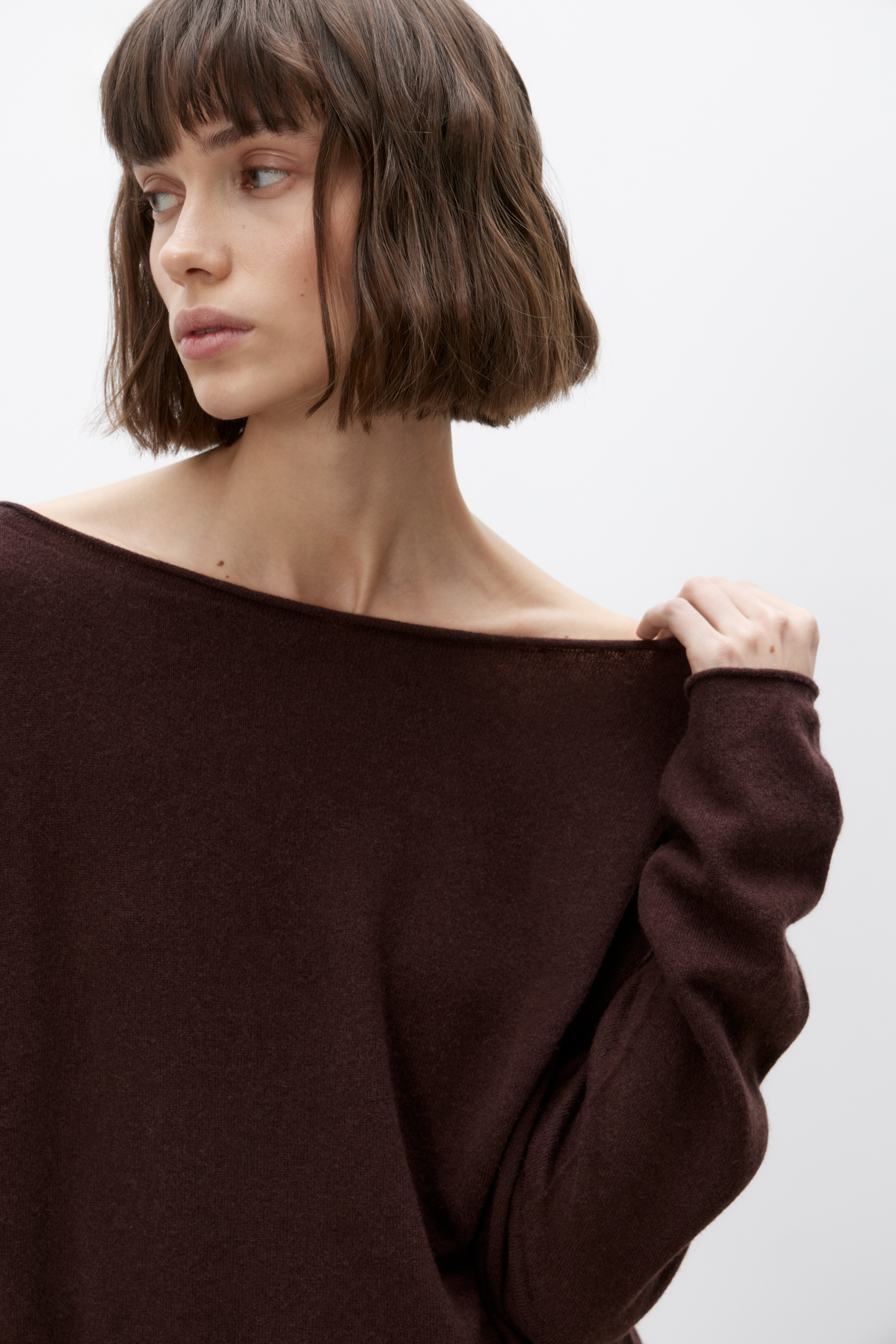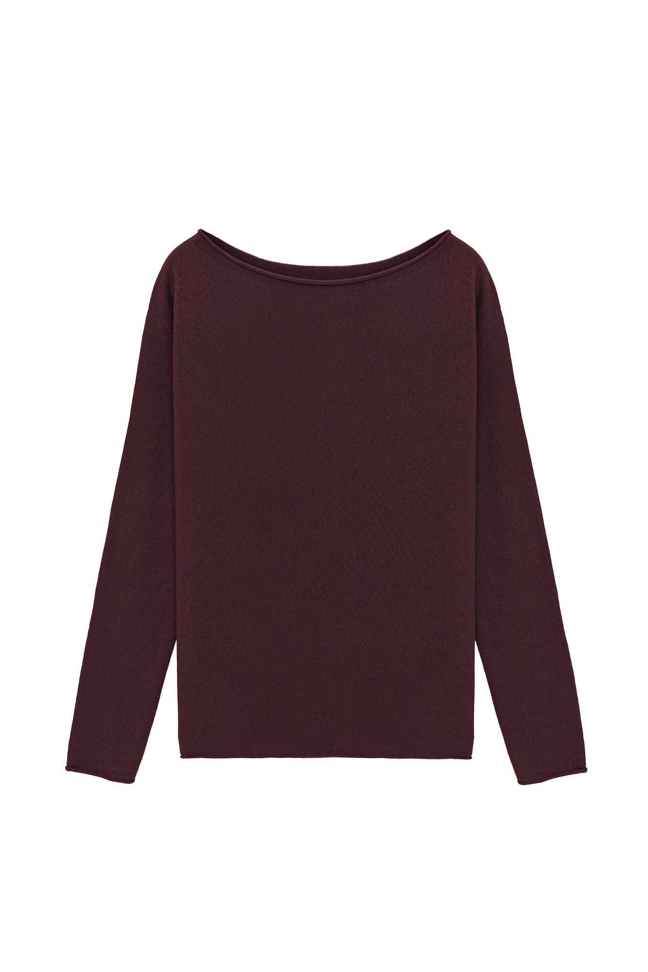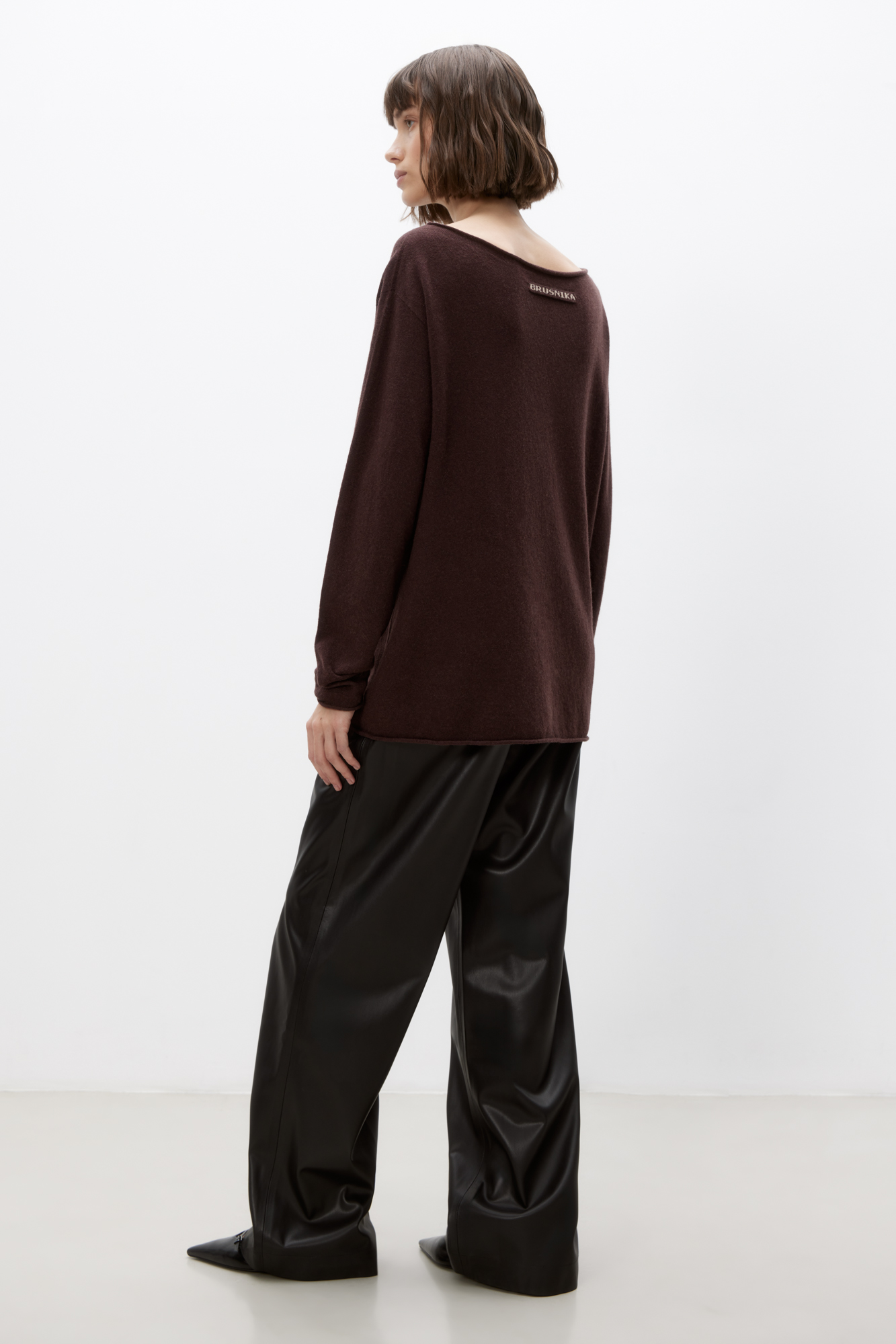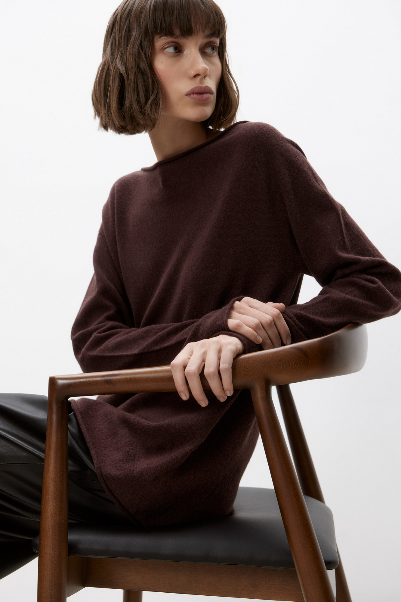 Трикотажный джемпер с закрученными краями из шерсти с добавлением кашемира. Модель свободного силуэта со спущенной линией плеча.