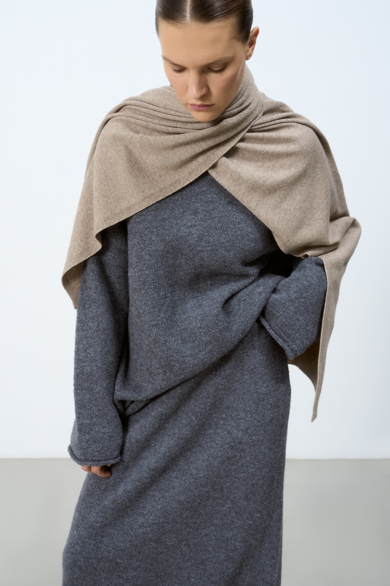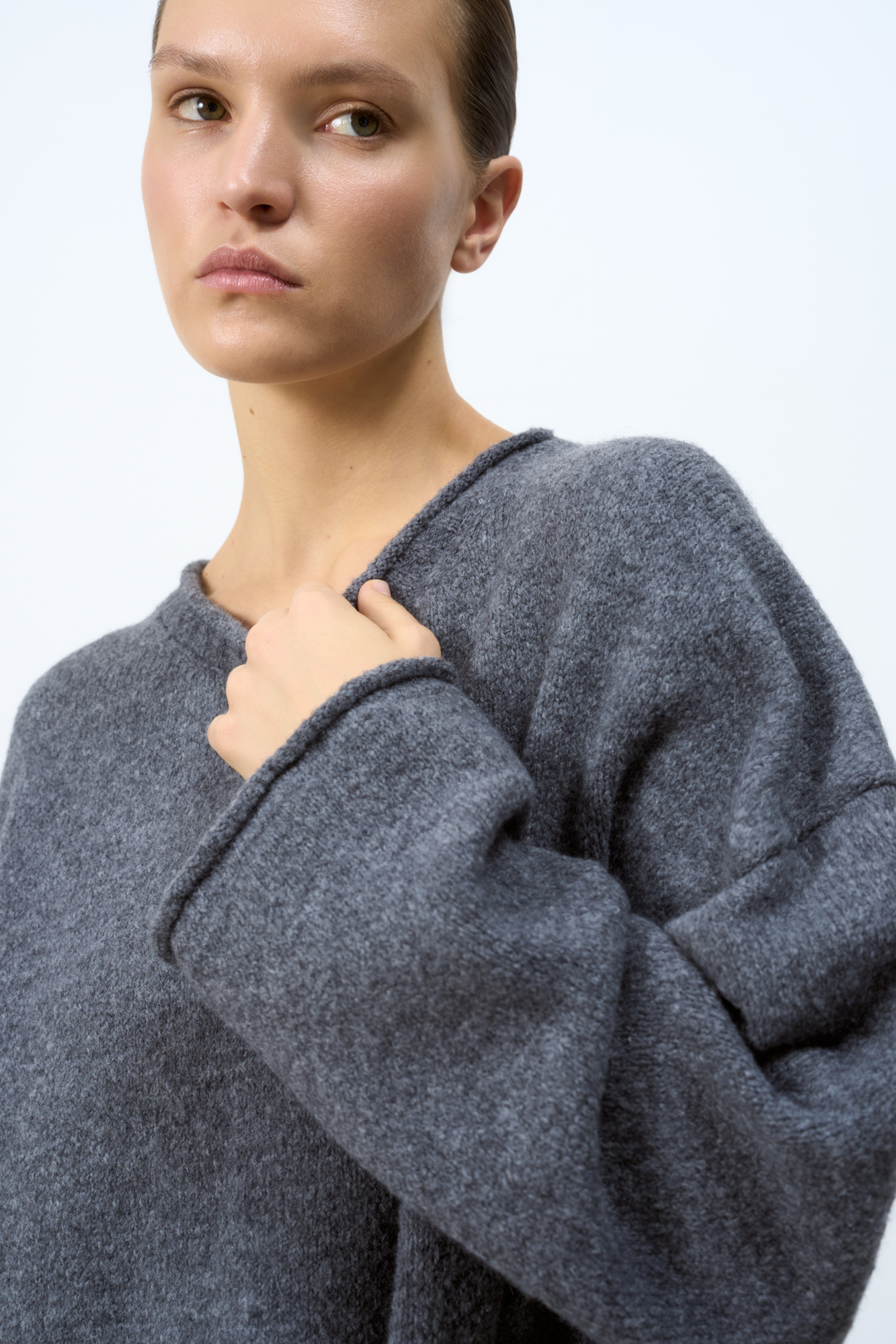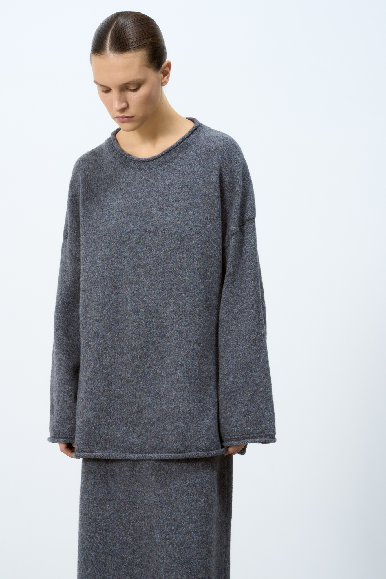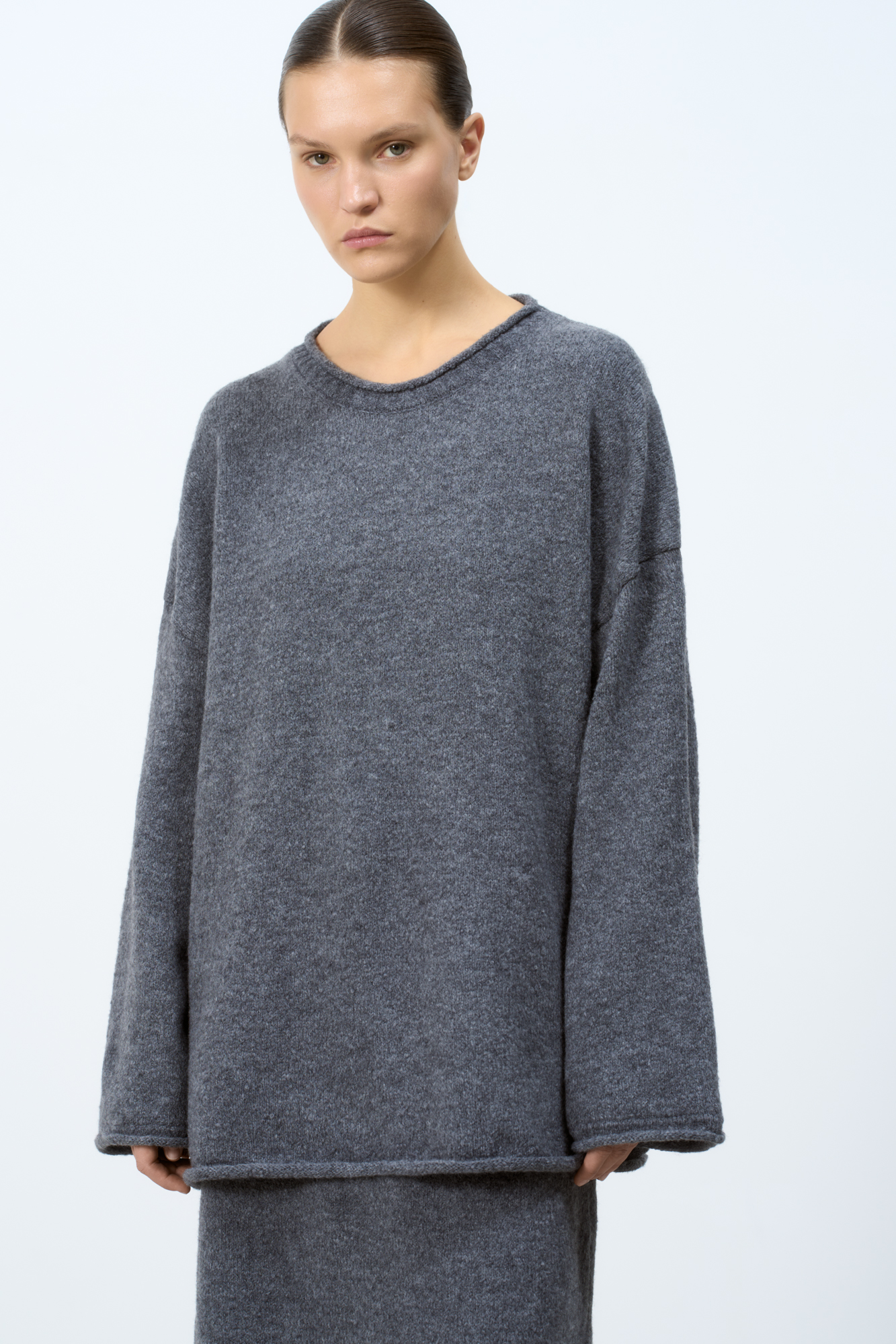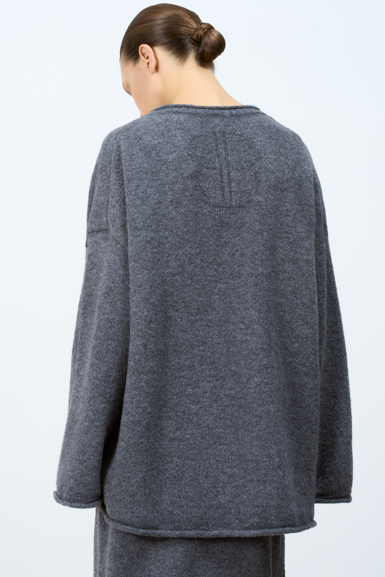 Трикотажный джемпер из шерсти альпака. Модель свободного силуэта со спущенной линией плеча и валиком по низу изделия. Дополнить образ можно юбкой в таком же стиле.