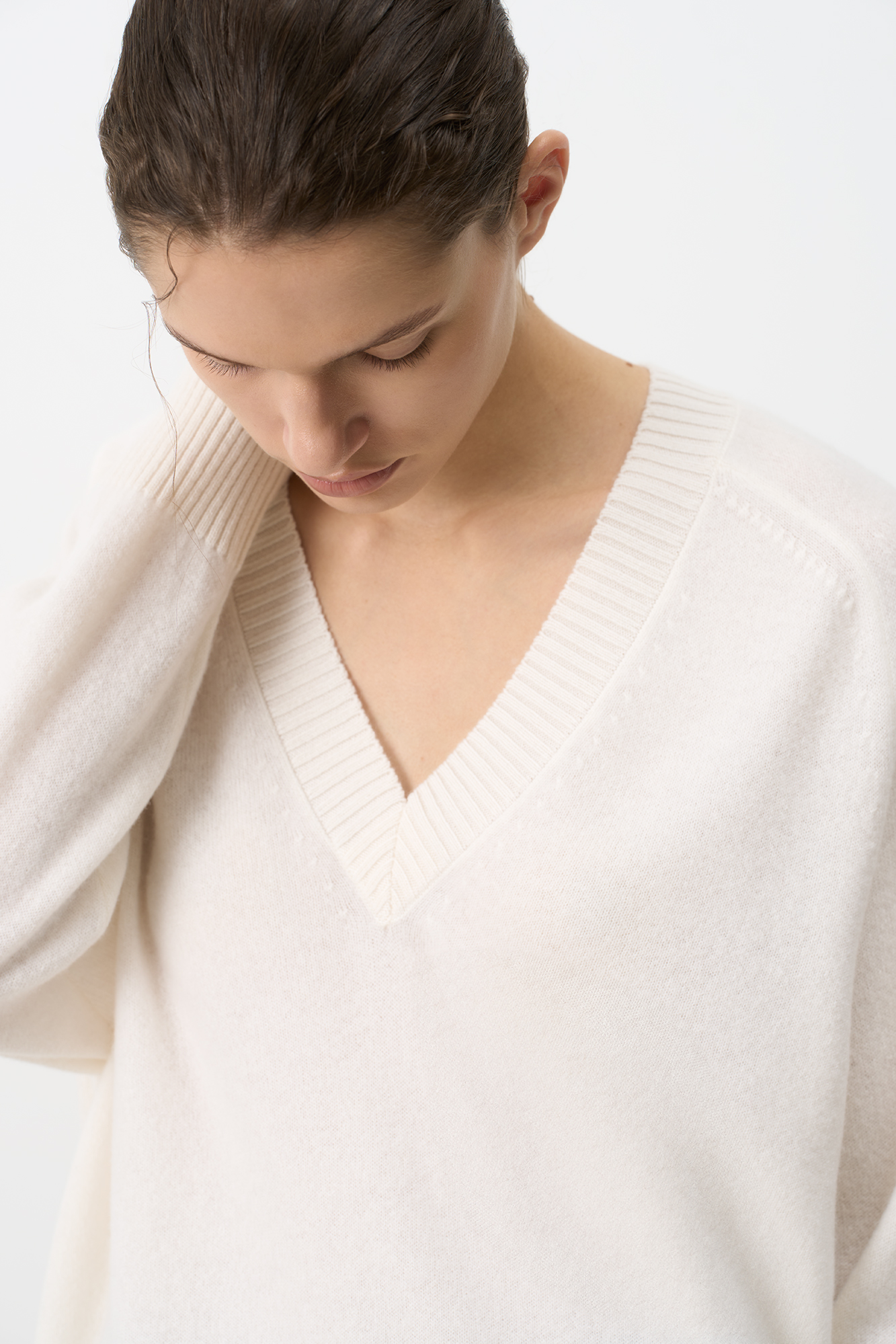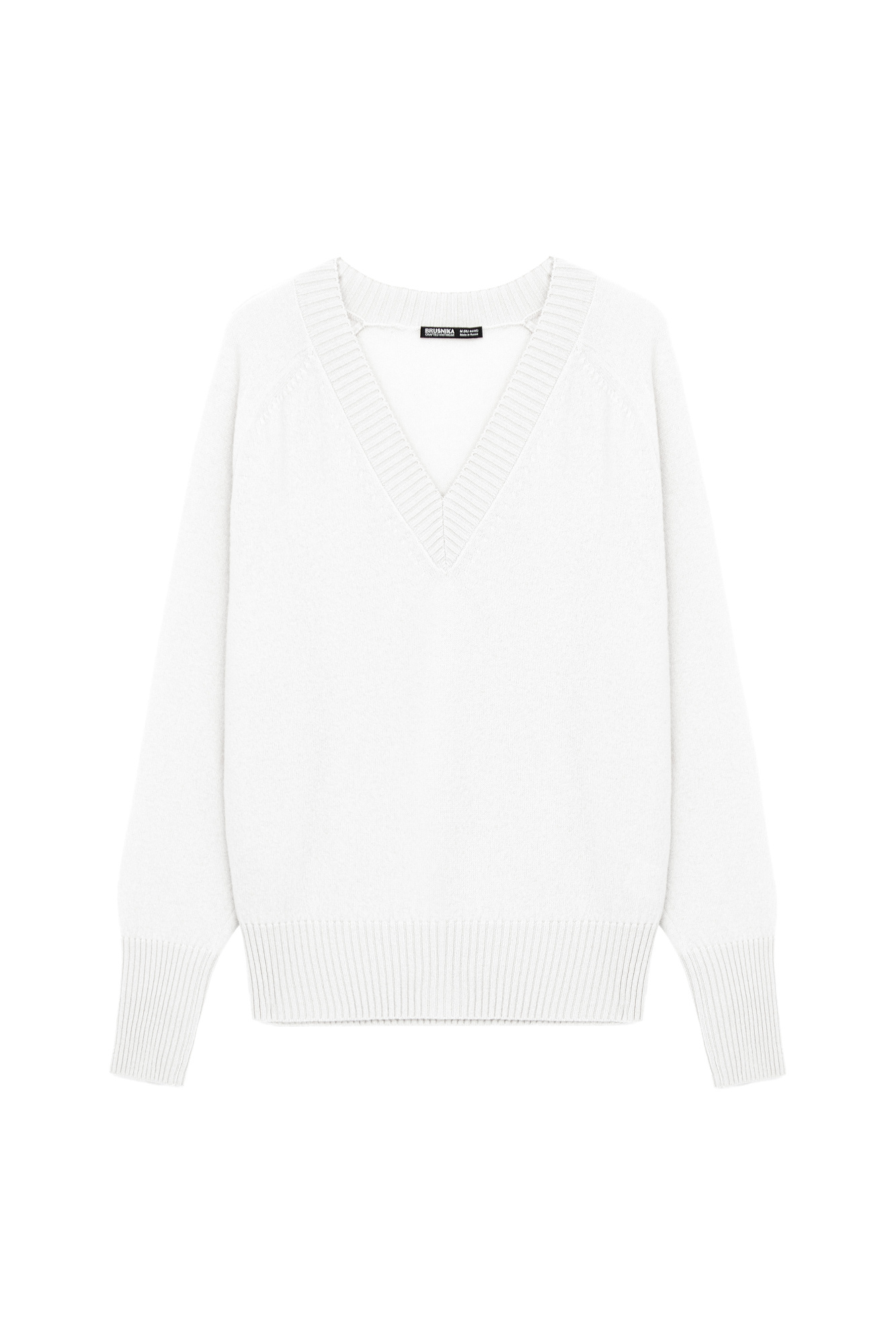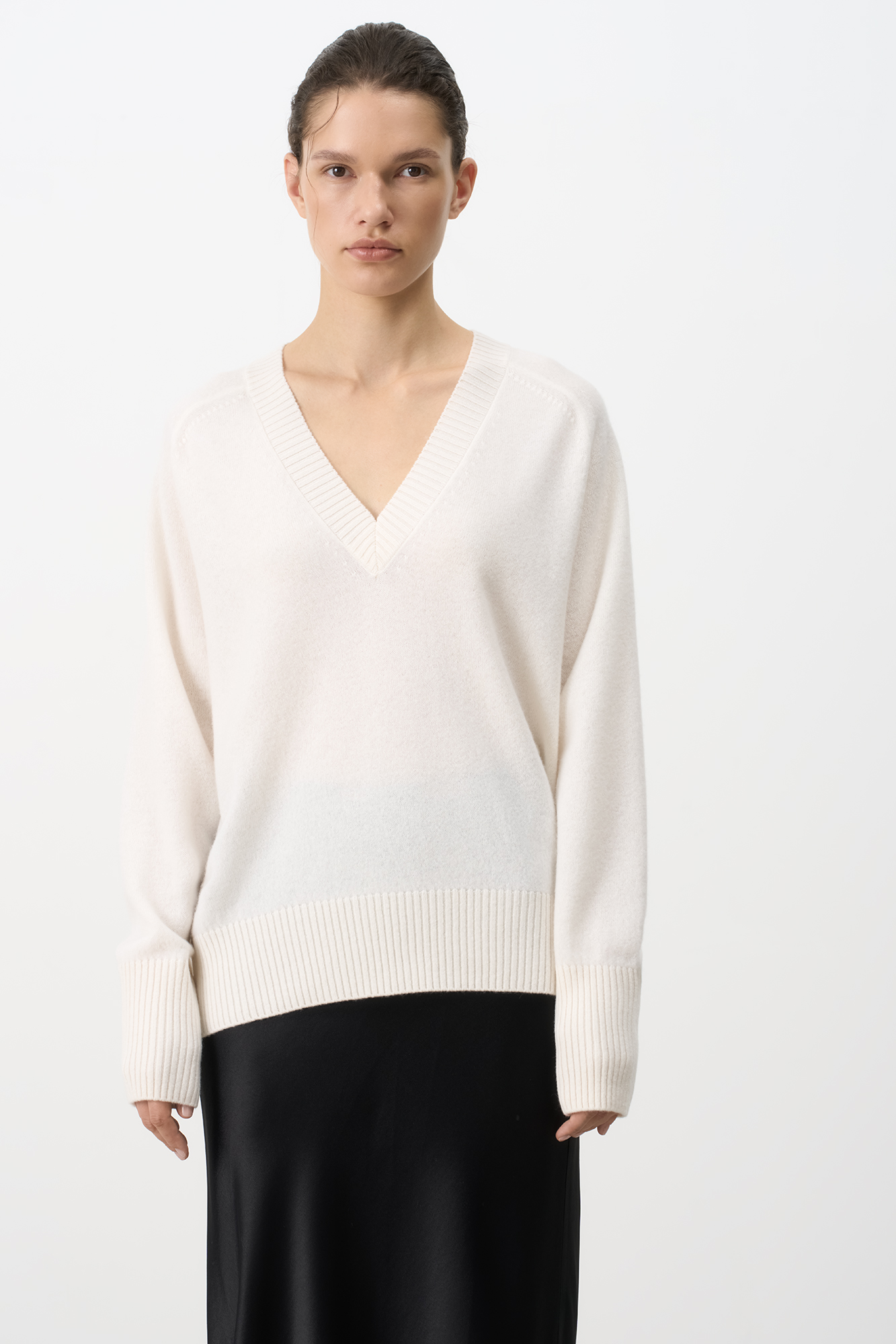 Джемпер с V-образным вырезом из 100% кашемира. Модель свободного силуэта со спущенной линией плеча. Края изделия в рубчик.