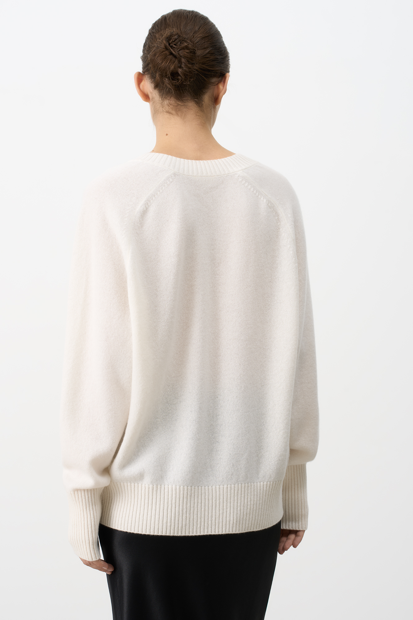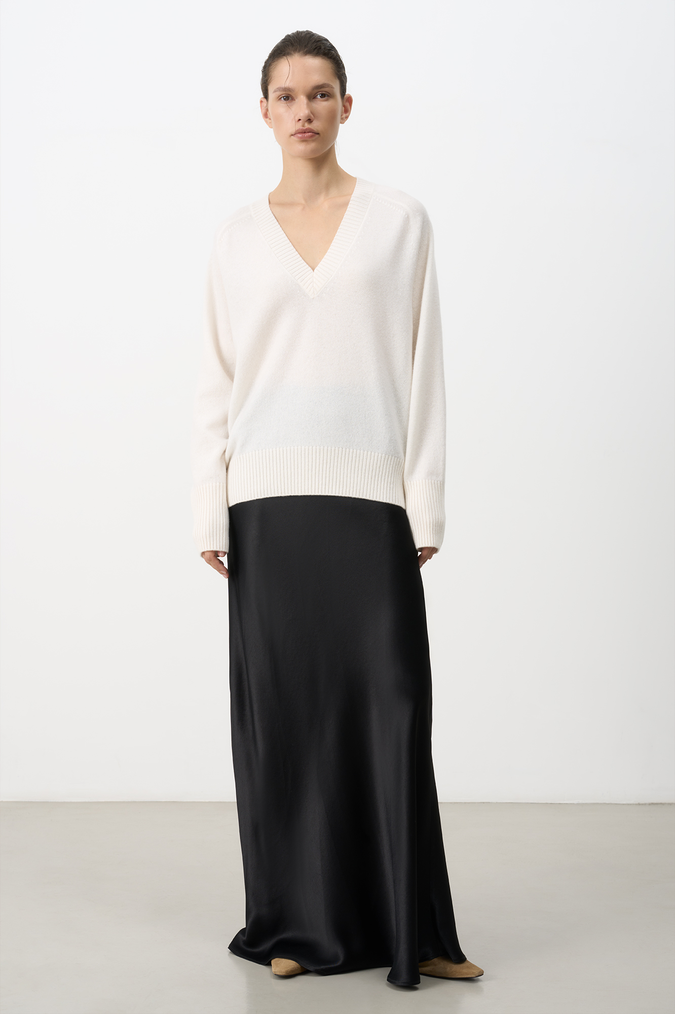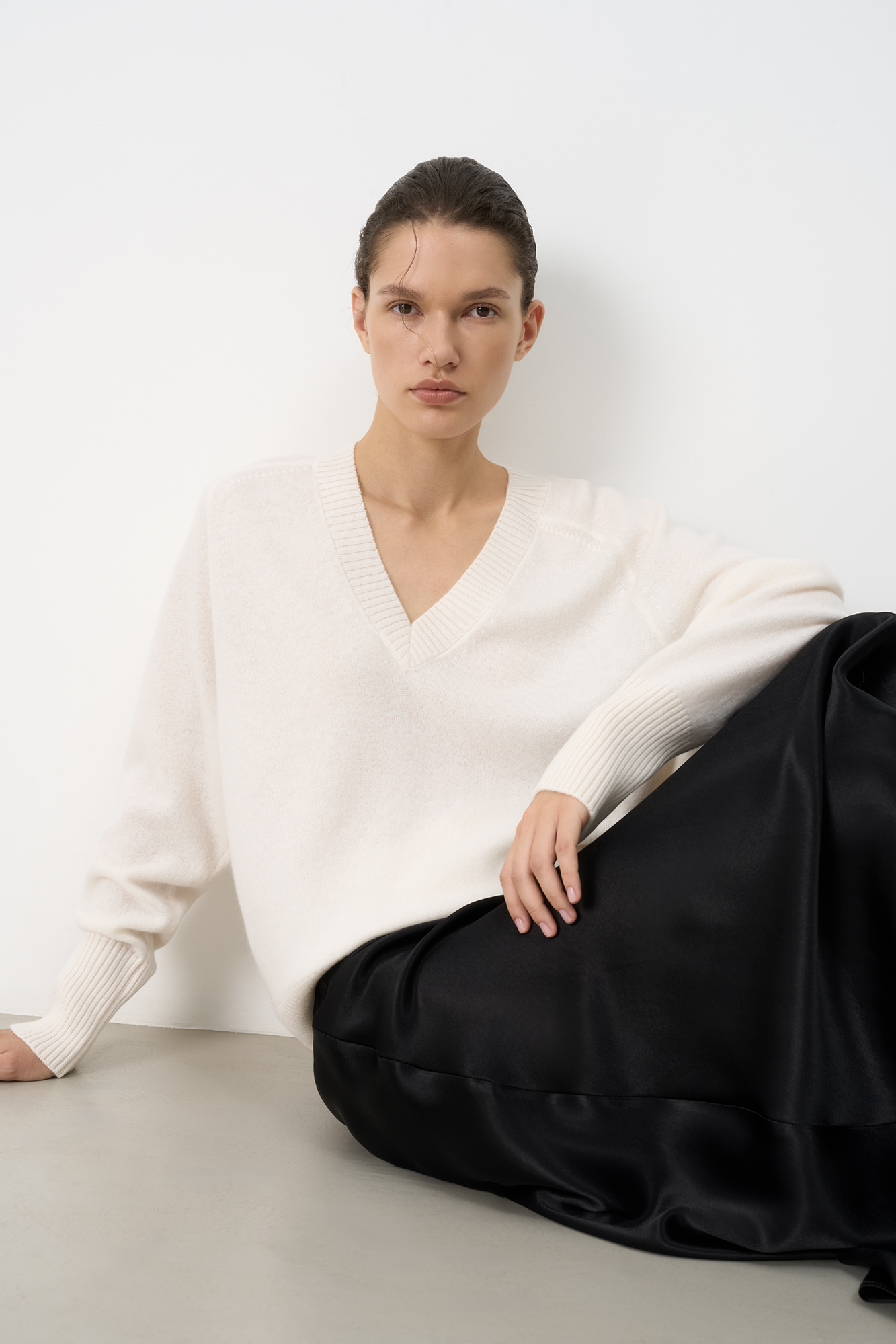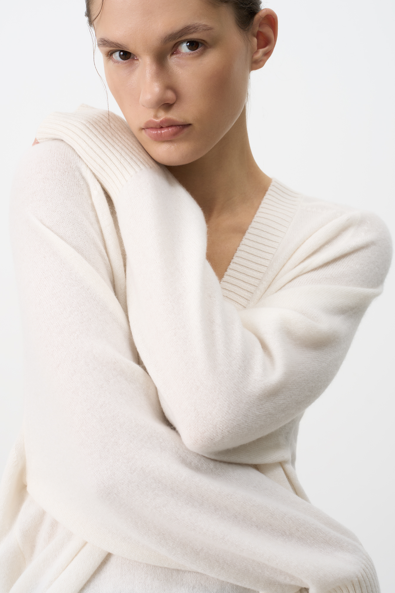 Джемпер с V-образным вырезом из 100% кашемира. Модель свободного силуэта со спущенной линией плеча. Края изделия в рубчик.