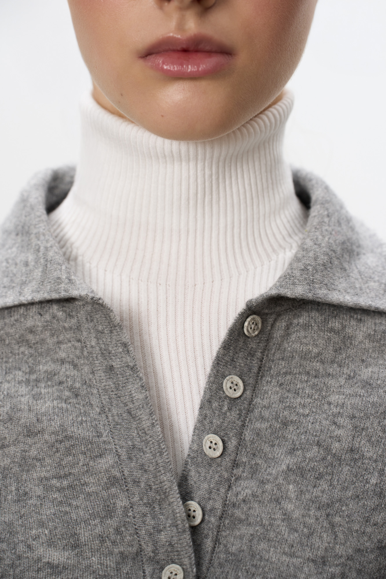 Трикотажный джемпер из кашемира и шерсти. Модель прямого силуэта со спущенной линией плеча и воротником поло на пуговицах. Манжеты рукавов и низ изделия выполнен в рубчик.