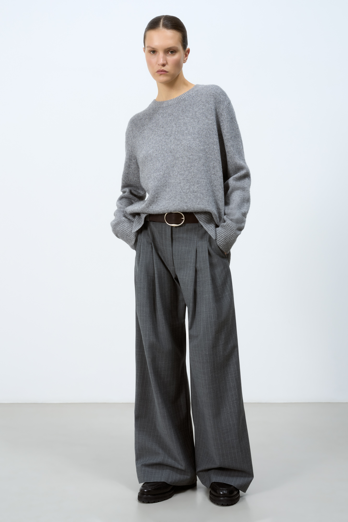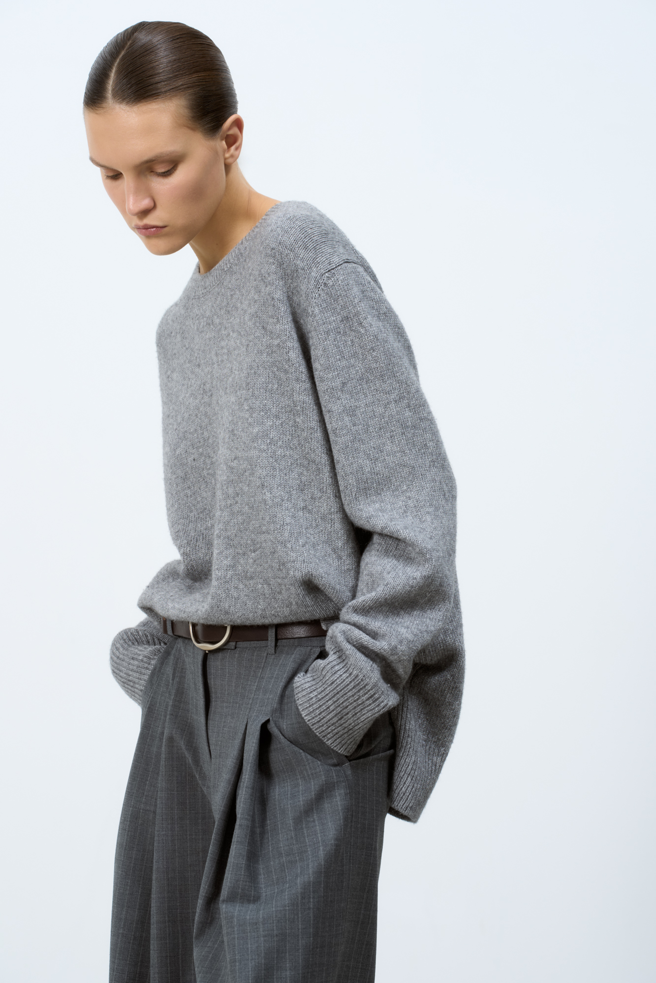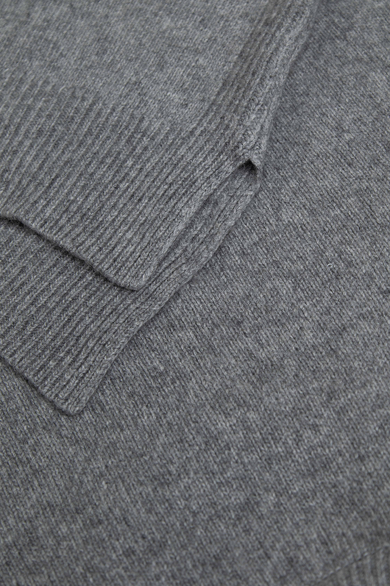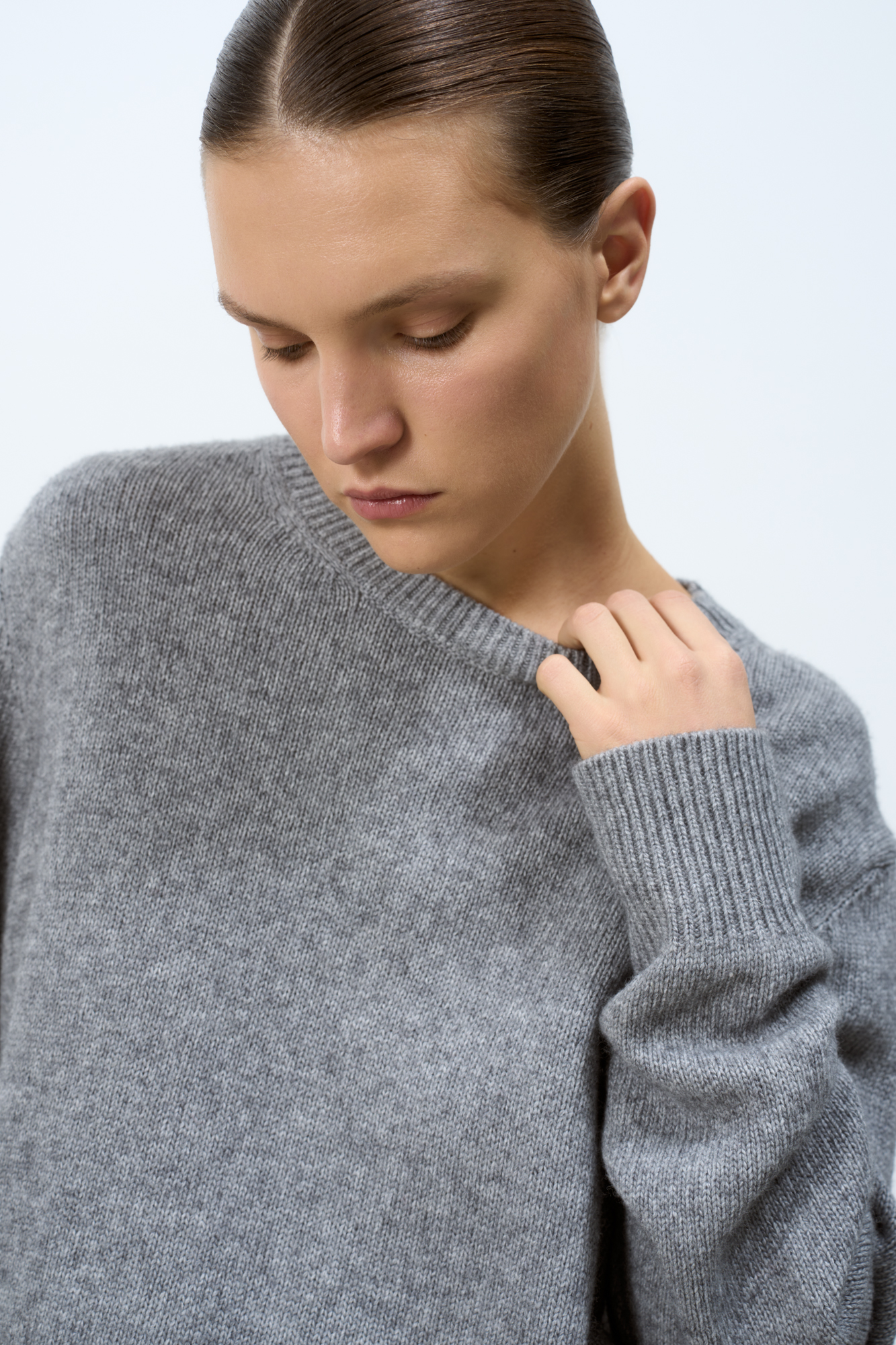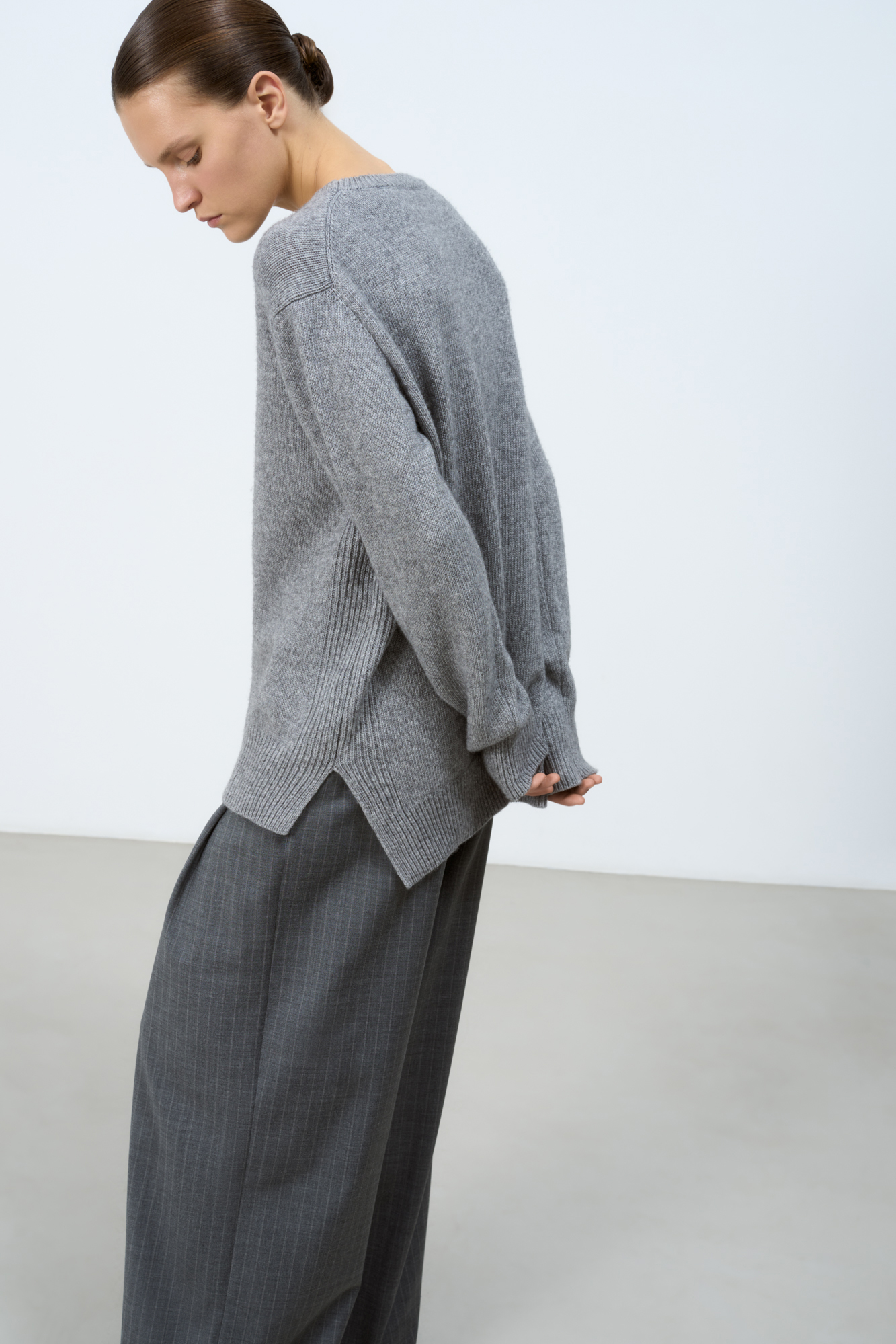 Трикотажный джемпер из кашемира и шерсти. Модель свободного силуэта с удлиненной спинкой и разрезами по бокам. Манжеты рукавов и низ изделия выполнены в рубчик.