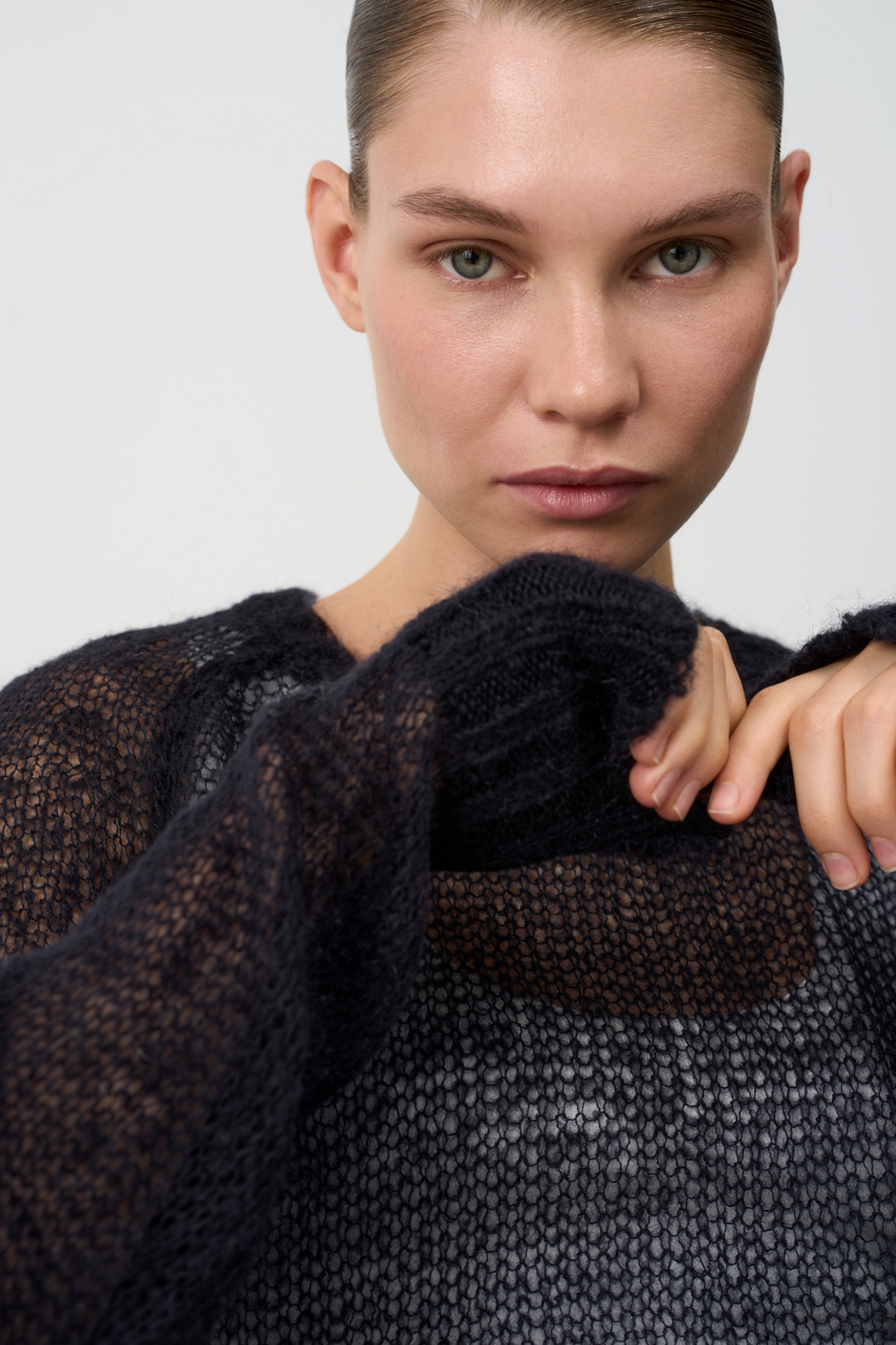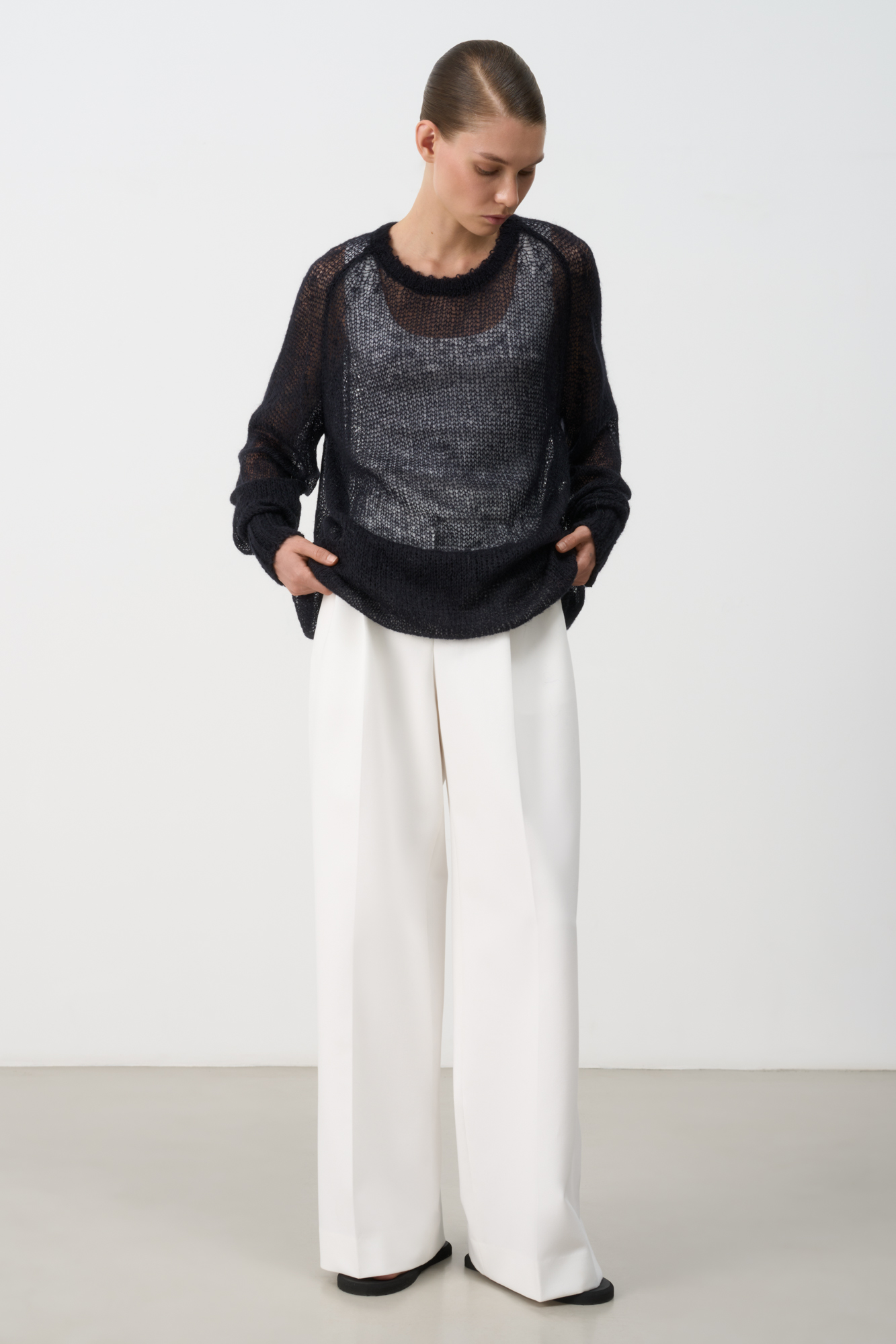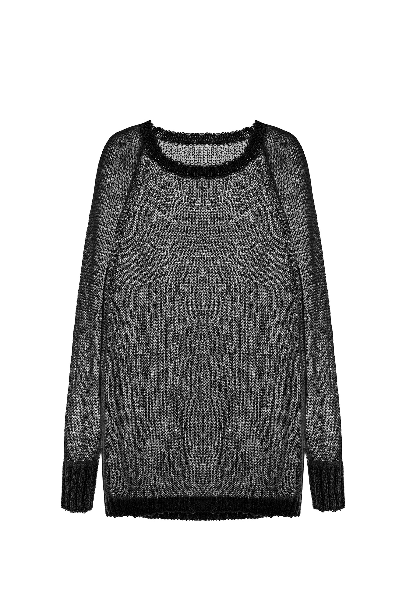 Трикотажный полупозрачный джемпер из смесовой шерсти. Модель свободного силуэта со спущенной линией плеча.