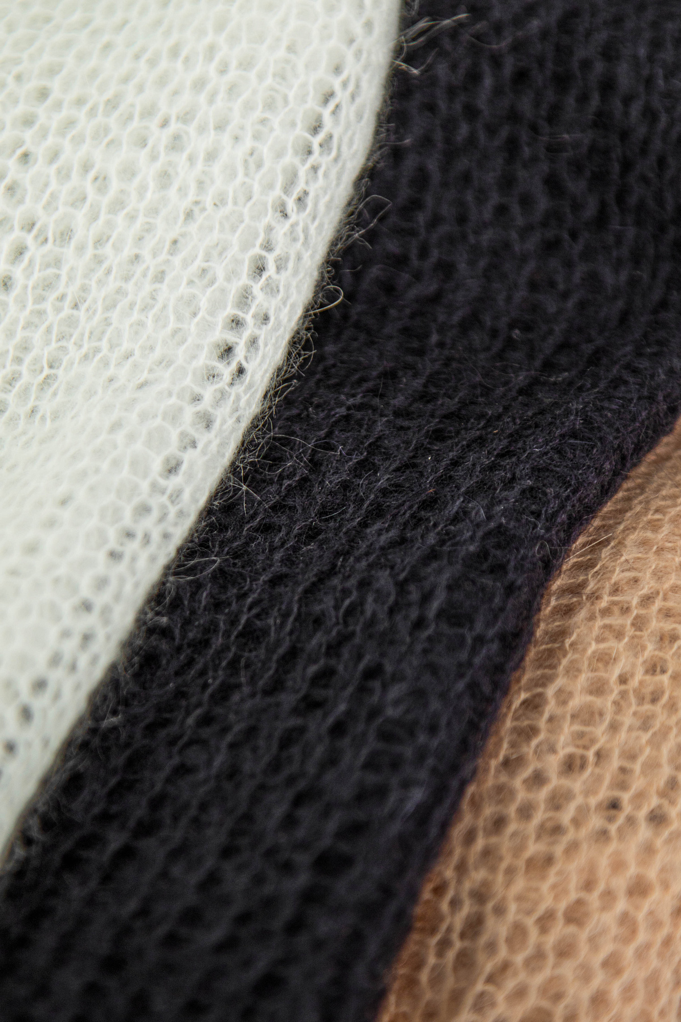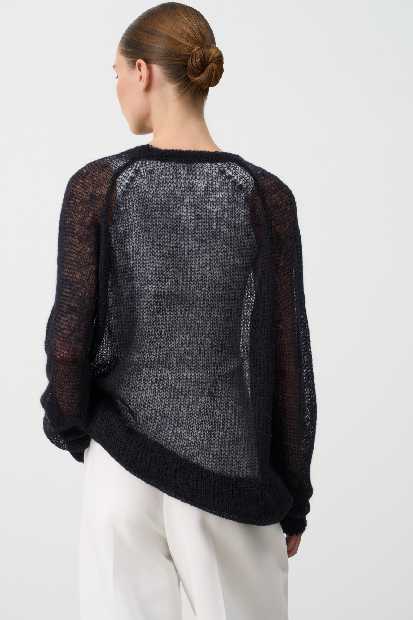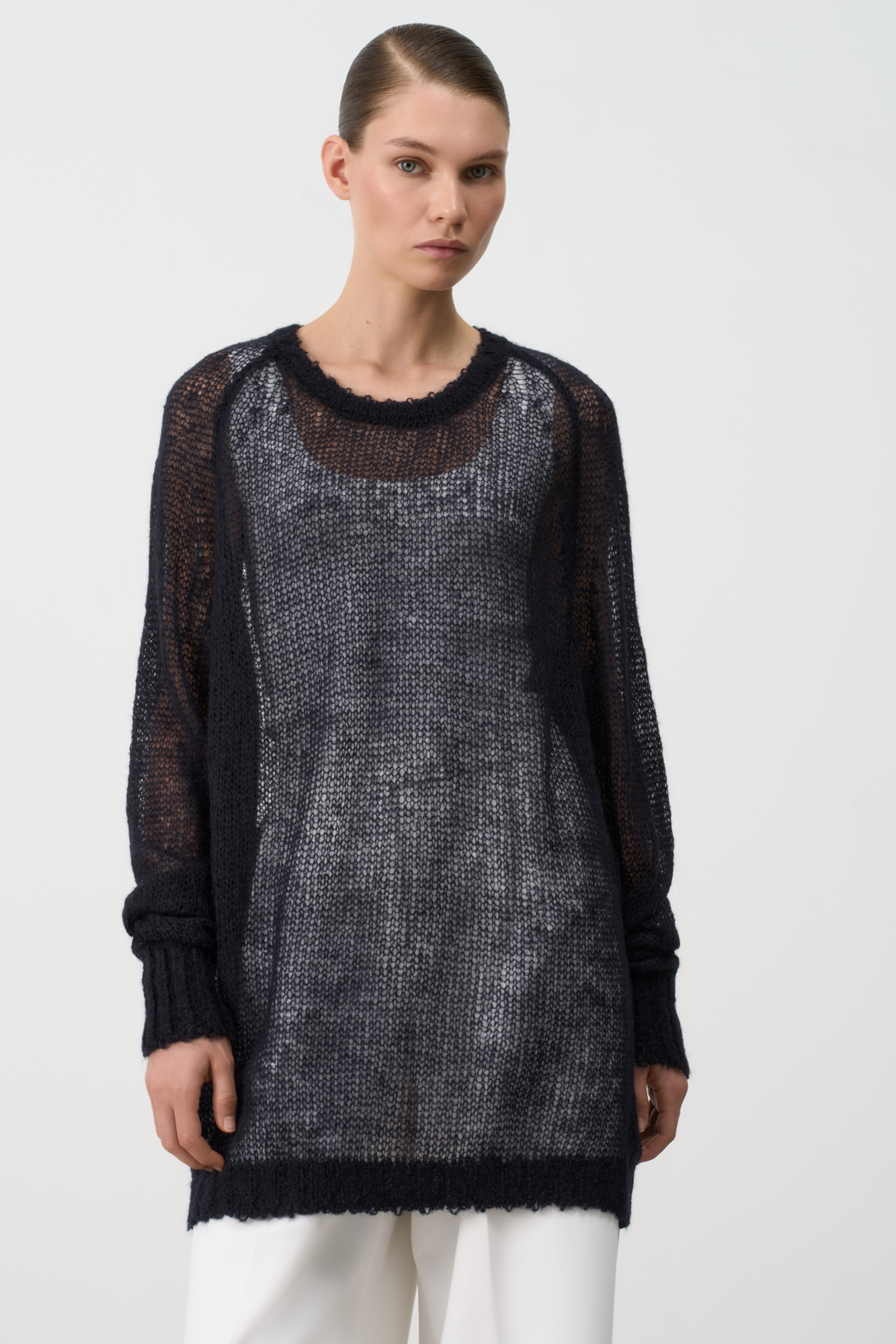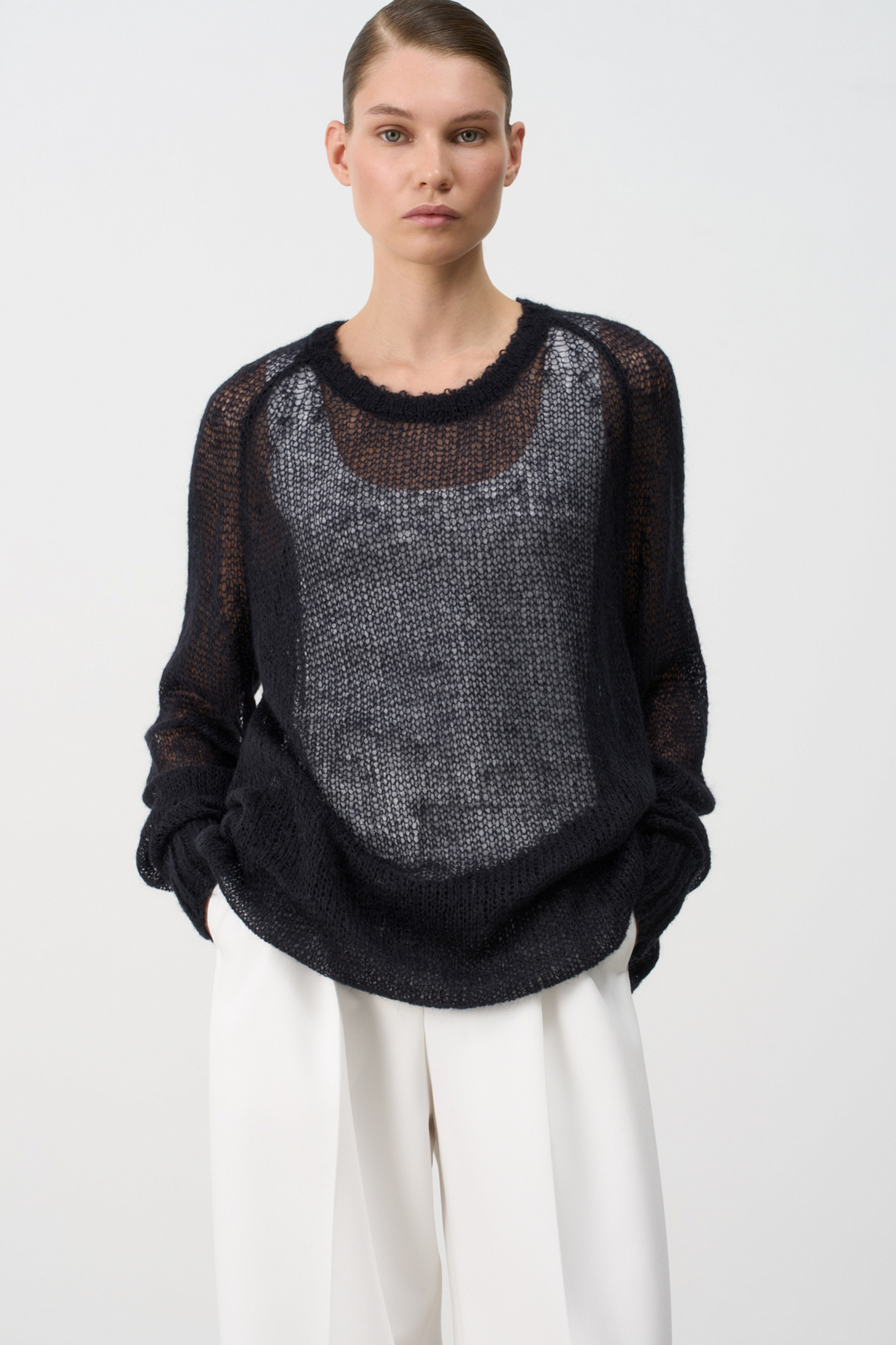 Трикотажный полупозрачный джемпер из смесовой шерсти. Модель свободного силуэта со спущенной линией плеча.