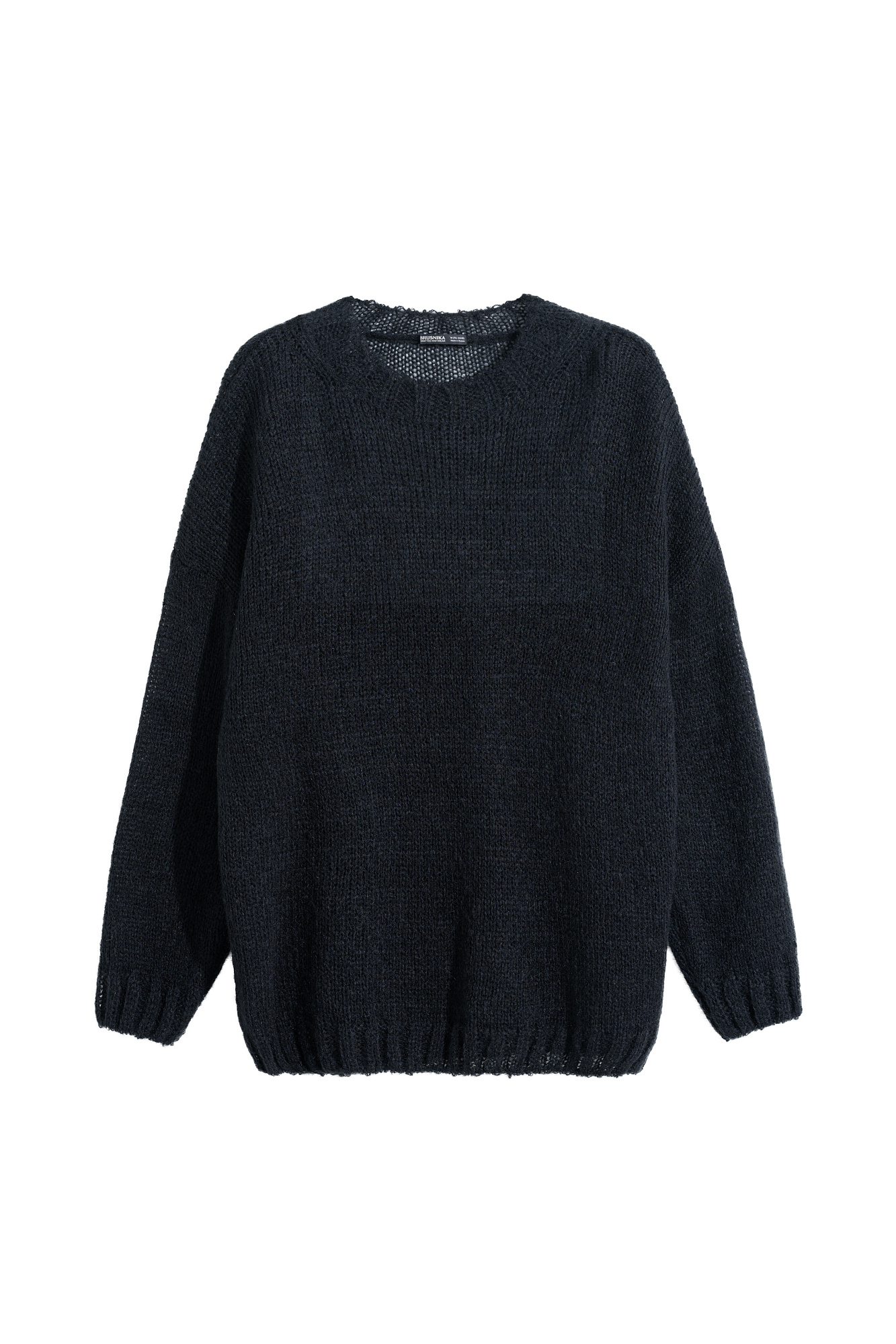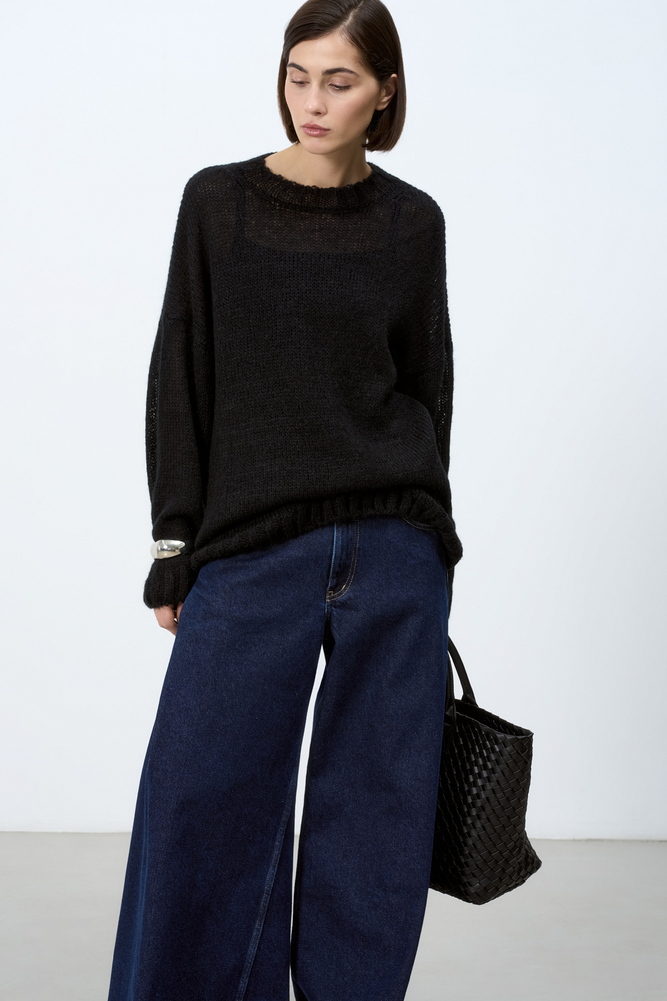 Трикотажный полупрозрачный джемпер из смесовой шерсти с добавлением мохера. Модель свободного силуэта со спущенной линией плеч и круглым вырезом горловины. Манжеты и низ изделия выполнены в широкий рубчик.