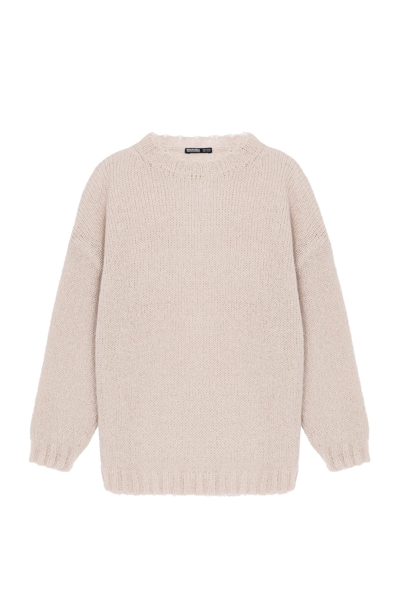 Трикотажный полупрозрачный джемпер из смесовой шерсти с добавлением мохера. Модель свободного силуэта со спущенной линией плеч и круглым вырезом горловины. Манжеты и низ изделия выполнены в широкий рубчик.