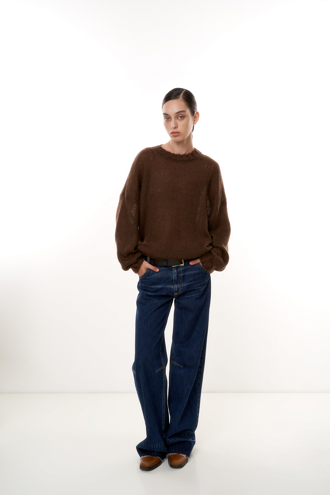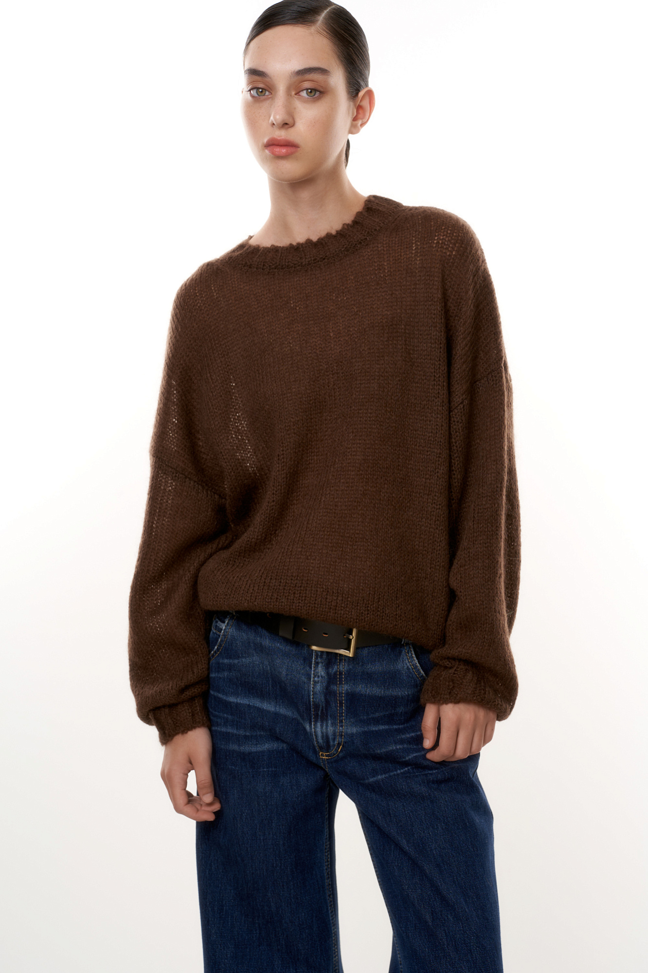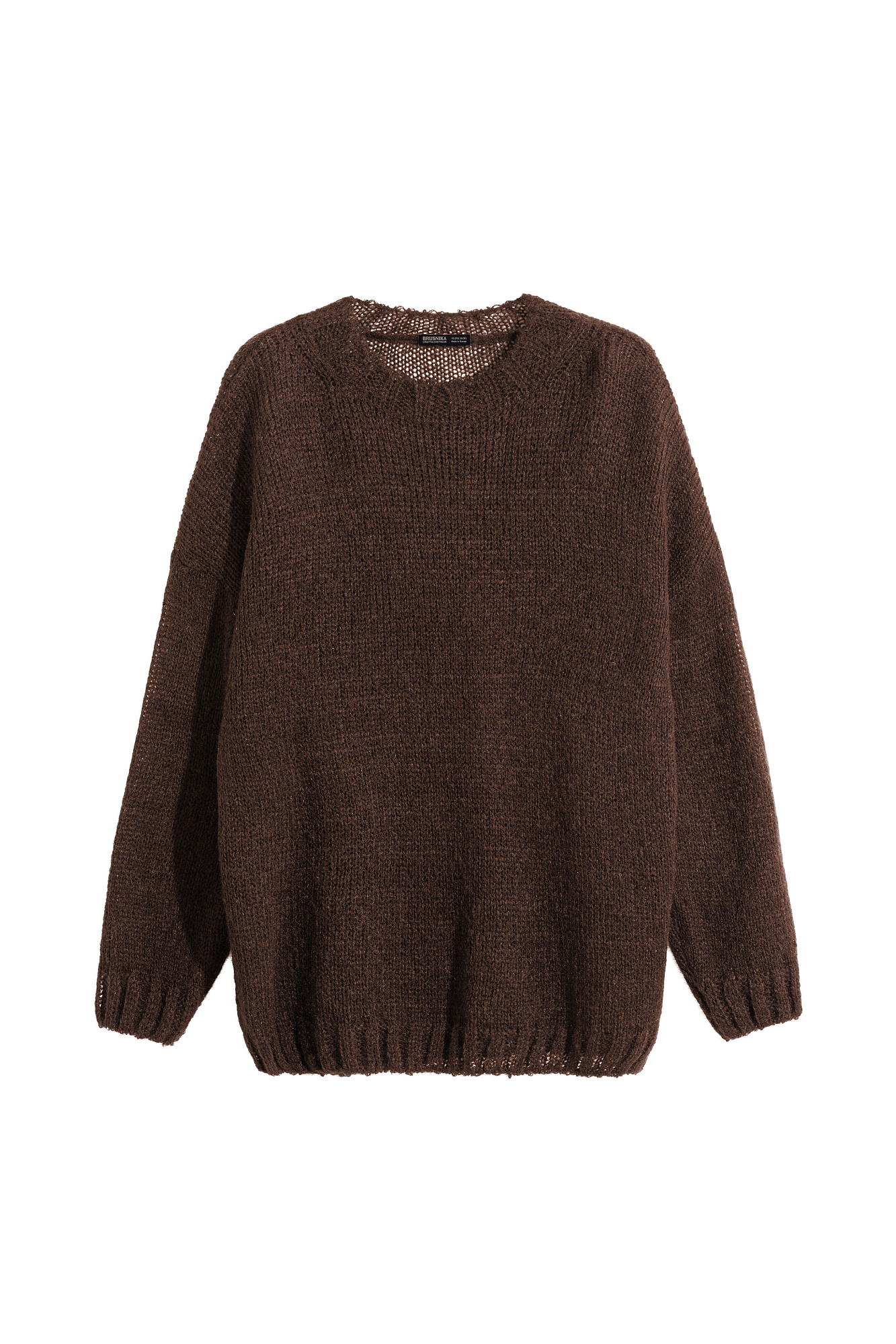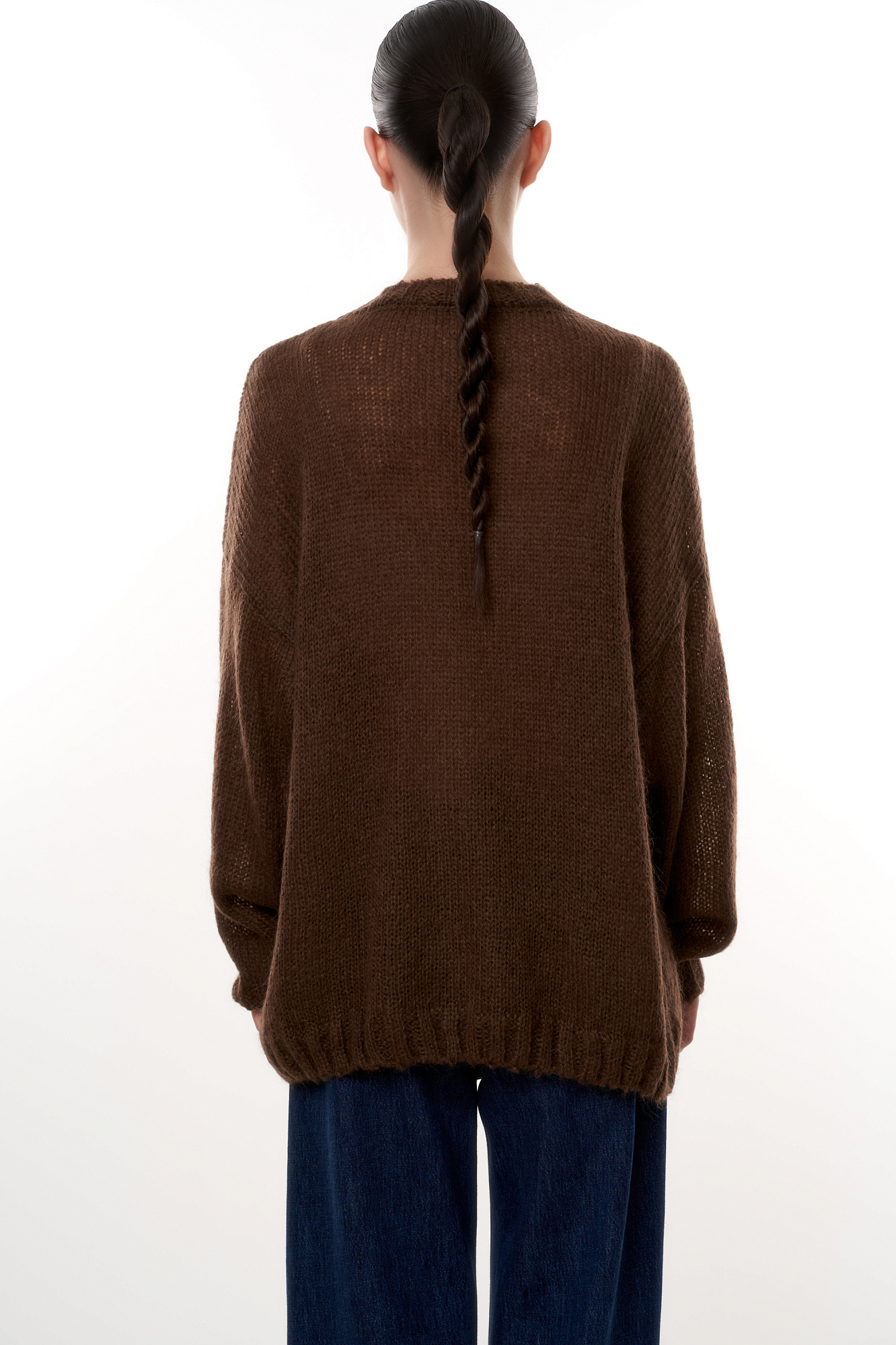 Трикотажный полупрозрачный джемпер из смесовой шерсти с добавлением мохера. Модель свободного силуэта со спущенной линией плеч и круглым вырезом горловины. Манжеты и низ изделия выполнены в широкий рубчик.
