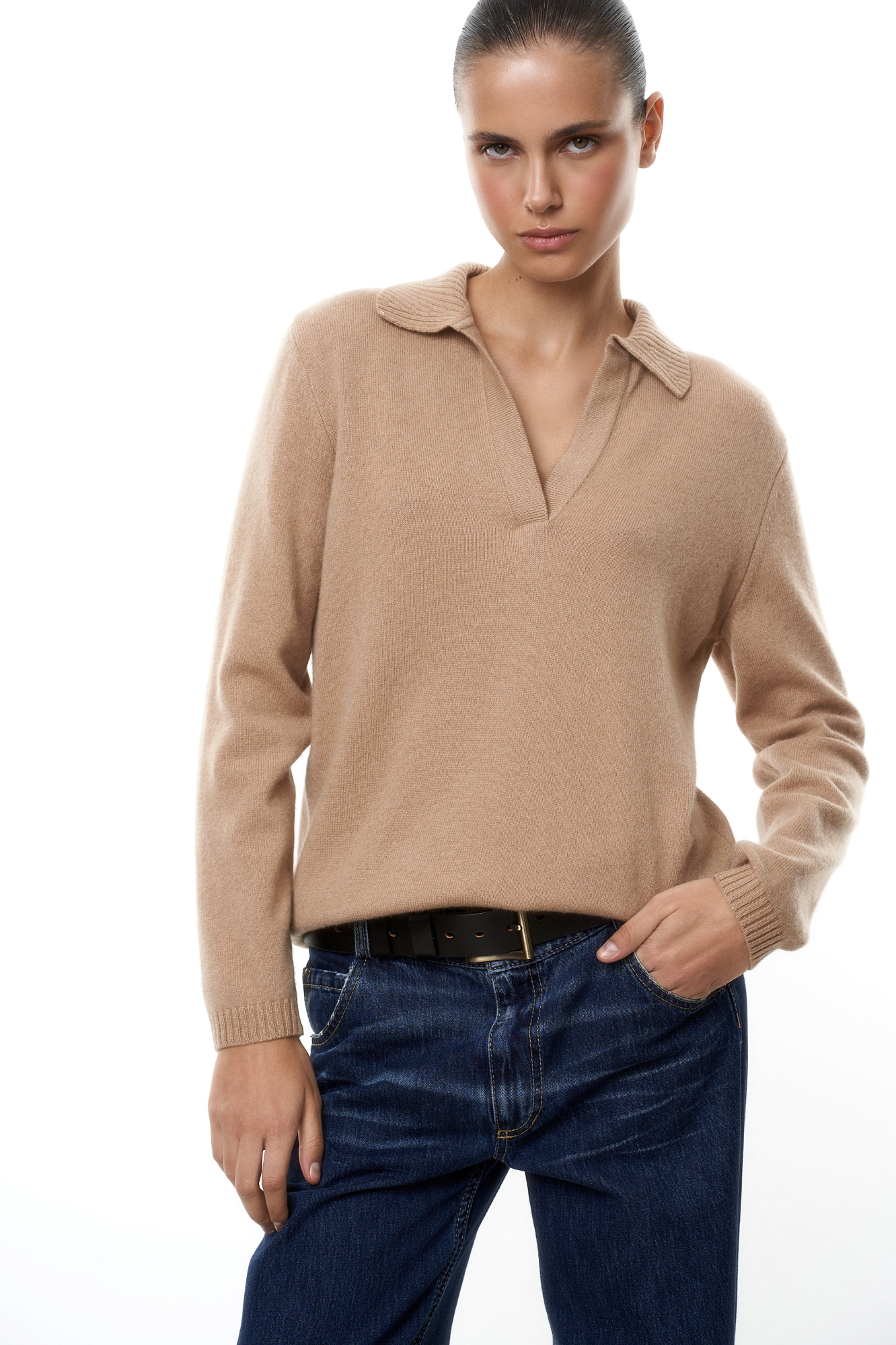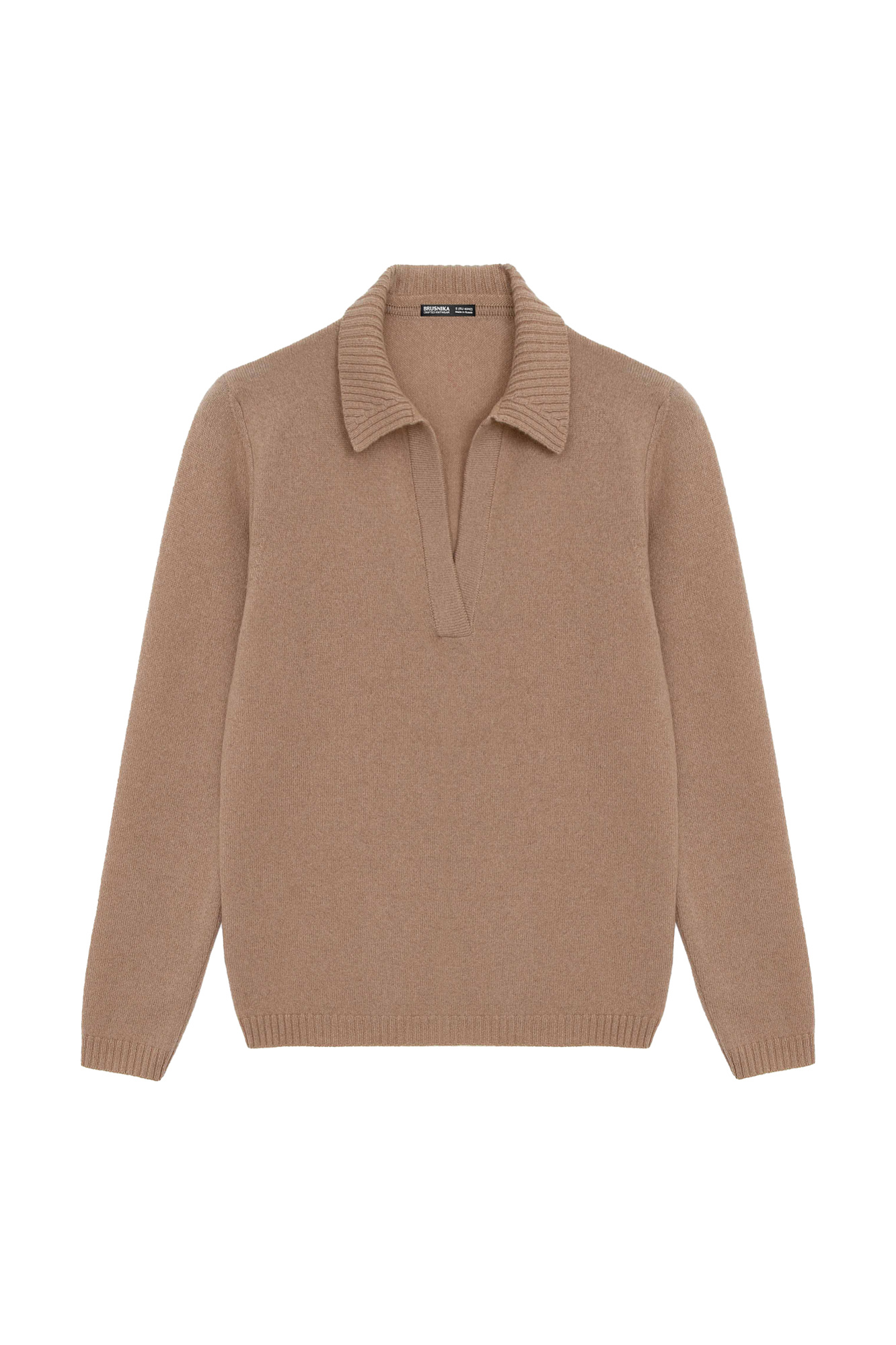 Трикотажный джемпер с воротником-поло из 100% кашемира. Модель свободного силуэта, края изделия выполнены в рубчик.