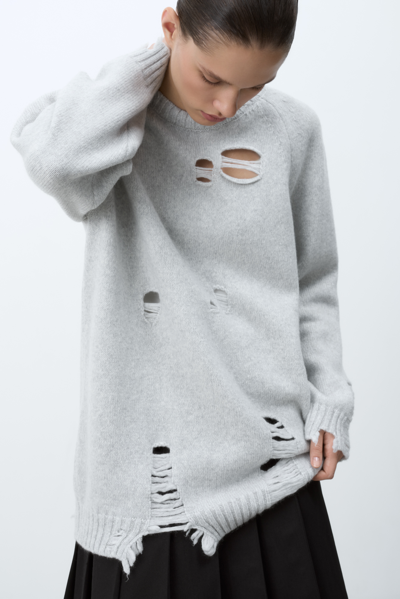 Трикотажный джемпер из шерсти мериноса. Модель свободного силуэта со спущенным плечом и разрезами в стиле гранж.