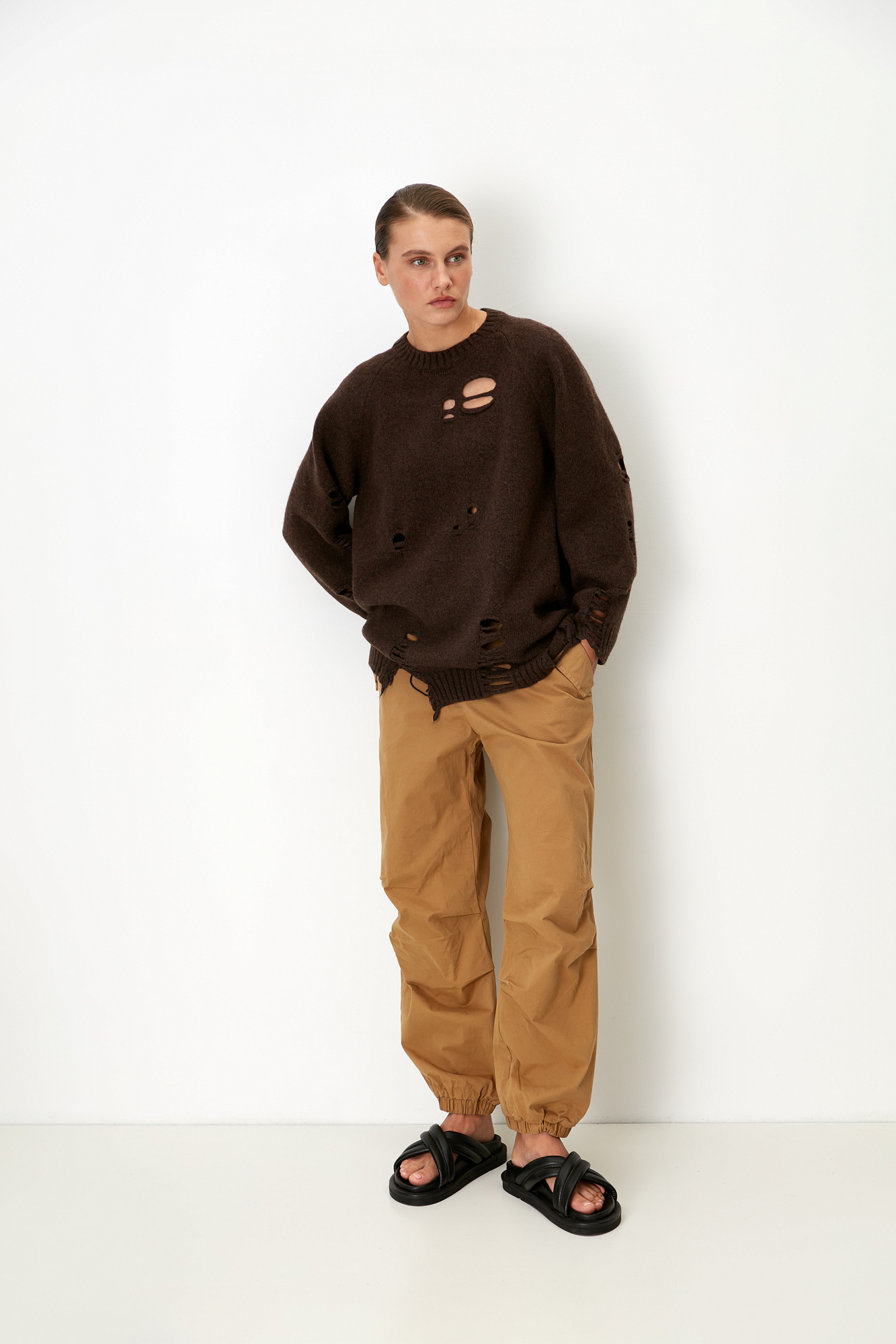 Трикотажный джемпер из шерсти мериноса. Модель свободного силуэта со спущенным плечом и разрезами в стиле гранж.