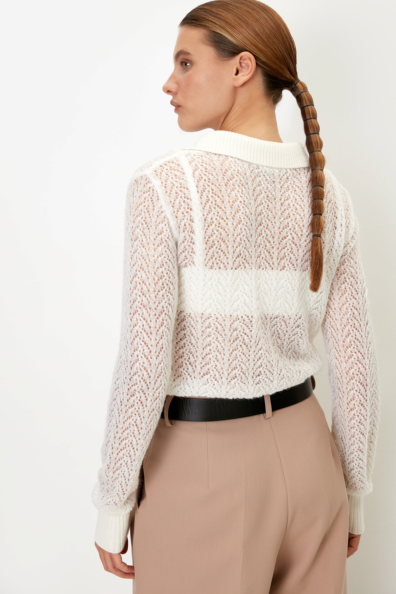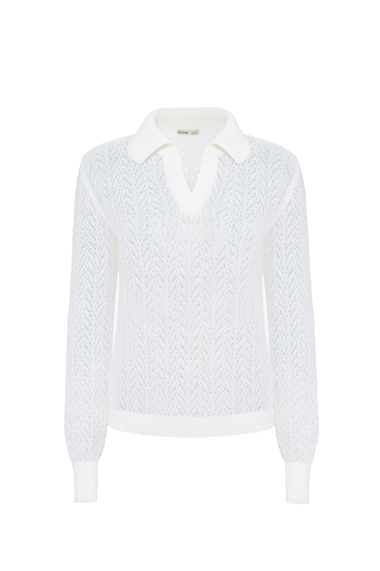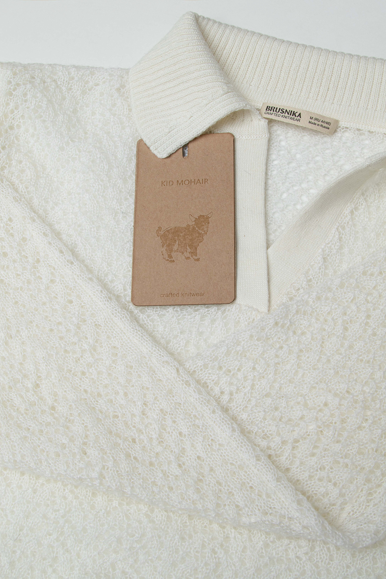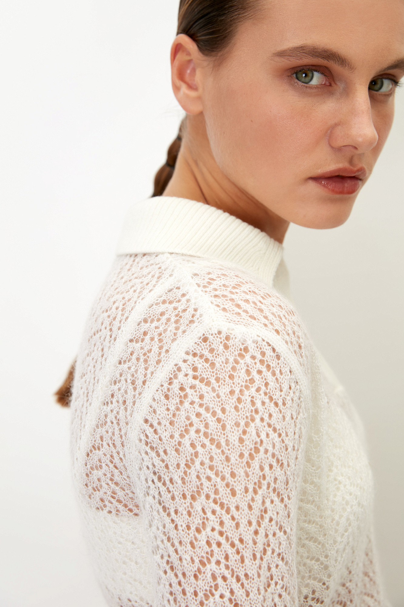 Трикотажный ажурный джемпер из шерсти с добавлением мохера. Модель прямого силуэта со спущенной линией плеча, длинным рукавом и воротником-поло без пуговиц.
