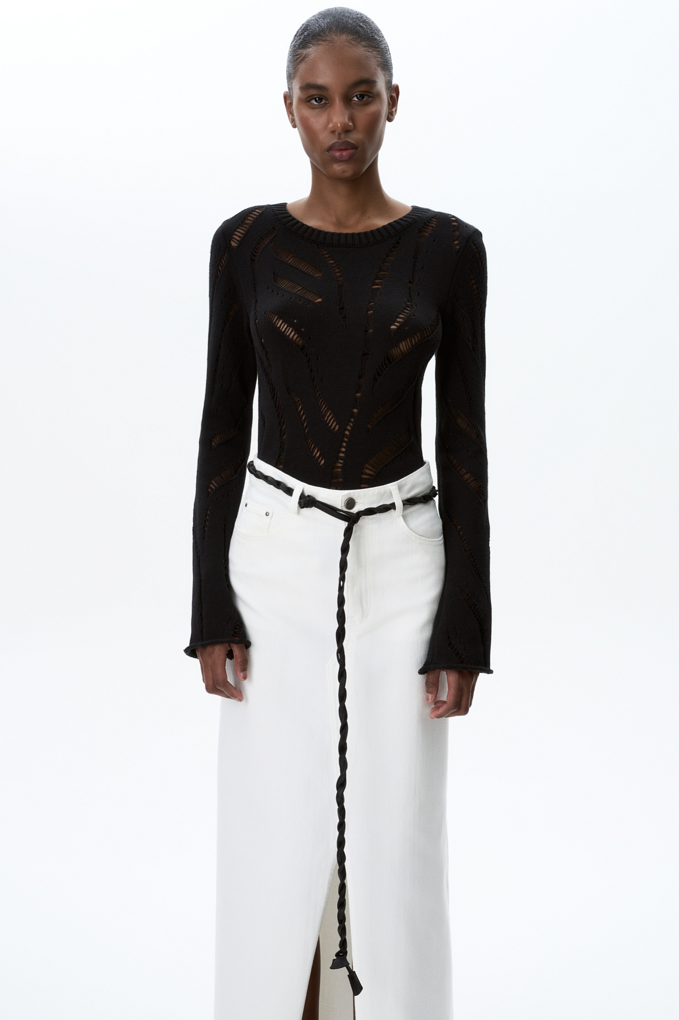 Трикотажный джемпер из 100% хлопка. Длинные расклешенные рукава, круглый вырез в рубчик. Модель фактурной вязки с протяжками.