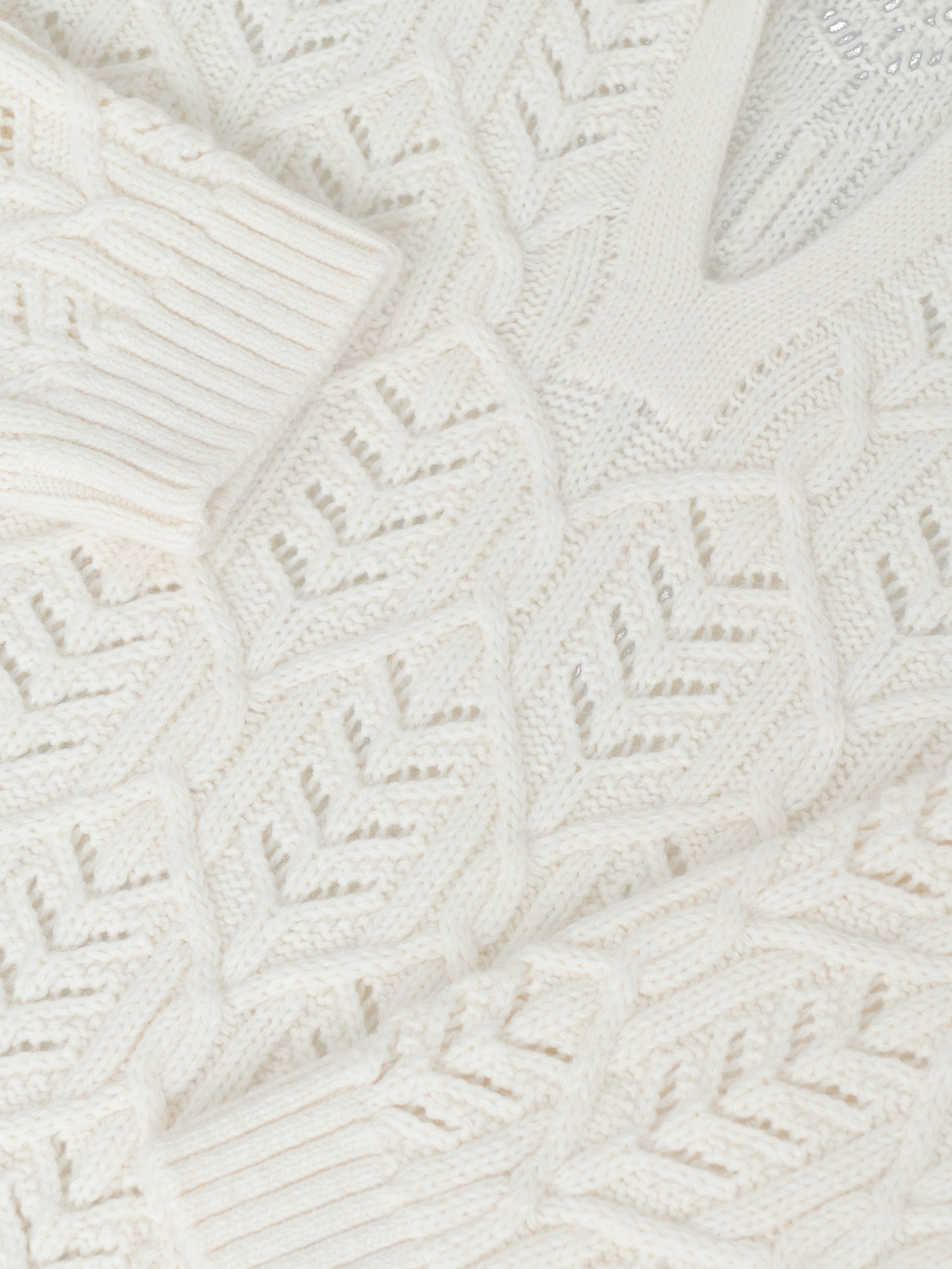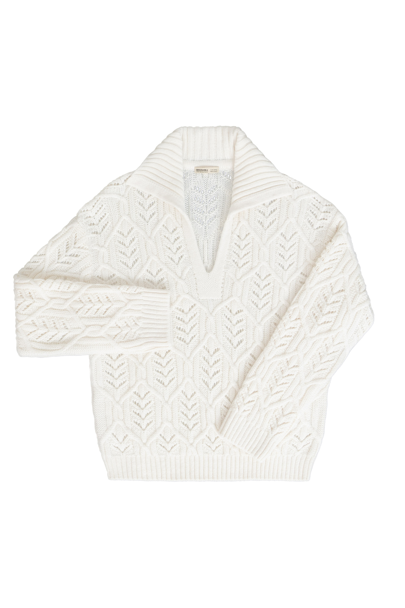 Трикотажный джемпер со сложной арнаментной вязкой с добавлением шерсти альпака. Модель свободного силуэта со спущенной линией плеча и воротником-поло с V-образным вырезом. Манжеты рукавов, воротник и низ изделия выполнен в рубчик.