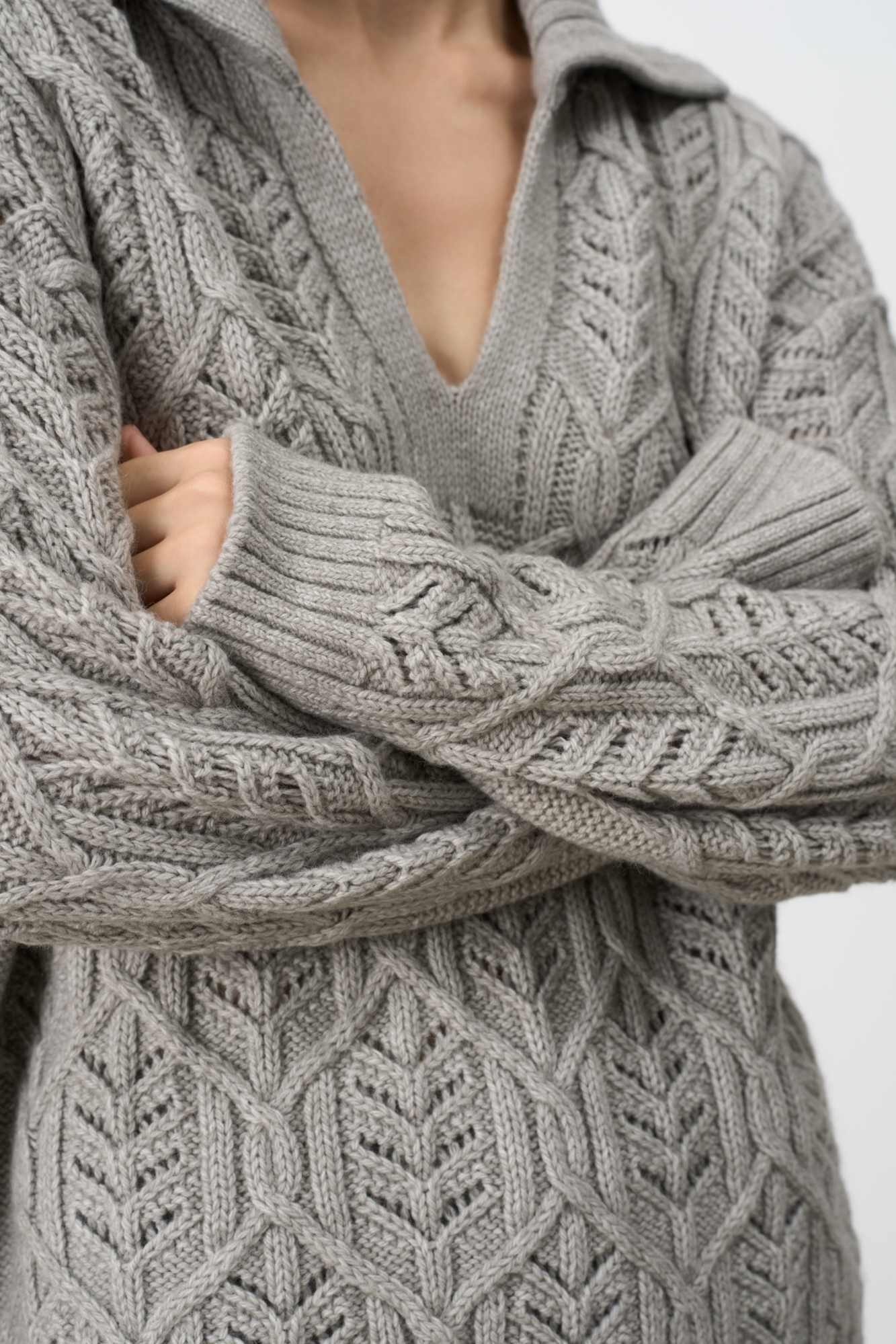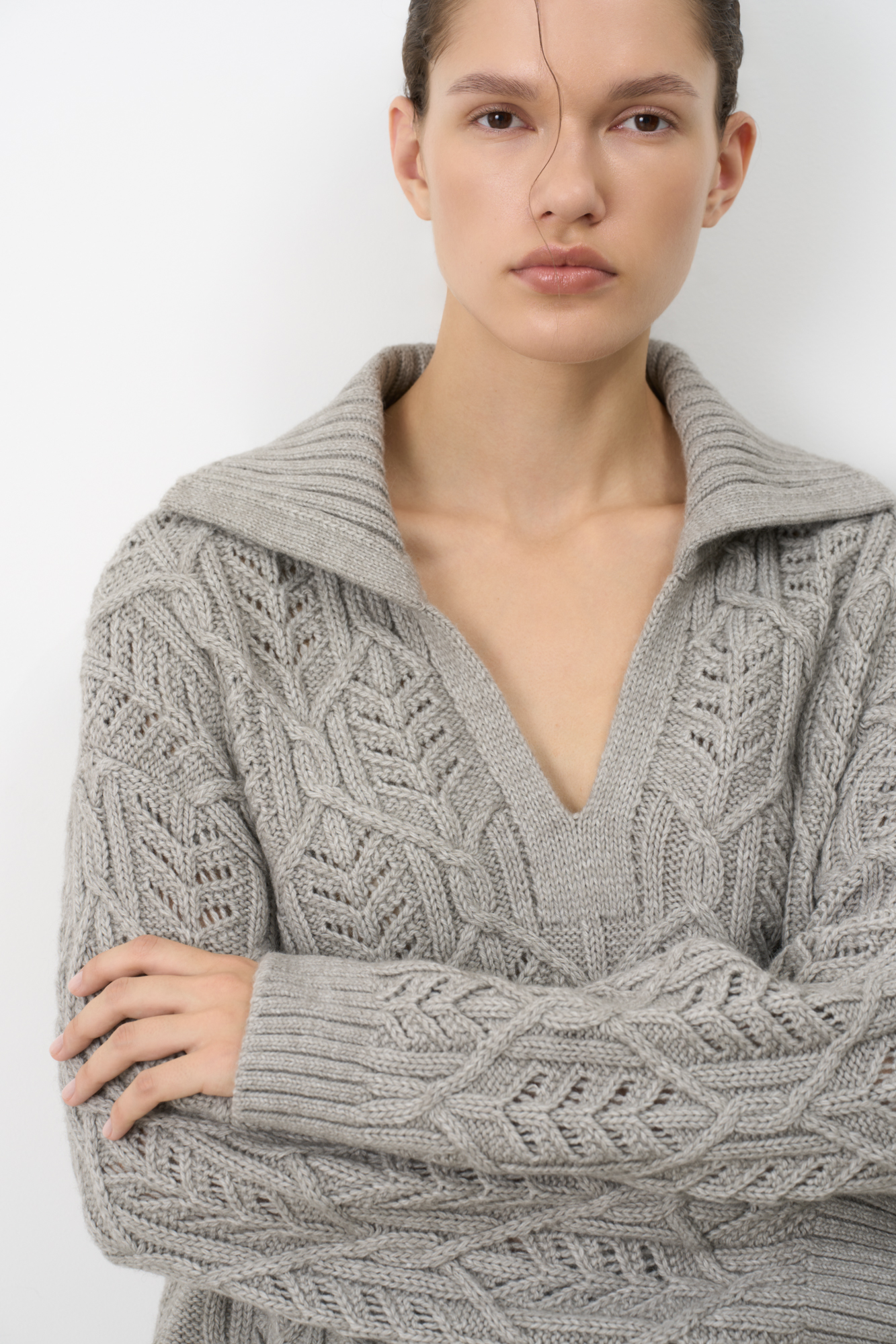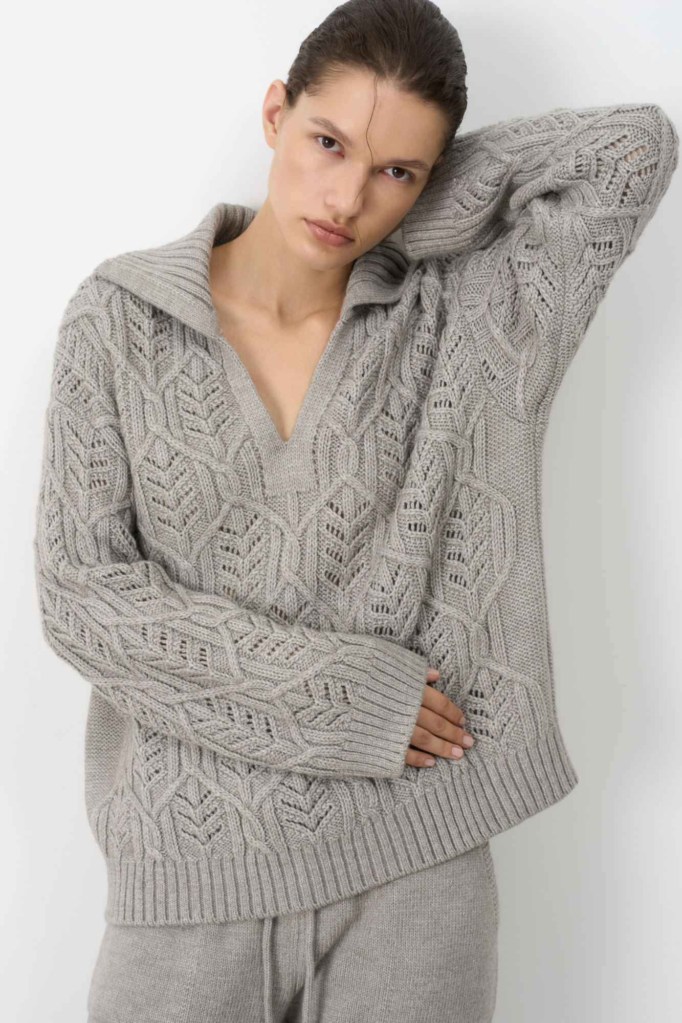 Трикотажный джемпер со сложной арнаментной вязкой с добавлением шерсти альпака. Модель свободного силуэта со спущенной линией плеча и воротником-поло с V-образным вырезом. Манжеты рукавов, воротник и низ изделия выполнен в рубчик.