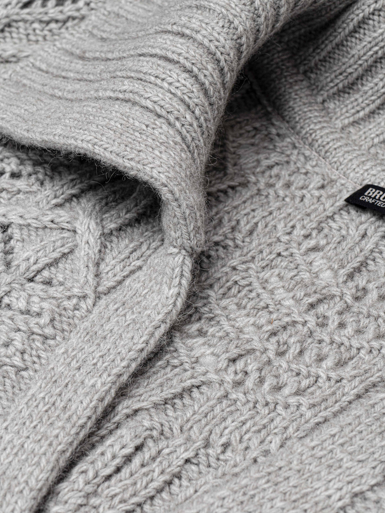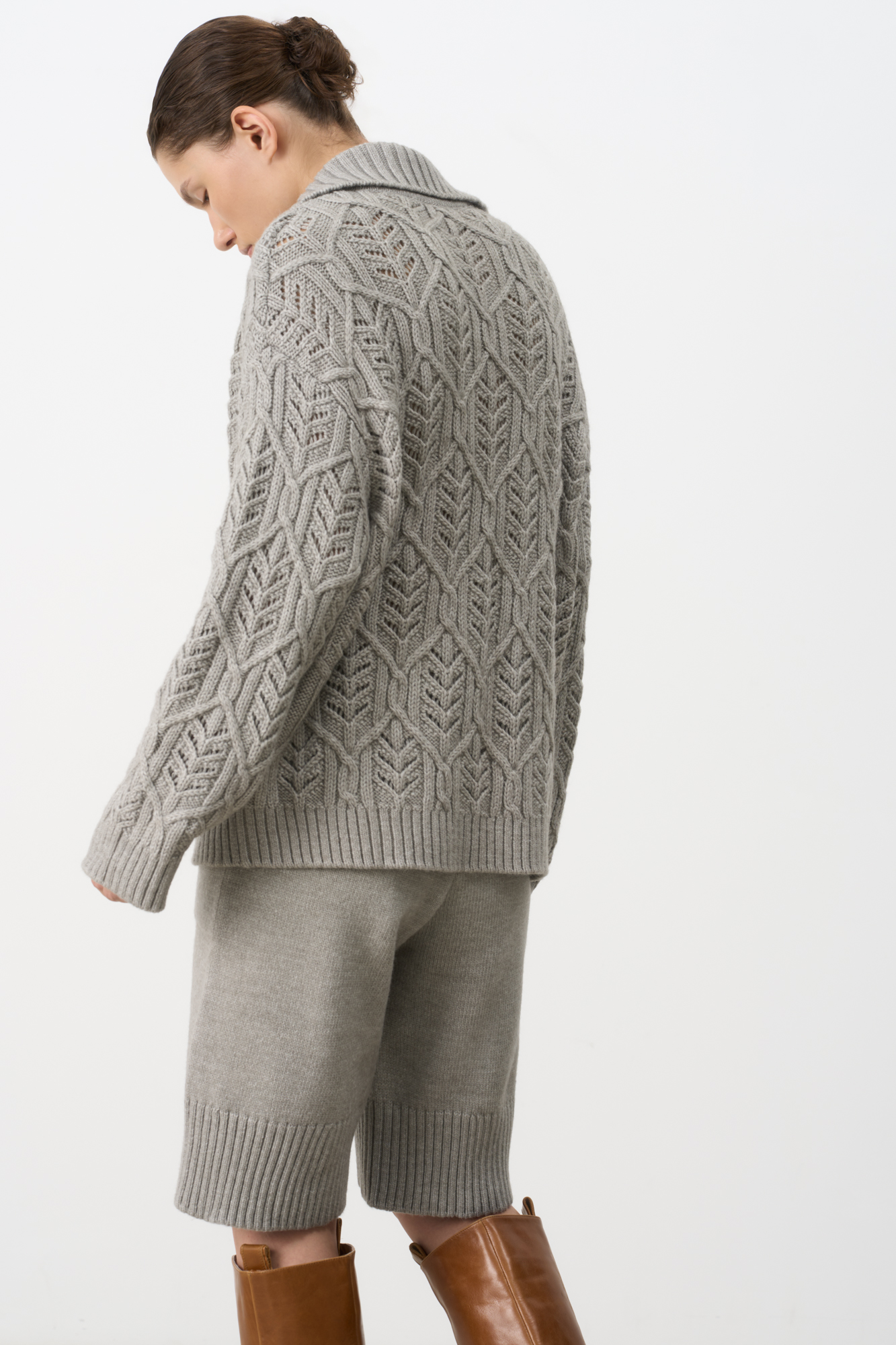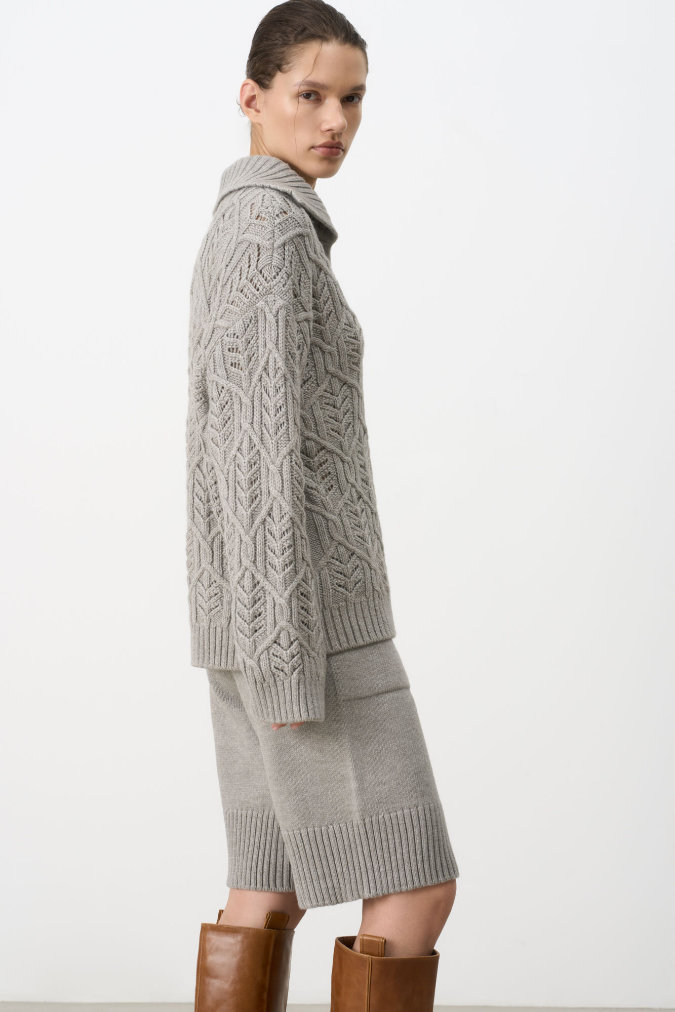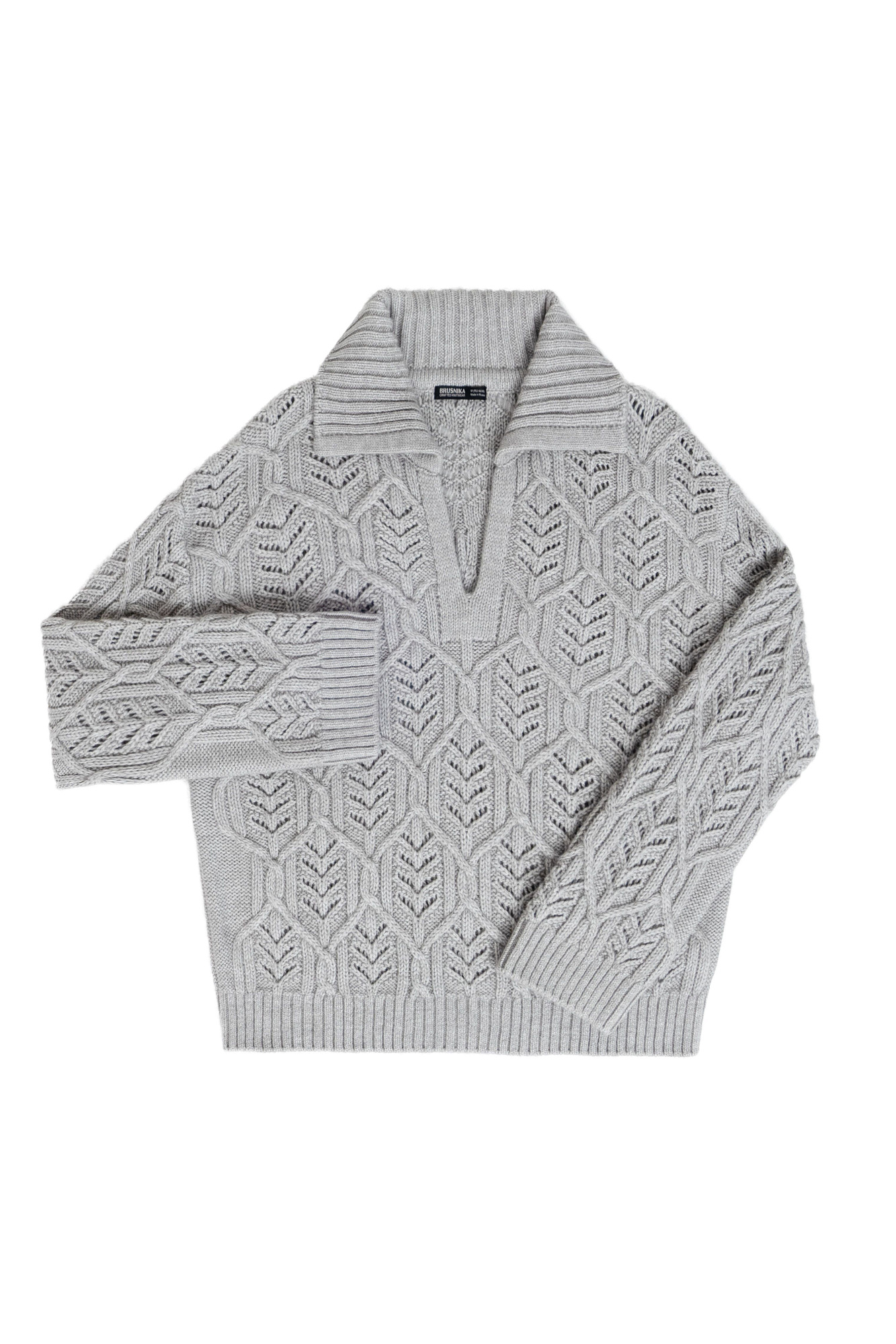 Трикотажный джемпер со сложной арнаментной вязкой с добавлением шерсти альпака. Модель свободного силуэта со спущенной линией плеча и воротником-поло с V-образным вырезом. Манжеты рукавов, воротник и низ изделия выполнен в рубчик.