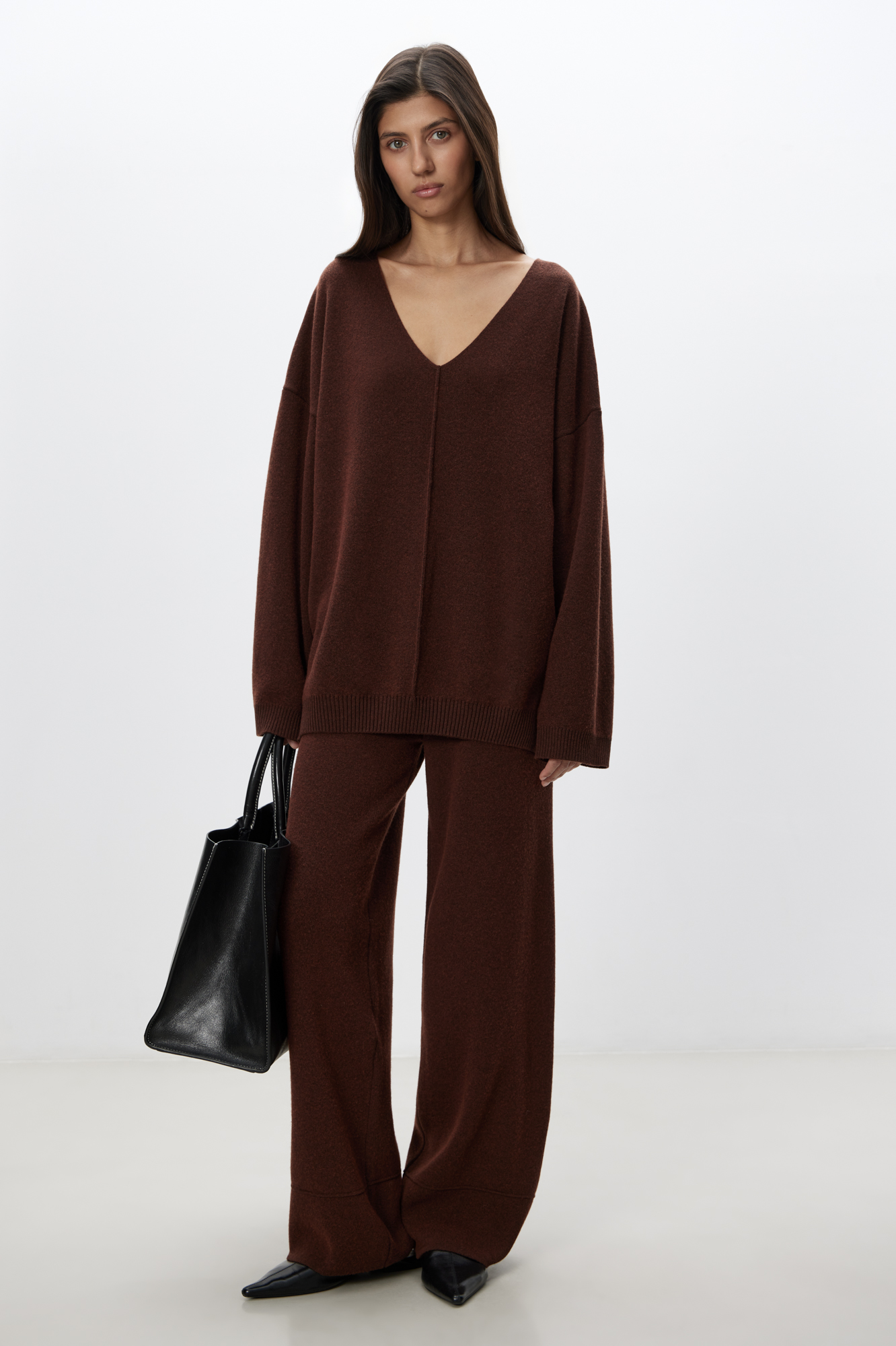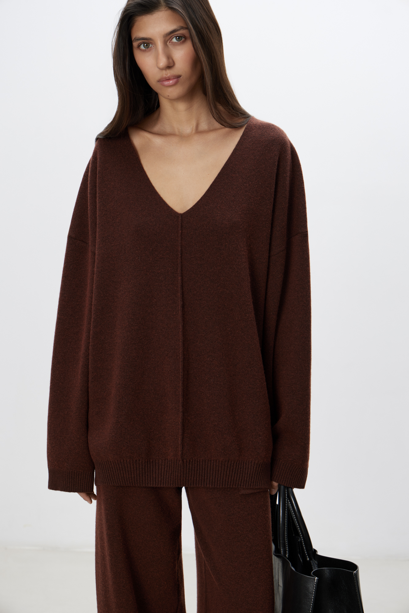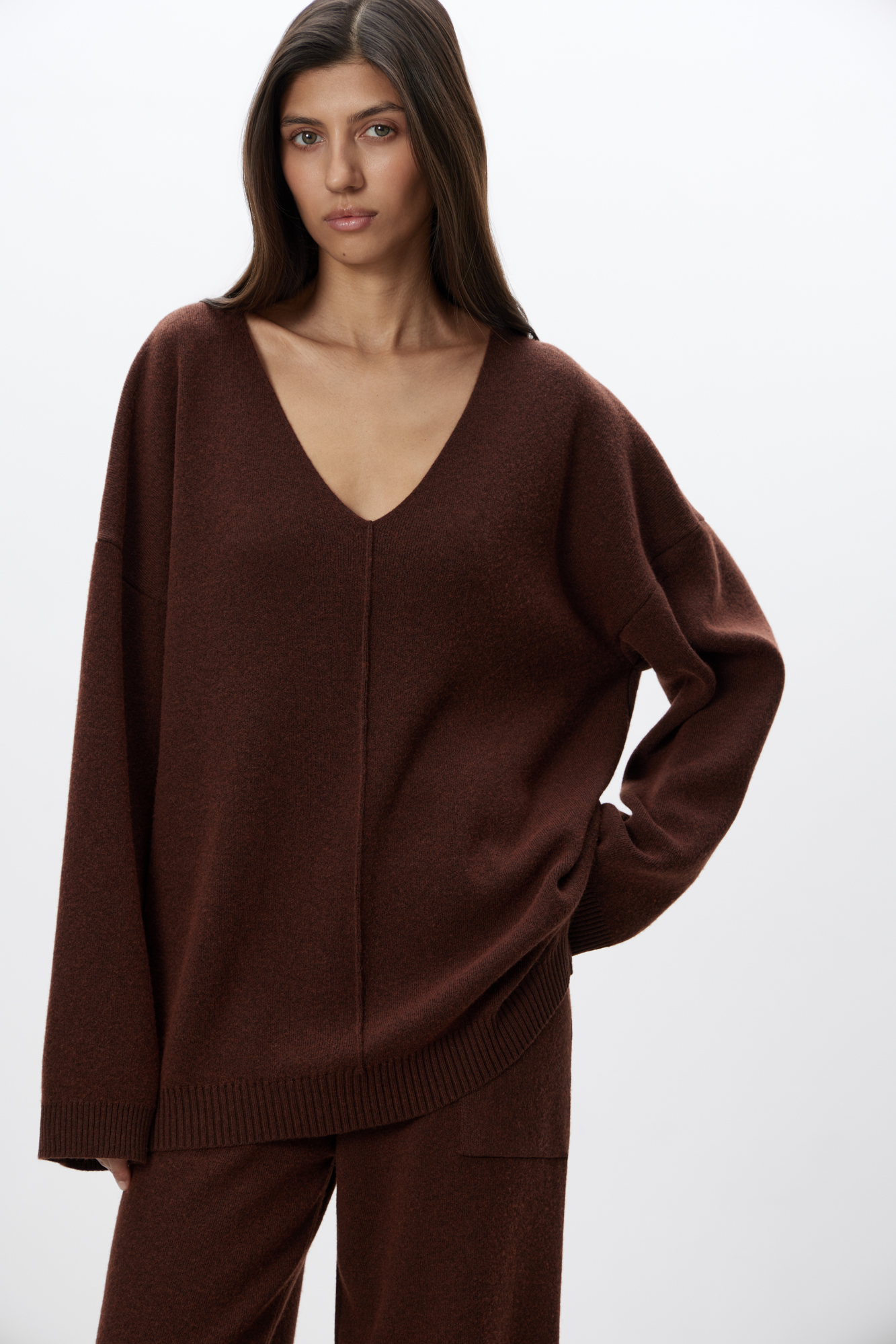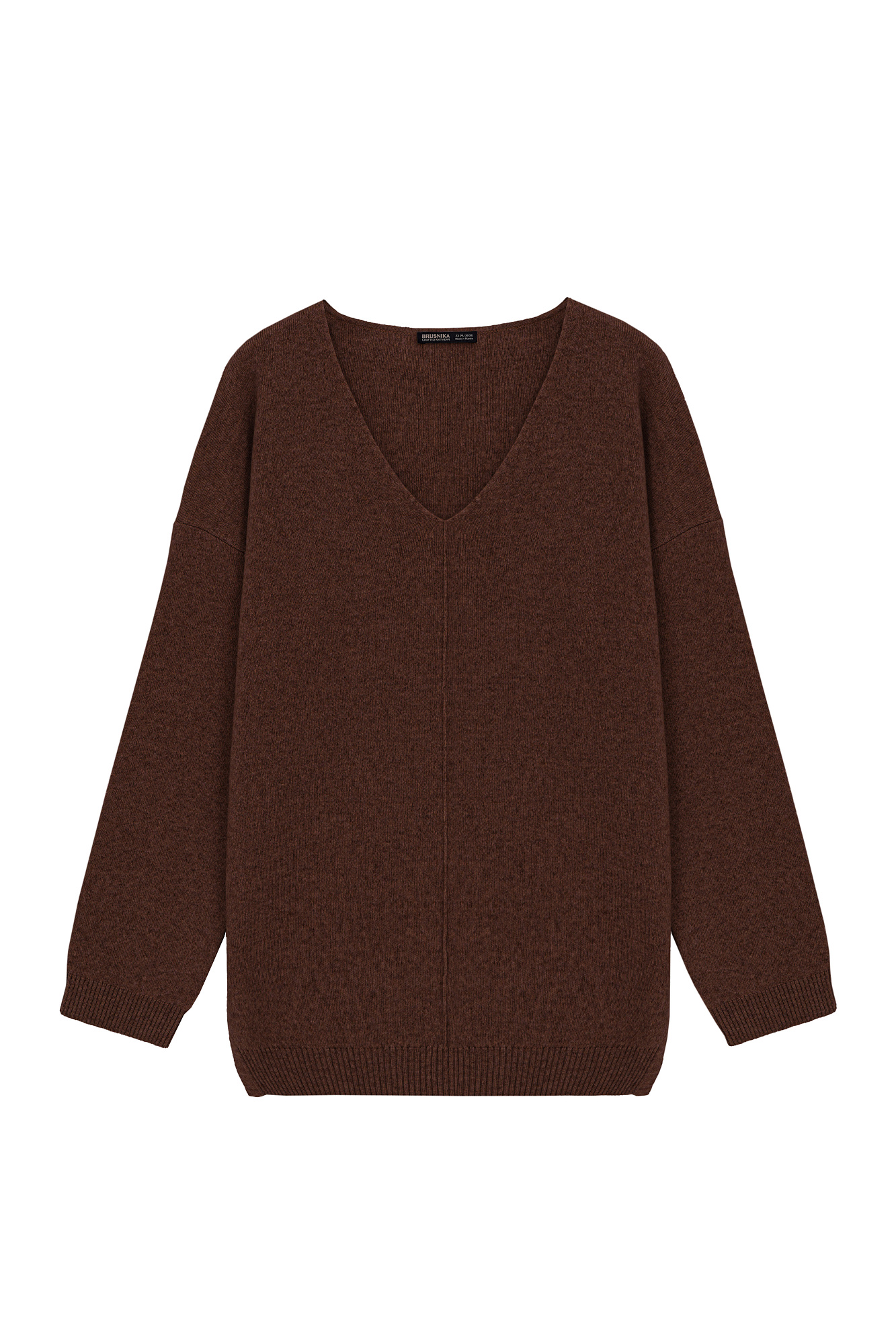 Трикотажный джемпер из смесовой шерсти с добавлением кашемира. V-образный вырез и спущенная линия плеч. Декоративный шов посередине.
