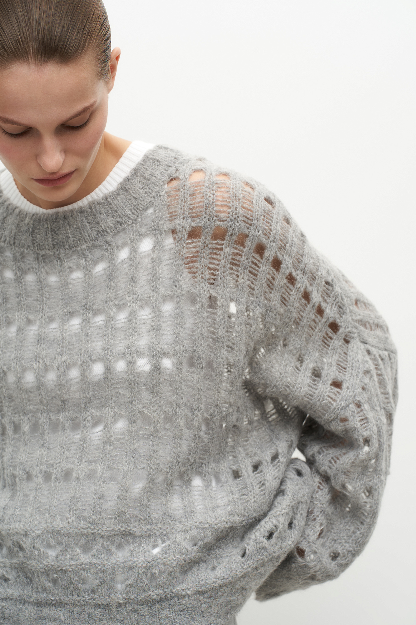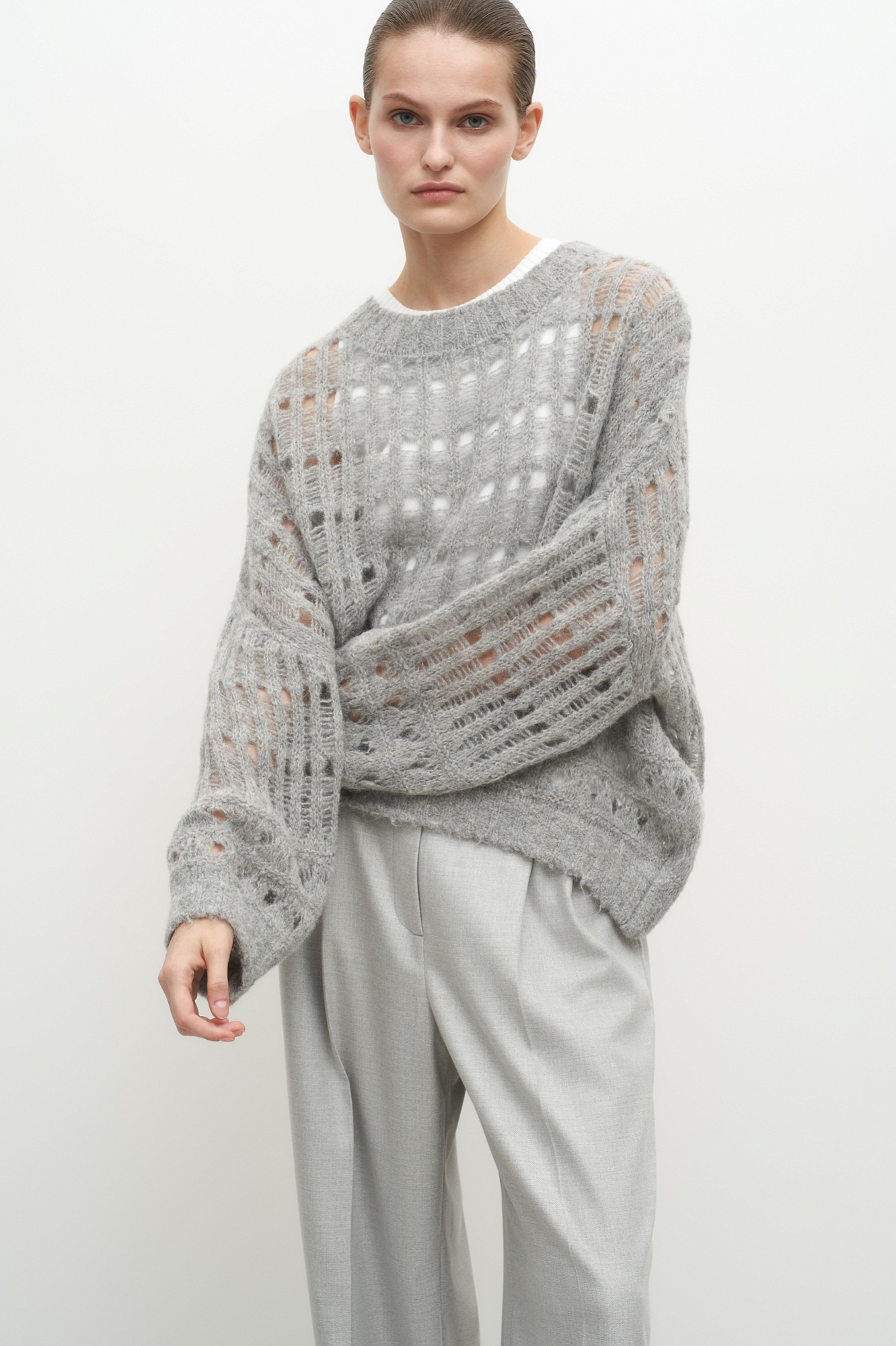 Трикотажный джемпер с шерстью альпака со спущенной линией плеча и круглым вырезом. Модель свободного силуэта, низ изделия и манжеты в рубчик.
