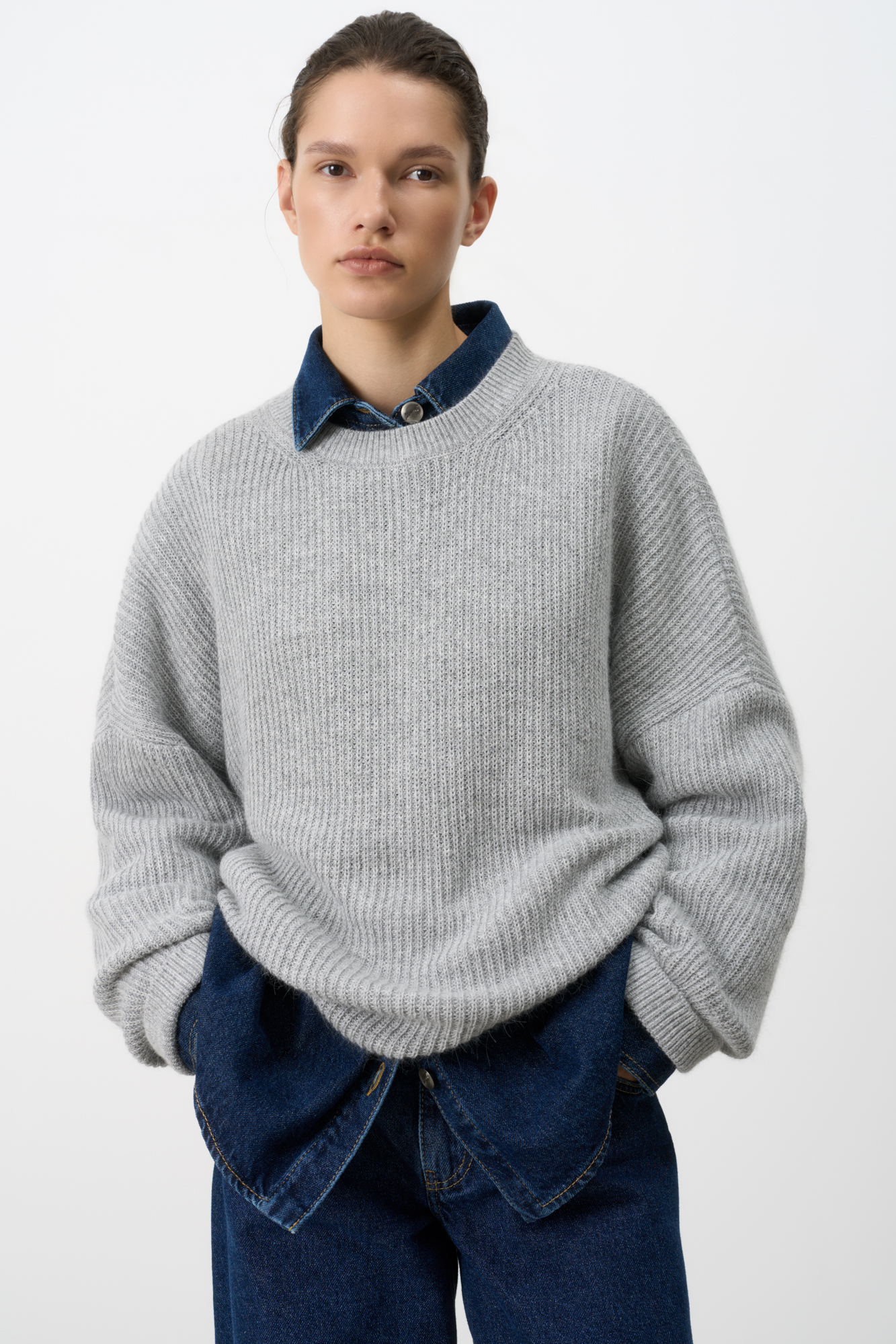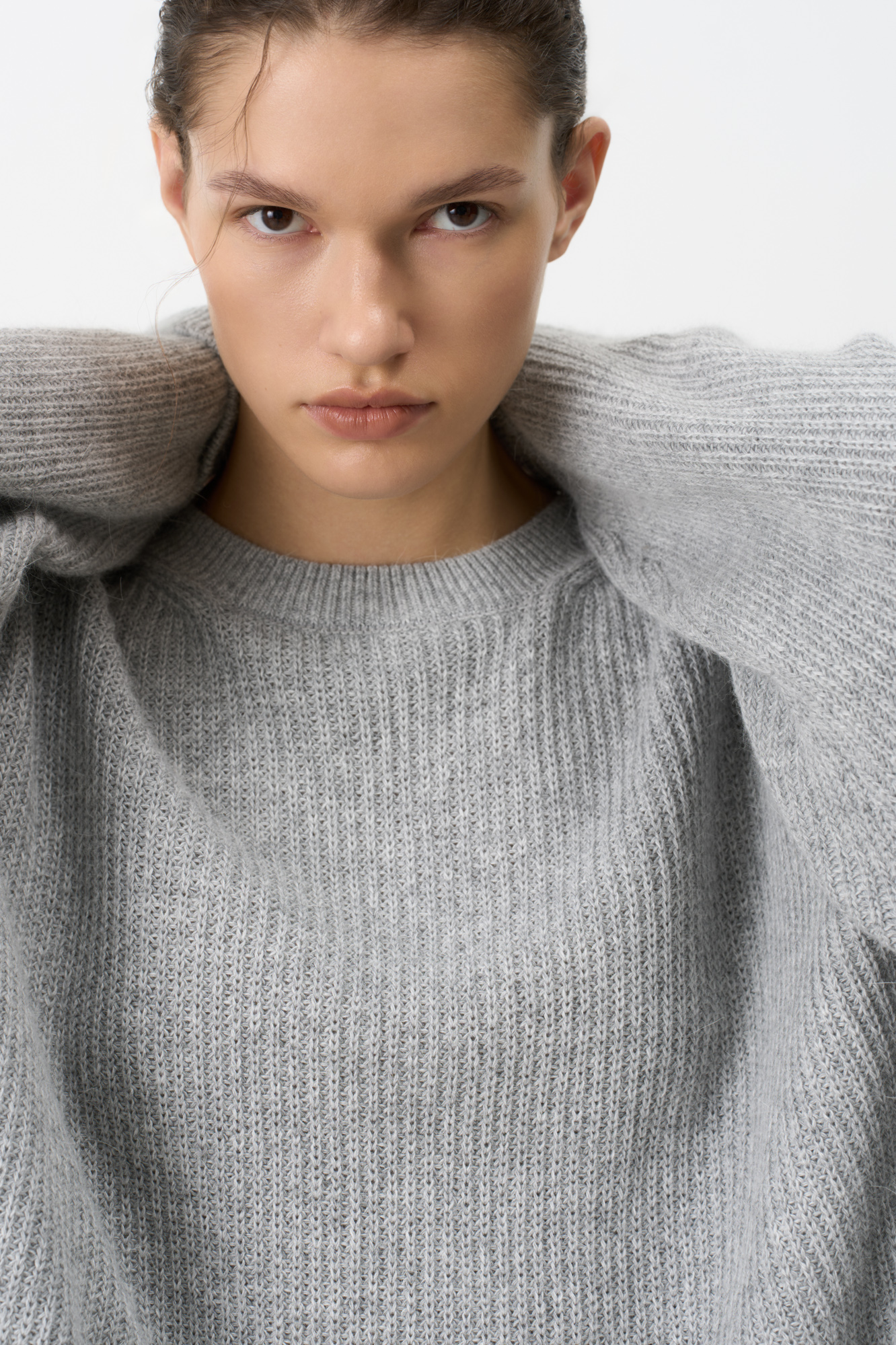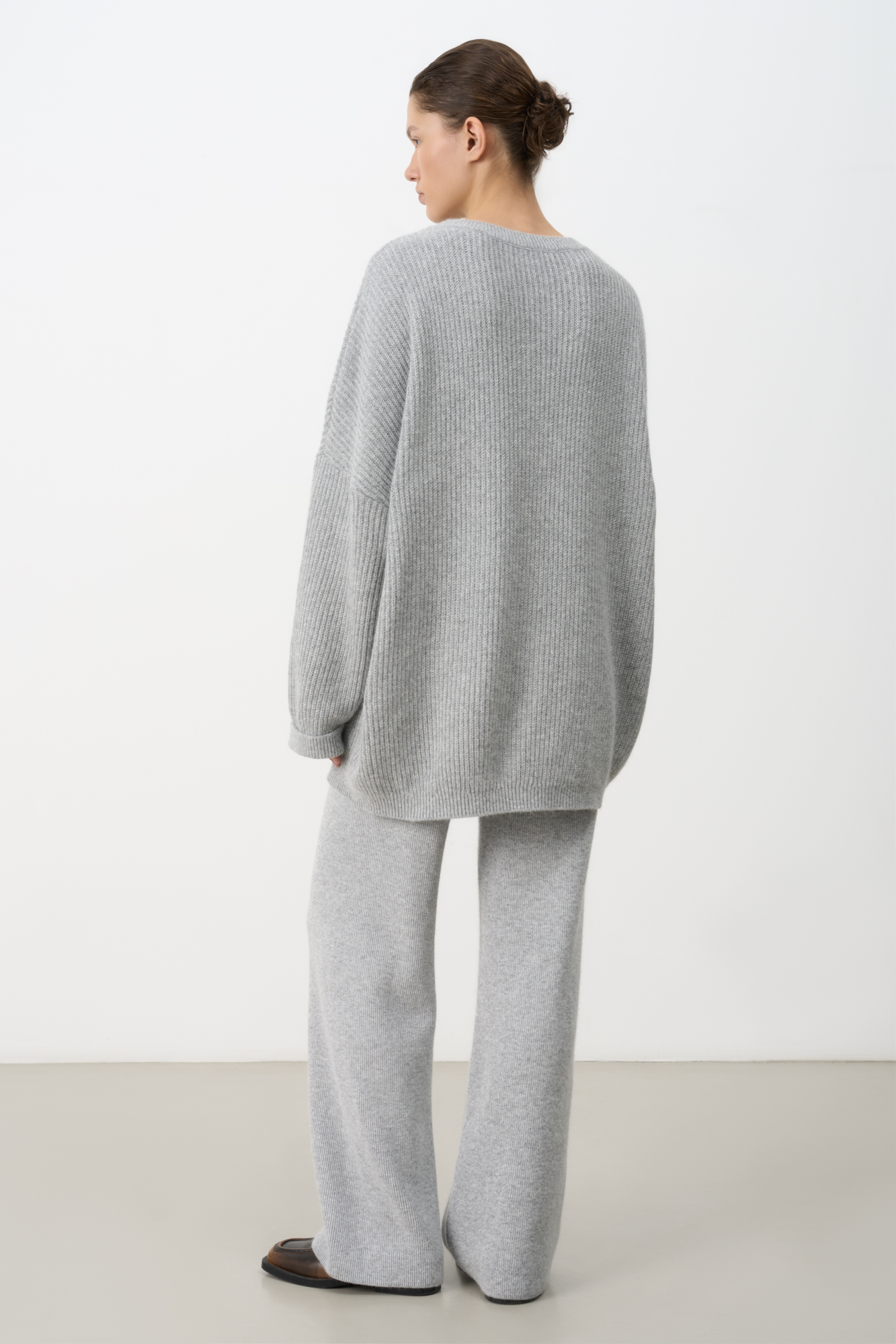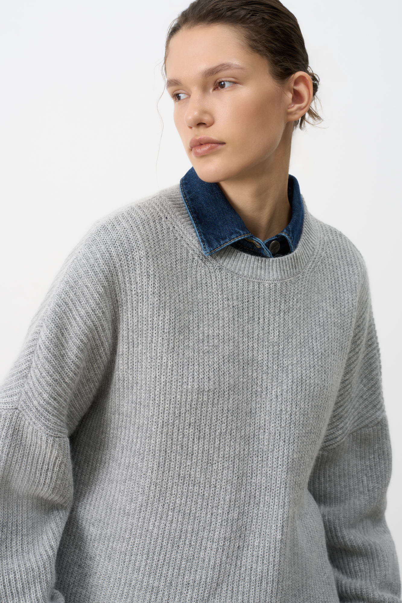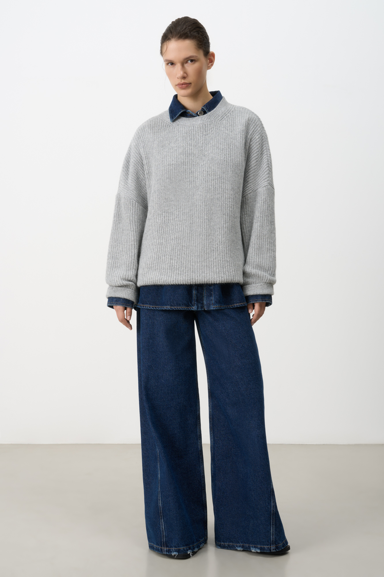 Трикотажный джемпер из смесовой шерсти. Модель свободного силуэта со спущенной линией плеча. Ворот, манжеты рукавов и низ изделия выполнены в рубчик.